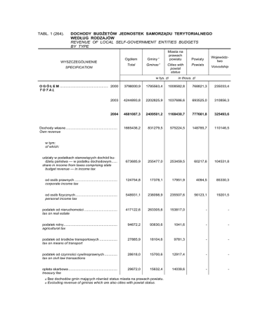 TABL. 1 (264). DOCHODY BUDŻETÓW JEDNOSTEK SAMORZĄDU TERYTORIALNEGO WEDŁUG RODZAJÓW REVENUE OF LOCAL SELF-GOVERNMENT ENTITIES BUDGETS BY TYPE WYSZCZEGÓLNIENIE SPECIFICATION Ogółem Gminy a Total Gminas a Miasta na prawach powiatu Cities with powiat status w tys. zł Województwo Powiaty Powiats Voivodship in thous. zl O G Ó Ł E M ................................................... 2000 TOTAL 3798000,9 1785563,4 1008582,8 768821,3 235033,4 2003 4244893,8 2202825,9 1037686,6 693525,0 310856,3 2004 4681087,3 2409501,2 1168430,7 777661,8 325493,6 Dochody własne..................................................... Own revenue 1665436,2 831279,5 575224,5 148785,7 110146,5 673685,9 255477,0 253459,5 60217,6 104531,8 od osób prawnych ............................................ corporate income tax 124754,8 17378,1 17951,9 4094,5 85330,3 od osób fizycznych........................................... personal income tax 548931,1 238098,9 235507,6 56123,1 19201,5 podatek od nieruchomości .................................. tax on real estate 417122,6 263305,6 153817,0 - - podatek rolny....................................................... agricultural tax 94672,2 93630,6 1041,6 - - podatek od środków transportowych .................. tax on means of transport 27885,9 18104,6 9781,3 - - podatek od czynności cywilnoprawnych ............. tax on civil law transactions 28618,0 15700,6 12917,4 - - opłata skarbowa .................................................. treasury fee 29672,0 15632,4 14039,6 - - w tym: of which: udziały w podatkach stanowiących dochód budżetu państwa — w podatku dochodowym...... share in income from taxes comprising state budget revenue — in income tax a Bez dochodów gmin mających również status miasta na prawach powiatu. a Excluding revenue of gminas which are also cities with powiat status. TABL. 1 (264). DOCHODY BUDŻETÓW JEDNOSTEK SAMORZĄDU TERYTORIALNEGO WEDŁUG RODZAJÓW (dok.) REVENUE OF LOCAL SELF-GOVERNMENT ENTITIES BUDGETS BY TYPE (cont.) WYSZCZEGÓLNIENIE SPECIFICATION Ogółem Gminy a Total Gminas a Miasta na prawach powiatu Cities with powiat status w tys. zł Powiaty Powiats Województwo Voivodship in thous. zl Dochody własne (dok.) Own revenue (cont.) dochody z majątku .............................................. revenue from property 104389,7 52264,8 43289,4 7026,1 1809,4 37335,4 26782,3 7528,2 2749,2 275,7 708920,4 288199,3 163410,9 171586,6 85723,6 z zakresu administracji rządowej ........................ for government administration tasks 490606,9 249615,1 121997,8 69326,2 49667,8 własne ................................................................. for own tasks 205510,3 37832,4 36818,3 101327,3 29532,3 12803,2 751,8 4594,9 933,1 6523,4 Dotacje otrzymane z funduszy celowych ............... Allocations received from appropriated funds 24732,7 16594,5 2119,6 4549,3 1469,3 Pozostałe dotacje ................................................... Other allocations 15516,5 4369,7 1367,0 8958,4 821,4 Subwencje ogólne z budżetu państwa................... General subsidies from the state budget 2197813,1 1211281,5 421605,6 437605,6 127320,4 w tym na zadania oświatowe .................................. of which for educational tasks 1596523,2 842068,3 396726,0 325750,5 31978,4 68668,4 57776,7 4703,1 6176,1 12,5 w tym dochody z wynajmu i dzierżawy oraz innych umów o podobnym charakterze......... of which income from renting and leasing as well as agreements with a similar character Dotacje celowe z budżetu państwa........................ Appropriated allocations from the state budget na zadania: for tasks: realizowane na podstawie porozumień z organami administracji rządowej ............................. realized on the basis of agreements with government administration bodies Środki na dofinansowanie własnych zadań ze źródeł pozabudżetowych..................................... Funds for additional financing of own tasks from non-budgetary sources a Bez dochodów gmin mających również status miasta na prawach powiatu. a Excluding revenue of gminas which are also cities with powiat status.