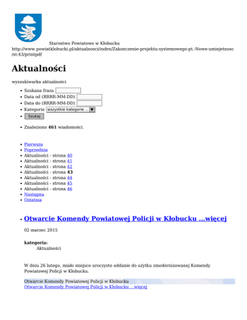 Starostwo Powiatowe w Kłobucku http://www.powiatklobucki.pl/aktualnosci/index/Zakonczenie-projektu-systemowego-pt.-Nowe-umiejetnosc /st:43/printpdf Aktualności wyszukiwarka aktualności Szukana fraza Data od (RRRR-MM-DD) Data do (RRRR-MM-DD) Kategorie wszystkie kategorie ... ▼ Szukaj Znaleziono 461 wiadomości. Pierwsza Poprzednia Aktualności - strona 40 Aktualności - strona 41 Aktualności - strona 42 Aktualności - strona 43 Aktualności - strona 44 Aktualności - strona 45 Aktualności - strona 46 Następna Ostatnia Otwarcie Komendy Powiatowej Policji w Kłobucku ...więcej 02 marzec 2015 kategoria: Aktualności W dniu 26 lutego, miało miejsce uroczyste oddanie do użytku zmodernizowanej Komendy Powiatowej Policji w Kłobucku. Otwarcie Komendy Powiatowej Policji w Kłobucku Otwarcie Komendy Powiatowej Policji w Kłobucku ...więcej V sesja Rady Powiatu w Kłobucku ...więcej 27 luty 2015 kategoria: Aktualności W czwartek 26 lutego, w sali Urzędu Miejskiego w Kłobucku odbyła się V sesja Rady Powiatu. Podczas sesji, na wniosek Starosty Kłobuckiego Henryka Kiepury, w głosowaniu tajnym Rada Powiatu uzupełniła skład Zarządu Powiatu. V sesja Rady Powiatu w Kłobucku V sesja Rady Powiatu w Kłobucku ...więcej PKS Częstochowa uruchomiło nowe połączenie autobusowe w naszym regionie ...więcej 27 luty 2015 kategoria: Aktualności PKS Częstochowa S.A. zaprasza do korzystania z nowej linii komunikacyjnej z Kłobucka do Ostrów n/Okszą przez Łobodno, Miedźno. PKS Częstochowa uruchomiło nowe połączenie aut PKS Częstochowa uruchomiło nowe połączenie autobusowe w naszym regionie ...więcej Powiat Kłobucki pozyskał środki na zadania drogowe ...więcej 24 luty 2015 kategoria: Aktualności W poniedziałek, 23 lutego, z rąk Wojewody Śląskiego Piotra Litwy, Starosta Kłobucki - Henryk Kiepura odebrał promesę w wysokości 2,5 mln zł, na realizację zadania drogowego w naszym powiecie. Powiat Kłobucki pozyskał środki na zadania drog Powiat Kłobucki pozyskał środki na zadania drogowe ...więcej Sukcesy młodych piłkarzy i wychowawcy z Domu Dziecka w Kłobucku ...więcej 23 luty 2015 kategoria: Aktualności Już niedługo, bo 25 kwietnia zostanie rozegrany turniej VI Mistrzostw Polski Dzieci z Domów Dziecka w Piłce Nożnej pn. "Nadzieja na Mundial". Sukcesy młodych piłkarzy i wychowawcy z Domu Dzi Sukcesy młodych piłkarzy i wychowawcy z Domu Dziecka w Kłobucku ...więcej Narada dyrektorów szkół średnich z powiatu w Starostwie Powiatowym ...więcej 23 luty 2015 kategoria: Aktualności W dniu 18 lutego 2015 roku w siedzibie Starostwa przy ul. Skorupki 46, Starosta - Henryk Kiepura oraz Wicestarosta - Maciej Biernacki spotkali się z dyrektorami szkół ponadgimnazjalnych z terenu naszego powiatu. Narada dyrektorów szkół średnich z powiatu w S Narada dyrektorów szkół średnich z powiatu w Starostwie Powiatowym ...więcej V Sesja Rady Powiatu w Kłobucku ...więcej 11 luty 2015 kategoria: Aktualności W dniu 26 lutego 2015 roku o godz. 9:00 w Sali Konferencyjnej Urzędu Miejskiego w Kłobucku przy ul. 11-go Listopada 6 odbędzie się V Sesja Rady Powiatu w Kłobucku. V Sesja Rady Powiatu w Kłobucku V Sesja Rady Powiatu w Kłobucku ...więcej XVIII Zgromadzenie Ogólne Związku Powiatów Polskich ...więcej 10 luty 2015 kategoria: Aktualności W dniu 5 lutego br. w miejscowości Ossa koło Rawy Mazowieckiej odbyło się XVIII Zgromadzenie Ogólne Związku Powiatów Polskich. XVIII Zgromadzenie Ogólne Związku Powiatów Pols XVIII Zgromadzenie Ogólne Związku Powiatów Polskich ...więcej Obchody Dnia Służby Więziennej w naszym powiecie ...więcej 10 luty 2015 kategoria: Aktualności W Ośrodku Szkolenia Służb Więziennych w Kulach, w piątek 6 lutego br., miały miejsce uroczystości związane z obchodami święta Służby Więziennej. Obchody Dnia Służby Więziennej w naszym powieci Obchody Dnia Służby Więziennej w naszym powiecie ...więcej "Tydzień Pomocy Osobom Pokrzywdzonym Przestępstwem" ...więcej 10 luty 2015 kategoria: Aktualności Uprzejmie informujemy, że Ministerstwo Sprawiedliwości organizuje w dniach 23 do 28 lutego 2015 roku "Tydzień Pomocy Osobom Pokrzywdzonym Przestępstwem". Zasadniczym celem tej inicjatywy jest zwrócenie szczególnej uwagi na potrzeby i prawa osób pokrzywdzonych przestępstwem. "Tydzień Pomocy Osobom Pokrzywdzonym Przestępstw "Tydzień Pomocy Osobom Pokrzywdzonym Przestępstwem" ...więcej Pierwsza Poprzednia Aktualności - strona 40 Aktualności - strona 41 Aktualności - strona 42 Aktualności - strona 43 Aktualności - strona 44 Aktualności - strona 45 Aktualności - strona 46 Następna Ostatnia