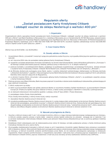 Regulamin oferty „Zostań posiadaczem Karty Kredytowej Citibank i zdobądź voucher do sklepu Nexterio.pl o wartości 400 pln” I. Organizator Organizatorem oferty specjalnej Zostań posiadaczem Karty Kredytowej Citibank i zdobądź voucher do sklepu nexterio.pl o wartości 400 pln („Oferta”) jest Bank Handlowy w Warszawie S.A. z siedzibą w Warszawie, przy ul. Senatorskiej 16, 00-923 Warszawa, zarejestrowany w rejestrze przedsiębiorców Krajowego Rejestru Sądowego przez Sąd Rejonowy dla m.st. Warszawy w Warszawie, XII Wydział Gospodarczy Krajowego Rejestru Sądowego, pod nr KRS 000 000 1538; NIP 526-030-02-91, wysokość kapitału zakładowego wynosi 522.638.400 złotych; kapitał został w pełni opłacony („Bank”). II. Czas trwania Oferty Oferta trwa od 01.07.2016 r. do 30.09.2016 r. III. Zasady udziału w Ofercie 1. Uczestnikiem Oferty („Uczestnik”) może być wyłącznie pełnoletnia osoba izyczna, w przypadku której łącznie spełnione są poniższe warunki: a) od 1 stycznia 2014 roku nie posiadała żadnej głównej Karty Kredytowej Citibank, b) wypełniła i przesłała dedykowany formularz kontaktowy na stronie internetowej Banku: www.citihandlowy.pl/nexterio („Formularz”) do którego została skierowana poprzez reklamę zamieszczoną w Internecie m. in. w sklepie nexterio.pl c) podczas kontaktu z przedstawicielem Banku, podjętego na podstawie wypełnionego i przesłanego Formularza złożyła wniosek o wydanie Karty Kredytowej Citibank: Citibank World MasterCard, Citibank PremierMiles lub Citi Simplicity („Wniosek”). d) do Wniosku dostarczyła wymagany przez Bank, ważny i czytelny dokument potwierdzający deklarowane na Wniosku dochody („Dokument dochodowy”), zgodnie z listą wymaganych przez Bank Dokumentów dochodowych dla poszczególnych form zatrudnienia klientów, która stanowi załącznik do Regulaminu, e) w okresie trwania Oferty otrzymała i aktywowała główną Kartę Kredytową Citibank („Karta”), na podstawie zawartej umowy o Kartę Kredytową Citibank. 2. Podczas procesu weryikacji Wniosku, Bank ma prawo poprosić Uczestnika o dostarczenie dodatkowych dokumentów, potwierdzających jego zdolność kredytową. 3. Z oferty wyłączone są osoby: a) które są pracownikami Banku lub spółek zależnych Banku w rozumieniu Kodeksu Spółek Handlowych, są pracownikami Citibank Europe plc (Publiczna Spółka Akcyjna) Oddział w Polsce, a także osoby pozostające z Bankiem w stosunku cywilnoprawnym, b) ze statusem dewizowym nierezydenta zgodnie z ustawą z dnia 27 lipca 2002 r. Prawo Dewizowe, c) posiadające status Osoby Amerykańskiej. Przez Osobę Amerykańską, o której mowa wyżej, należy rozumieć: 1) obywatela Stanów Zjednoczonych Ameryki lub 2) rezydenta podatkowego Stanów Zjednoczonych Ameryki, tj. osobę mającą stałe zamieszkanie na terytorium Stanów Zjednoczonych Ameryki lub posiadającą ,,pozwolenie na pracę” w Stanach Zjednoczonych Ameryki (tzw. Zieloną Kartę) lub spełniającą tzw. test długotrwałego przebywania na terytorium Stanów Zjednoczonych Ameryki (ang. “substantial presence test”), który zasadniczo dotyczy weryikacji długości pobytu na terytorium Stanów Zjednoczonych Ameryki w okresie ostatnich 3 lat. IV. Warunki przystąpienia do Oferty 1. Voucher, o którym mowa w pkt V ust. 1 otrzymają Uczestnicy, którzy w ciągu miesiąca kalendarzowego następującego po miesiącu, w którym została zawarta umowa o kartę (data zawarcia umowy będzie widoczna na umowie) zalogują się co najmniej 1 raz w serwisie bankowości internetowej Citibank Online pod adresem https://www.citibankonline.pl lub za pomocą aplikacji mobilnej Citi Mobile. 2. Dodatkowo klient zobowiązany jest do dokonywania przez okres 12 miesięcy od daty podpisania umowy o Kartę minimum jedną transakcję miesięcznie przy użyciu Karty. 3. W przypadku niedokonania transakcji o których mowa w ust 2 nagrodzony Uczestnik zapłaci Bankowi karę umowną w wysokości 200 zł (dwieście złotych). Wierzytelność Banku jest wymagalna począwszy od pierwszego dnia miesiąca kalendarzowego następującego po miesiącu, w którym Uczestnik zostanie poinformowany przez Bank, że nie wykonał zobowiązania opisanego w niniejszym regulaminie. Klient zostanie poinformowany o niespełnieniu warunków i naliczeniu kary umownej poprzez wiadomość w serwisie internetowym Citibank Online, poprzez wiadomość e mail lub przez doradcę serwisu bankowości telefonicznej CitiPhone. V. Nagrody 1. Wszyscy Uczestnicy, którzy spełnili warunki, o których mowa w punkcie IV ust 1 otrzymają voucher elektroniczny do sklepu nexterio.pl o wartości 400 pln. Voucher zostanie przesłany poprzez wiadomość w serwisie bankowości internetowej Citibank Online w drugim tygodniu miesiąca, następującym po miesiącu, w którym Uczestnik spełnił warunki oferty. 2. Każdy Uczestnik Oferty może otrzymać maksymalnie jeden voucher. 3. Voucher jest jednorazowy. 4. Vouchery będą przekazywane wyłącznie w postaci określonej w ust. 1 powyżej, bez możliwości wypłaty ich równowartości w gotówce lub zamiany na inną nagrodę rzeczową. Także w przypadku rezygnacji z odbioru vouchera Uczestnik nie otrzyma równowartości tej nagrody w formie pieniężnej. 5. Voucher jest ważny do 30.11.2016 r. VI. Aktywacja vouchera 1. Aby aktywować voucher Uczestnik powinien wpisać numer vouchera w koszyku zakupowym w miejscu ,,Wpisz kod promocyjny:” i aktywować go poprzez kliknięcie przycisku ,,Przelicz”. 2. Minimalna wartość zamówienia potrzebna do aktywacji vouchera wynosi 401,00 zł. Minimalna wartość liczona jest na podstawie ceny brutto towarów i nie obejmuje innych opłat czy kosztów np. dostawy bądź wynikających z dokonanego przez Uczestnika rodzaju płatności. 3. Voucher powinien być zrealizowany w ramach jednego zamówienia, przy czym może to być transakcja dotycząca jednego Towaru lub kilku Towarów, za które dokonana zostanie jed