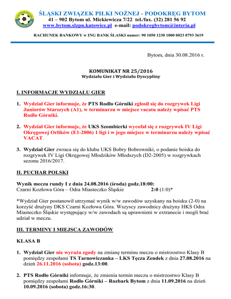 ŚLĄSKI ZWIĄZEK PIŁKI NOŻNEJ - PODOKRĘG BYTOM 41 – 902 Bytom ul. Mickiewicza 7/22 tel./fax. (32) 281 56 92 www.bytom.slzpn.katowice.pl e-mail: [email protected] RACHUNEK BANKOWY w ING BANK ŚLASKI numer: 90 1050 1230 1000 0023 0793 3619 Bytom, dnia 30.08.2016 r. KOMUNIKAT NR 25/2016 Wydziału Gier i Wydziału Dyscypliny I. INFORMACJE WYDZIAŁU GIER 1. Wydział Gier informuje, że PTS Rodło Górniki zgłosił się do rozgrywek Ligi Juniorów Starszych (A1), w terminarzu w miejsce vacatu należy wpisać PTS Rodło Górniki. 2. Wydział Gier informuje, że UKS Szombierki wycofał się z rozgrywek IV Ligi Okręgowej Orlików (E1-2006) 1 ligi i w jego miejsce w terminarzu należy wpisać VACAT. 3. Wydział Gier zwraca się do klubu UKS Bobry Bobrowniki, o podanie boiska do rozgrywek IV Ligi Okręgowej Młodzików Młodszych (D2-2005) w rozgrywkach sezonu 2016/2017. II. PUCHAR POLSKI Wynik meczu rundy I z dnia 24.08.2016 (środa) godz.18:00: Czarni Kozłowa Góra – Odra Miasteczko Śląskie 2:0 (1:0)* *Wydział Gier postanowił utrzymać wynik w/w zawodów uzyskany na boisku (2-0) na korzyść drużyny DKS Czarni Kozłowa Góra. Wszyscy zawodnicy drużyny HKS Odra Miasteczko Śląskie występujący w/w zawodach są uprawnieni w extranecie i mogli brać udział w meczu. III. TERMINY I MIEJSCA ZAWODÓW KLASA B 1. Wydział Gier nie wyraża zgody na zmianę terminu meczu o mistrzostwo Klasy B pomiędzy zespołami TS Tarnowiczanka – LKS Tęcza Zendek z dnia 27.08.2016 na dzień 26.11.2016 (sobota) godz.13:00. 2. PTS Rodło Górniki informuje, że zmienia termin meczu o mistrzostwo Klasy B pomiędzy zespołami Rodło Górniki – Rozbark Bytom z dnia 11.09.2016 na dzień 10.09.2016 (sobota) godz.16:30. LIGA JUNIORÓW STARSZYCH (A1-1998) 1. Wydział Gier wyraża zgodę na zmianę terminu meczu o mistrzostwo Ligi Juniorów Starszych (A1) pomiędzy zespołami Orkan Dąbrówka Wielka – Nitron Krupski Młyn z dnia 11.09.2016 na dzień 21.09.2016 (środa) godz.16:30. Zmiana nastąpiła na wniosek KS Orkan Dąbrówka Wielka i została zaakceptowana przez drużynę przeciwną. 2. Wydział Gier informuje, że mecz o mistrzostwo Ligi Juniorów Starszych (A1) pomiędzy zespołami Czarni Sucha Góra – Tempo Stolarzowice zostanie rozegrany w dniu 08.09.2016 (czwartek) o godz.17:30 z powodu rozgrywania w dniu 07.09.2016 (środa) na tym samym boisku w Suchej Górze meczu o mistrzostwo III Ligi Wojewódzkiej Trampkarzy (C1). 3. Wydział Gier wyraża zgodę na zmianę godziny meczu o mistrzostwo Ligi Juniorów Starszych (A1) pomiędzy zespołami Czarni Kozłowa Góra – Nadzieja Bytom w dniu 04.09.2016 z godz.11:00 na godz.14:00. Mecz zostanie rozegrany na stadionie MOSiR Piekary Śląskie przy ul Olimpijskiej 3. Zmiana nastąpiła na wniosek DKS Czarni Kozłowa Góra i została zaakceptowana przez drużynę przeciwną. 4. TS Tarnowiczanka informuje, że mecze mistrzowskie Ligi Juniorów Starszych (A1) w rundzie jesiennej sezonu 2016/2017, w których jest gospodarzem, będzie rozgrywać na boisku przy ul. Śniadeckiego 1 w Tarnowskich Górach (Park GCR Repty) zgodnie z terminarzem rozgrywek. IV LIGA OKRĘGOWA JUNIORÓW MŁODSZYCH (B1-2000) 1. Wydział Gier wyraża zgodę na zmianę godziny meczu o mistrzostwo IV Ligi Okręgowej Juniorów Młodszych (B1) pomiędzy zespołami Szombierki Bytom – Gwarek Tarnowskie Góry w dniu 04.09.2016 z godz.11:00 na godz.09:00. Zmiana nastąpiła na wniosek TS Szombierki Bytom i została zaakceptowana przez drużynę przeciwną. 2. TS Szombierki Bytom informuje, że zmienia godzinę meczu o mistrzostwo IV Ligi Okręgowej Juniorów Młodszych (B1) pomiędzy zespołami Szombierki Bytom – Przyszłość Nowe Chechło w dniu 18.09.2016 z godz.11:00 na godz.09:00. 3. Wydział Gier wyraża zgodę na zmianę terminu meczu o mistrzostwo IV Ligi Juniorów Młodszych (B1) pomiędzy zespołami UKS Orzeł Miedary – Unia Strzybnica z dnia 18.09.2016 na dzień 17.09.2016 (sobota) godz.11:00. Zmiana nastąpiła na wniosek UKS Unia Strzybnica i została zaakceptowana przez drużynę przeciwną. IV LIGA OKRĘGOWA TRAMPKARZY (C1-2002) 1. KS Nitron Krupski Młyn informuje, że mecz o mistrzostwo IV Ligi Okręgowej Trampkarzy (C1) pomiędzy zespołami Nitron Krupski Młyn – Piast Ożarowice zostanie rozegrany w dniu 10.09.2016 (sobota) o godz.11:00. IV LIGA OKRĘGOWA TRAMPKARZY MŁODSZYCH (C2-2003) 1. TS Tarnowiczanka informuje, że mecze mistrzowskie IV Ligi Okręgowej Trampkarzy Młodszych (C2) w rundzie jesiennej sezonu 2016/2017, w których jest gospodarzem, będzie rozgrywać na boisku przy ul. Śniadeckiego 1 w Tarnowskich Górach (Park GCR Repty) zgodnie z terminarzem rozgrywek. IV LIGA OKRĘGOWA MŁODZIKÓW (D1-2004) 1. Wydział Gier wyraża zgodę na zmianę terminu meczu o mistrzostwo IV Ligi Okręgowej Młodzików (D1) pomiędzy zespołami Piast Ożarowice - Gwarek Tarnowskie Góry z dnia 09.09.2016 na dzień 20.09.2016 (wtorek) godz.17:00. Zmiana nastąpiła na wniosek LKS Piast Ożarowice i została zaakceptowana przez drużynę przeciwną. 2. KTS Polonia Bytom informuje, że mecze mistrzowskie IV Ligi Młodzików(D1) w rundzie jesiennej sezonu 2016/2017, w których jest gospodarzem, będzie rozgrywać na boisku ze „sztuczna nawierzchnia” przy ul. Olimpijskiej 2 w Bytomiu. IV LIGA OKRĘGOWA MŁODZIKÓW MŁODSZYCH (D2-2005) 1 liga 1. UKS Szombierki informuje, że mecze o mistrzostwo IV Ligi Okręgowej Młodzików Młodszych (D2) 2 ligi w rundzie jesiennej sezonu 2016/2017, w których jest gospodarzem, będzie rozgrywać na boisku ze sztuczną nawierzchnią przy ul. F. Modrzewskiego 3w Bytomiu (stadion Szombierek). IV LIGA OKRĘGOWA MŁODZIKÓW MŁODSZYCH (D2-2005) 2 liga 1. KS JSS Silesia Piekary Śląskie informuje, że mecze mistrzowskie IV Ligi Okręgowej Młodzików Młodszych (D2) 2 ligi w rundzie jesiennej sezonu 20162017, w których jest gospodarzem, będzie rozgrywać na stadionie MOSiR w Piekarach Śląskich przy ul. Olimpijskiej 3 zgodnie z terminarzem 