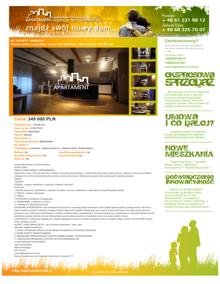Zainteresowany? NR. OFERTY: 108580301 Zielona Góra, Lubuskie / Cena: 349 000 PLN / Mieszkanie: 170.00 m2 Żeby obejrzeć zadzwoń lub wyślij do nas swoje namiary skontaktujemy sie z Tobą. Karwalajtys Marta +48503016515 +48683257007 [email protected] Są sytuacje, w których właściciel nieruchomości musi z różnych przyczyn szybko ją sprzedać. Proponujemy Swoim Klientom specjalny system, który pozwoli na szybkie znalezienie nabywcy. Cena: 349 000 PLN Powierzchnia: 170.00 m2 Cena za m2: 2 053 PLN Typ oferty: Sprzedaż Rynek: Wtórny Ilość pieter: 1 Typ nieruchomości: Mieszkanie Nr. piętra: 1 Lokalizacja: Lubuskie, Zielona Góra m., Zielona Góra, Śródmieście Balkon: nie Kuchnia umeblowana: nie Piwnica: nie Kuchnia wyposażona: nie Kuchnia widna: nie oferta zablokowana w trakcie realizacji NOWA CENA PIĘKNY APARTAMENT W ŚRÓDMIEŚCIU Apartament o pow. 170 mkw (86 mkw w księdze wieczystej własnościowe + użytkowanie wieczyste) znajduje się na 1 piętrze w kamienicy w bliskiej odległości do centrum miasta. Budynek w dobrym stanie technicznym. Mieszkanie posiada dwa wybrukowane miejsca postojowe. UKŁAD POZIOM I POKOIK: z szafą w zabudowie z ciekawym motywem ściennym POZIOM II 1.SALON połączony z KUCHNIĄ: z wyjściem na balkon, kuchnia umeblowana i wyposażona w wysokiej jakości sprzęt 2. POKÓJ: z szafą w zabudowie 3. POKÓJ: 4.SYPIALNIA: z przejściem do garderoby 5. GARDEROBA: z wejściem na strych 6. ŁAZIENKA: z kabiną prysznicową STANDARD WYKOŃCZENIA: całe mieszkanie wykończone z wysokiej jakości materiałów, ściany gładź tapeta ozdobna, podłoga deska, okna PCV., Klata schodowa wyłożona płytkami imitującymi beton, Mieszkanie posiada klimatyzację oraz rolety w oknach dachowych chroniące przed słońcem i gorącem w lecie. Mieszkanie sprzedawane z pełnym umeblowaniem i wyposażeniem. Kuchnia wyposażona i umeblowana w najwyższej jakości sprzęt + dodatkowo posiada lodówkę na wino. Maksymalnie wykorzystana przestrzeń mieszkania: ukryte w ścianach szafki na buty. LOKALIZACJA: mieszkanie znajduje się w bliskiej odległości do centrum miasta,w otoczeniu zieleni, w pobliżu sklepy, market, FOCUS PARK, bardzo cicha i spokojna okolica KOSZTY UTRZYMANIA:330 ZŁ + 60 zł fundusz remontowy + prąd + gaz WALORY NIERUCHOMOŚCI: 1. CICHA I SPOKOJNA OKOLICA Z SZYBKIM DOJAZDEM DO ŚCISŁEGO CENTRUM 2. NISKIE KOSZTY NIERUCHOMOŚCI 3. MIESZKANIE SPRZEDAWANA Z PEŁNYM UMEBLOWANIE I WYPOSAŻENIEM 4. LUKSUSOWE MIESZKANIE GOTOWE DO WPROWADZENIA SIĘ 5. DWA MIEJSCA POSTOJOWE Agent prowadzący: Marta Karwalajtys 503 016 515 [email protected] Zlecenie realizowane pod nadzorem pośrednika nr licencji 1717 http://apartament.net.pl KUPNO KROK PO KROKU WYNAJEM KROK PO KROKU SPRZEDAŻ KROK PO KROKU Piąta Pora Roku > GUMAR Marek Guner > Bachalski Development > Osiedle Mazurskie > AGENCJA APARTAMENT funkcjonuje na polskim rynku nieruchomości od 15 lat! Sprzedaliśmy i wynajęliśmy nieruchomości setkom Klientów, a podobnej liczbie pomogliśmy w kupnie wymarzonej nieruchomości.