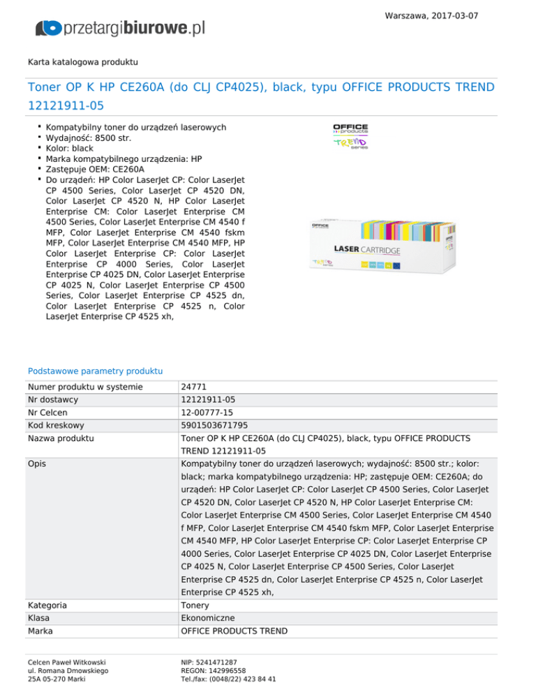 Warszawa, 2017-03-07 Karta katalogowa produktu Toner OP K HP CE260A (do CLJ CP4025), black, typu OFFICE PRODUCTS TREND 12121911-05 Kompatybilny toner do urządzeń laserowych Wydajność: 8500 str. Kolor: black Marka kompatybilnego urządzenia: HP Zastępuje OEM: CE260A Do urządeń: HP Color LaserJet CP: Color LaserJet CP 4500 Series, Color LaserJet CP 4520 DN, Color LaserJet CP 4520 N, HP Color LaserJet Enterprise CM: Color LaserJet Enterprise CM 4500 Series, Color LaserJet Enterprise CM 4540 f MFP, Color LaserJet Enterprise CM 4540 fskm MFP, Color LaserJet Enterprise CM 4540 MFP, HP Color LaserJet Enterprise CP: Color LaserJet Enterprise CP 4000 Series, Color LaserJet Enterprise CP 4025 DN, Color LaserJet Enterprise CP 4025 N, Color LaserJet Enterprise CP 4500 Series, Color LaserJet Enterprise CP 4525 dn, Color LaserJet Enterprise CP 4525 n, Color LaserJet Enterprise CP 4525 xh, Podstawowe parametry produktu Numer produktu w systemie 24771 Nr dostawcy 12121911-05 Nr Celcen 12-00777-15 Kod kreskowy 5901503671795 Nazwa produktu Toner OP K HP CE260A (do CLJ CP4025), black, typu OFFICE PRODUCTS TREND 12121911-05 Opis Kompatybilny toner do urządzeń laserowych; wydajność: 8500 str.; kolor: black; marka kompatybilnego urządzenia: HP; zastępuje OEM: CE260A; do urządeń: HP Color LaserJet CP: Color LaserJet CP 4500 Series, Color LaserJet CP 4520 DN, Color LaserJet CP 4520 N, HP Color LaserJet Enterprise CM: Color LaserJet Enterprise CM 4500 Series, Color LaserJet Enterprise CM 4540 f MFP, Color LaserJet Enterprise CM 4540 fskm MFP, Color LaserJet Enterprise CM 4540 MFP, HP Color LaserJet Enterprise CP: Color LaserJet Enterprise CP 4000 Series, Color LaserJet Enterprise CP 4025 DN, Color LaserJet Enterprise CP 4025 N, Color LaserJet Enterprise CP 4500 Series, Color LaserJet Enterprise CP 4525 dn, Color LaserJet Enterprise CP 4525 n, Color LaserJet Enterprise CP 4525 xh, Kategoria Tonery Klasa Ekonomiczne Marka OFFICE PRODUCTS TREND Celcen Paweł Witkowski ul. Romana Dmowskiego 25A 05-270 Marki NIP: 5241471287 REGON: 142996558 Tel./fax: (0048/22) 423 84 41 Warszawa, 2017-03-07 Kolor Kolor Black Zastosowanie Zastosowanie Do urządzeń laserowych Cecha W ofercie od 2015-07 Produkt HP Typ Kompatybilny Certyfikaty Hit Standard Ilość lat gwarancji 2 Nowy produkt w ofercie Standard Wspólny słownik zamówień CPV 30125110-5 Toner do drukarek laserowych/faksów Jesteśmy przekonani, że z pomocą przetargibiurowe.pl usprawnicie Państwo własne procesy biznesowe związane ze żmudnym poszukiwaniem odpowiadających Państwu produktów oraz opracowaniem specyfikacjii zapytań ofertowych. Serdecznie zapraszamy do wspópracy Zespół, PrzetargiBiurowe.pl Celcen Paweł Witkowski ul. Romana Dmowskiego 25A 05-270 Marki NIP: 5241471287 REGON: 142996558 Tel./fax: (0048/22) 423 84 41