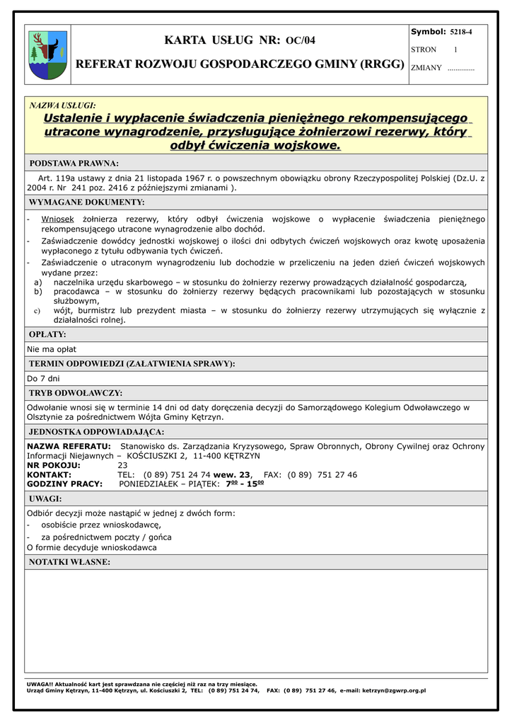 KARTA USŁUG NR: OC/04 REFERAT ROZWOJU GOSPODARCZEGO GMINY (RRGG) Symbol: 5218-4 STRON 1 ZMIANY .............. NAZWA USŁUGI: Ustalenie i wypłacenie świadczenia pieniężnego rekompensującego utracone wynagrodzenie, przysługujące żołnierzowi rezerwy, który odbył ćwiczenia wojskowe. PODSTAWA PRAWNA: Art. 119a ustawy z dnia 21 listopada 1967 r. o powszechnym obowiązku obrony Rzeczypospolitej Polskiej (Dz.U. z 2004 r. Nr 241 poz. 2416 z późniejszymi zmianami ). WYMAGANE DOKUMENTY: Wniosek żołnierza rezerwy, który odbył ćwiczenia wojskowe o wypłacenie świadczenia pieniężnego rekompensującego utracone wynagrodzenie albo dochód. Zaświadczenie dowódcy jednostki wojskowej o ilości dni odbytych ćwiczeń wojskowych oraz kwotę uposażenia wypłaconego z tytułu odbywania tych ćwiczeń. Zaświadczenie o utraconym wynagrodzeniu lub dochodzie w przeliczeniu na jeden dzień ćwiczeń wojskowych wydane przez: a) naczelnika urzędu skarbowego – w stosunku do żołnierzy rezerwy prowadzących działalność gospodarczą, b) pracodawca – w stosunku do żołnierzy rezerwy będących pracownikami lub pozostających w stosunku służbowym, c) wójt, burmistrz lub prezydent miasta – w stosunku do żołnierzy rezerwy utrzymujących się wyłącznie z działalności rolnej. - OPŁATY: Nie ma opłat TERMIN ODPOWIEDZI (ZAŁATWIENIA SPRAWY): Do 7 dni TRYB ODWOŁAWCZY: Odwołanie wnosi się w terminie 14 dni od daty doręczenia decyzji do Samorządowego Kolegium Odwoławczego w Olsztynie za pośrednictwem Wójta Gminy Kętrzyn. JEDNOSTKA ODPOWIADAJĄCA: NAZWA REFERATU: Informacji Niejawnych NR POKOJU: KONTAKT: GODZINY PRACY: Stanowisko ds. Zarządzania Kryzysowego, Spraw Obronnych, Obrony Cywilnej oraz Ochrony – KOŚCIUSZKI 2, 11-400 KĘTRZYN 23 TEL: (0 89) 751 24 74 wew. 23, FAX: (0 89) 751 27 46 PONIEDZIAŁEK – PIĄTEK: 700 - 1500 UWAGI: Odbiór decyzji może nastąpić w jednej z dwóch form: osobiście przez wnioskodawcę, za pośrednictwem poczty / gońca O formie decyduje wnioskodawca NOTATKI WŁASNE: UWAGA!! Aktualność kart jest sprawdzana nie częściej niż raz na trzy miesiące. Urząd Gminy Kętrzyn, 11-400 Kętrzyn, ul. Kościuszki 2, TEL: (0 89) 751 24 74, FAX: (0 89) 751 27 46, e-mail: [email protected]
