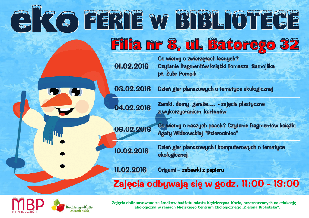 01.02.2016 Co wiemy o zwierzętach leśnych? Czytanie fragmentów książki Tomasza Samojlika pt. Żubr Pompik 03.02.2016 Dzień gier planszowych o tematyce ekologicznej 04.02.2016 Zamki, domy, garaże…. - zajęcia plastyczne z wykorzystaniem kartonów 09.02.2016 Co wiemy o naszych psach? Czytanie fragmentów książki Agaty Widzowskiej ”Psierociniec” 10.02.2016 Dzień gier planszowych i komputerowych o tematyce ekologicznej 11.02.2016 Origami – zabawki z papieru Zajęcia dofinansowane ze środków budżetu miasta Kędzierzyna-Koźla, przeznaczonych na edukację ekologiczną w ramach Miejskiego Centrum Ekologicznego „Zielona Biblioteka”.