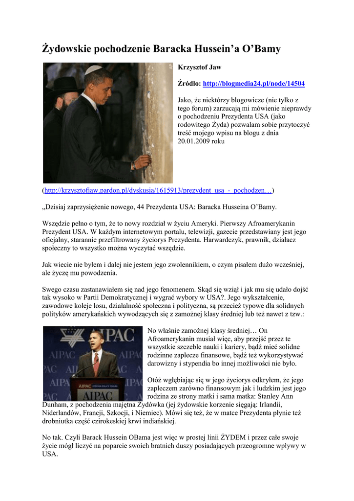 Żydowskie pochodzenie Baracka Hussein’a O’Bamy Krzysztof Jaw Źródło: http://blogmedia24.pl/node/14504 Jako, że niektórzy blogowicze (nie tylko z tego forum) zarzucają mi mówienie nieprawdy o pochodzeniu Prezydenta USA (jako rodowitego Żyda) pozwalam sobie przytoczyć treść mojego wpisu na blogu z dnia 20.01.2009 roku (http://krzysztofjaw.pardon.pl/dyskusja/1615913/prezydent_usa_-_pochodzen…) „Dzisiaj zaprzysiężenie nowego, 44 Prezydenta USA: Baracka Husseina O’Bamy. Wszędzie pełno o tym, że to nowy rozdział w życiu Ameryki. Pierwszy Afroamerykanin Prezydent USA. W każdym internetowym portalu, telewizji, gazecie przedstawiany jest jego oficjalny, starannie przefiltrowany życiorys Prezydenta. Harwardczyk, prawnik, działacz społeczny to wszystko można wyczytać wszędzie. Jak wiecie nie byłem i dalej nie jestem jego zwolennikiem, o czym pisałem dużo wcześniej, ale życzę mu powodzenia. Swego czasu zastanawiałem się nad jego fenomenem. Skąd się wziął i jak mu się udało dojść tak wysoko w Partii Demokratycznej i wygrać wybory w USA?. Jego wykształcenie, zawodowe koleje losu, działalność społeczna i polityczna, są przecież typowe dla solidnych polityków amerykańskich wywodzących się z zamożnej klasy średniej lub też nawet z tzw.: No właśnie zamożnej klasy średniej… On Afroamerykanin musiał więc, aby przejść przez te wszystkie szczeble nauki i kariery, bądź mieć solidne rodzinne zaplecze finansowe, bądź też wykorzystywać darowizny i stypendia bo innej możliwości nie było. Otóż wgłębiając się w jego życiorys odkryłem, że jego zapleczem zarówno finansowym jak i ludzkim jest jego rodzina ze strony matki i sama matka: Stanley Ann Dunham, z pochodzenia majętna Żydówka (jej żydowskie korzenie sięgają: Irlandii, Niderlandów, Francji, Szkocji, i Niemiec). Mówi się też, że w matce Prezydenta płynie też drobniutka część czirokeskiej krwi indiańskiej. No tak. Czyli Barack Hussein OBama jest więc w prostej linii ŻYDEM i przez całe swoje życie mógł liczyć na poparcie swoich bratnich duszy posiadających przeogromne wpływy w USA. I nie rozumiem, dlaczego nigdzie w mediach (no poza mediami żydowskimi przeznaczonymi dla Żydów) o tym się nie mówi?. Czy to jest powód do wstydu, że Obecny Prezydent USA jest jednocześnie Afroamerykaninem i prawowitym po linii matki Żydem? I właśnie ten fakt (i tylko on): pomijania i omamiania ludzi czarnym kolorem skóry Prezydenta, skłonił mnie do napisania niniejszego postu. Dąże do prawdy a nianawidzę zakłamania! Matka Prezydenta – Stanley Ann Dunham była Żydówką i to spowinowaconą z wielkimi żydowskimi rodzinami. Jej rodzice: Madelyn Payne i Stanley Armour Dunham byli obydwoje Żydami a poprzez swojego ojca matka Baracka Husseina Obamy (tym samym sam Prezydent) była spowinowacona rodzinnie m.in.z: Żydem i b. Prezydentem Harry’m Trumanem; Żydem i b. Wiceprezydentem Dickiem Cheneyem; Żydem i bardzo zamożnym brytyjskim bankierem Gustavem Anthony de Rothschildem (w prostej linii związanym bezpośrednio rodzinnie z Nathanem Mayerem Rothschildem współtwórcą finansowej potęgi Żydów niemieckich Rothscildów) i Żydem premierem Wielkiej Brytanii Winstonem Churchillem (jego matka Janette Jerome była Żydówka i córka amerykańskiego finansisty). http://en.wikipedia.org/wiki/Barack_Obama_Sr http://en.wikipedia.org/wiki/Ann_Dunham http://en.wikipedia.org/wiki/Madelyn_Payne http://en.wikipedia.org/wiki/Stanley_Armour_D… Ostatnio nawet pojawiły się informacje (L’Osservatore Romano), że jednym z przodków mamy Prezydenta był polski Żyd: Jakub Izaak z Przysuchy. (na konferencji prasowej temu poświęconej B. Obama pojawił się w ortodoksyjnym stroju chasydzkim i nie odpowiedział na żadne pytanie dotyczące jego żydowskiego pochodzenia). Natomiast ja nie znalazłem nigdzie takich śladów, ale nie jestem historykiem – więc, kto wie? Reasumując: TAK, po linii matki B.H. O’Bama (mimo, ze po ojcu murzynie jest mulatem) zgodnie z judaizmem jest Żydem. I to spowinowaconym z wielkim światem syjonistycznej polityki oraz finansjery. Tak, więc nie dziwmy się, że Prezydent otacza się ludźmi z dawnego otoczenia (administracji) Billa Clintona, która to w przeszło 80% składała się wyłącznie z Żydów. I w tym miejscu pojawiaja się wątpliwości o etyczność wykorzystywania swojego koloru skóry w kampanii prezydenckiej. Amerykanie potrzebowali zmiany po rządach nieudacznika i głupca (jak określił to Olvier Stone) G. Buscha juniora. Potrzebowali też nowej jakości: tą nowa jakość dawali Demokraci. I to w dwóch wymiarach: 1) Pierwsza Kobieta Prezydent USA, 2) Pierwszy Afroamerykanin Prezydent USA. Cała walka pomiędzy Obamą a H. Clinton była po prostu jednym wielkim spektaklem marketingowym stworzonym i zrealizowanym dla, w większości raczej mało rozgarniętych intelektualnie, Amerykanów. Elita wiedziała swoje: niezależnie, kto wygra i tak będziemy u władzy (jakby wygrała Clinton to zapewne B. Obama zajmowałby się polityką zagraniczną oj hipokryzja). Uzyskano jeszcze dodatkowy efekt tej niby kłótni: Partia Demokratyczna jak nigdy dotąd pozyskała i zaktywizowała ogromne raczej do tej pory mało angażujące się w wybory – elektoraty Afroamerykanów i amerykańskich kobiet. Niestety elity zdominowane są w większości przez Amerykanów pochodzenia żydowskiego. Przeciętny Afroamerykanin jest naprawdę (niczego nie ujmując, a zresztą z własnej winy) mało inteligentny (nawet infantylny). Zresztą wśród białych jest podobnie. A kampania B. Obamy była perfekcyjna. Kobiety widziały w nim drugiego Kennedyego a Murzyni swojego kompana z ulicy. Ciekawe jakby głosowali wiedząc, że jest to jeszcze jeden z tych bogatych dupków spowinowacony dodatkowo z bogatymi żydowskimi białasami? Ale! – przecież powiedzą niektórzy – B. Obama ma piękną żonę Murzynkę i fajniusie czarn