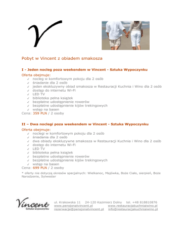 Pobyt w Vincent z obiadem smakosza I - Jeden nocleg poza weekendem w Vincent - Sztuka Wypoczynku Oferta obejmuje: ✔ nocleg w komfortowym pokoju dla 2 osób ✔ śniadanie dla 2 osób ✔ jeden ekskluzywny obiad smakosza w Restauracji Kuchnia i Wino dla 2 osób ✔ dostęp do internetu Wi-Fi ✔ LED TV ✔ biblioteka pełna książek ✔ bezpłatne udostępnienie rowerów ✔ bezpłatne udostępnienie kijów trekingowych ✔ wstęp na basen Cena: 359 PLN / 2 osoby II – Dwa noclegi poza weekendem w Vincent - Sztuka Wypoczynku Oferta obejmuje: ✔ noclegi w komfortowym pokoju dla 2 osób ✔ śniadania dla 2 osób ✔ dwa obiady ekskluzywne smakosza w Restauracji Kuchnia i Wino dla 2 osób ✔ dostęp do internetu Wi-Fi ✔ LED TV ✔ biblioteka pełna książek ✔ bezpłatne udostępnienie rowerów ✔ bezpłatne udostępnienie kijów trekingowych ✔ wstęp na basen Cena: 699 PLN / 2 osoby * oferty nie dotyczą okresów specjalnych: Wielkanoc, Majówka, Boże Ciało, sierpień, Boże Narodzenie, Sylwester ul. Krakowska 11 24-120 Kazimierz Dolny tel. +48 818810876 www.restauracjakuchniaiwino.pl www.pensjonatvincent.pl [email protected] [email protected]