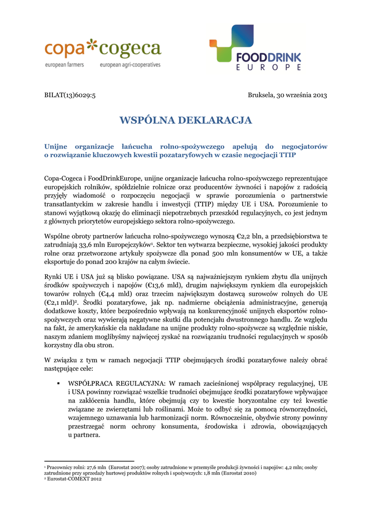 BILAT(13)6029:5 Bruksela, 30 września 2013 WSPÓLNA DEKLARACJA Unijne organizacje łańcucha rolno-spożywczego apelują do negocjatorów o rozwiązanie kluczowych kwestii pozataryfowych w czasie negocjacji TTIP Copa-Cogeca i FoodDrinkEurope, unijne organizacje łańcucha rolno-spożywczego reprezentujące europejskich rolników, spółdzielnie rolnicze oraz producentów żywności i napojów z radością przyjęły wiadomość o rozpoczęciu negocjacji w sprawie porozumienia o partnerstwie transatlantyckim w zakresie handlu i inwestycji (TTIP) między UE i USA. Porozumienie to stanowi wyjątkową okazję do eliminacji niepotrzebnych przeszkód regulacyjnych, co jest jednym z głównych priorytetów europejskiego sektora rolno-spożywczego. Wspólne obroty partnerów łańcucha rolno-spożywczego wynoszą €2,2 bln, a przedsiębiorstwa te zatrudniają 33,6 mln Europejczyków1. Sektor ten wytwarza bezpieczne, wysokiej jakości produkty rolne oraz przetworzone artykuły spożywcze dla ponad 500 mln konsumentów w UE, a także eksportuje do ponad 200 krajów na całym świecie. Rynki UE i USA już są blisko powiązane. USA są najważniejszym rynkiem zbytu dla unijnych środków spożywczych i napojów (€13,6 mld), drugim największym rynkiem dla europejskich towarów rolnych (€4,4 mld) oraz trzecim największym dostawcą surowców rolnych do UE (€2,1 mld)2. Środki pozataryfowe, jak np. nadmierne obciążenia administracyjne, generują dodatkowe koszty, które bezpośrednio wpływają na konkurencyjność unijnych eksportów rolnospożywczych oraz wywierają negatywne skutki dla potencjału dwustronnego handlu. Ze względu na fakt, że amerykańskie cła nakładane na unijne produkty rolno-spożywcze są względnie niskie, naszym zdaniem moglibyśmy najwięcej zyskać na rozwiązaniu trudności regulacyjnych w sposób korzystny dla obu stron. W związku z tym w ramach negocjacji TTIP obejmujących środki pozataryfowe należy obrać następujące cele: WSPÓŁPRACA REGULACYJNA: W ramach zacieśnionej współpracy regulacyjnej, UE i USA powinny rozwiązać wszelkie trudności obejmujące środki pozataryfowe wpływające na zakłócenia handlu, które obejmują czy to kwestie horyzontalne czy też kwestie związane ze zwierzętami lub roślinami. Może to odbyć się za pomocą równorzędności, wzajemnego uznawania lub harmonizacji norm. Równocześnie, obydwie strony powinny przestrzegać norm ochrony konsumenta, środowiska i zdrowia, obowiązujących u partnera. Pracownicy rolni: 27,6 mln (Eurostat 2007); osoby zatrudnione w przemyśle produkcji żywności i napojów: 4,2 mln; osoby zatrudnione przy sprzedaży hurtowej produktów rolnych i spożywczych: 1,8 mln (Eurostat 2010) 2 Eurostat-COMEXT 2012 1 NORMY MIĘDZYNARODOWE: Mimo iż unijni eksporterzy żywności przestrzegają norm międzynarodowych, często borykają się z nadmiernymi kontrolami przeprowadzanymi w USA i kosztownymi procedurami. Uznawanie opartych na dowodach naukowych norm międzynarodowych może być korzystne dla obydwu stron w kontekście handlu. SPÓJNOŚĆ REGULACJI: Negocjacje powinny również objąć obawy unijnych eksporterów żywności związane z różnicami w przepisach federalnych i stanowych w USA. Głównym celem powinno być tu uproszczenie ogólnych ram prawnych poprzez dostosowanie przepisów w poszczególnych stanach USA. UŁATWIENIE HANDLU: Udostępnianie jasnych i dokładnych informacji na temat procedur celnych, tranzytu, inspekcji przedwysyłkowych, agencji celnych i kosztów Apostille stanowi podstawę do ułatwienia wydajniejszego i tańszego przepływu towarów. HANDEL TRÓJSTRONNY: UE i USA powinny wspólnie opracować skuteczne mechanizmy zapobiegania handlowi trójstronnemu. NOWE BARIERY: Należy zrobić wszystko, aby wraz z wejściem w życie US Food Safety Modernization Act (Ustawy o Modernizacji Bezpieczeństwa Żywności) lub z innych powodów nie pojawiły się nowe bariery regulacyjne. W załączniku znajduje się złożony dokument techniczny zawierające listę środków pozataryfowych stosowanych w USA, które niepokoją unijnych eksporterów produktów rolnospożywczych. W dokumencie tym można znaleźć również zalecenia dla negocjatorów. Nasze sektory opowiadają się za przeprowadzeniem wyczerpujących negocjacji i apelują do negocjatorów o osiągnięcie porozumienia zawierającego rozwiązania dla środków pozataryfowych i praktyczne sposoby na zwiększenie spójności systemów regulacyjnych UE i USA, równocześnie umożliwiając przestrzeganie norm zdrowia i bezpieczeństwa stosowanych przez obie strony. Porozumienie to będzie rozwiązaniem korzystnym dla każdego jedynie jeśli obejmie ono nawet najbardziej złożone kwestie regulacyjne, które zostaną rozwiązane w sposób satysfakcjonujący małe, średnie i duże przedsiębiorstwa. Nawołujemy do negocjatorów, aby skupili się na treści porozumienia a nie tempie jego zawarcia. Unijni partnerzy z łańcucha rolno-spożywczego cieszą się na współpracę z władzami UE i USA w miarę postępów negocjacji TTIP. *** Copa-Cogeca to zjednoczony głos rolników i ich spółdzielni w UE. Wspólnie, zapewniają stabilność, innowacyjność i konkurencyjność rolnictwa europejskiego, gwarantując bezpieczeństwo żywnościowe 500 milionom osób w Europie. Copa reprezentuje ponad 13 milionów rolników i ich rodzin, podczas gdy Cogeca reprezentuje interesy 38 000 spółdzielni rolniczych. Razem Copa-Cogeca reprezentuje 70 organizacji z państw członkowskich UE. W celu uzyskania dodatkowych informacji na temat działalności Copa-Cogeca proszę udać się na stronę: http://www.copa-cogeca.eu. Misją FoodDrinkEurope jest reprezentowanie przemysłu produkcji żywności i napojów w UE największego sektora produkcji w UE pod względem obrotów, zatrudnienia i wartości dodanej. FoodDrinkEurope współpracuje z europejskimi i międzynarodowymi instytucjami, gdyż chce brać aktywny udział w rozwoju ram pr