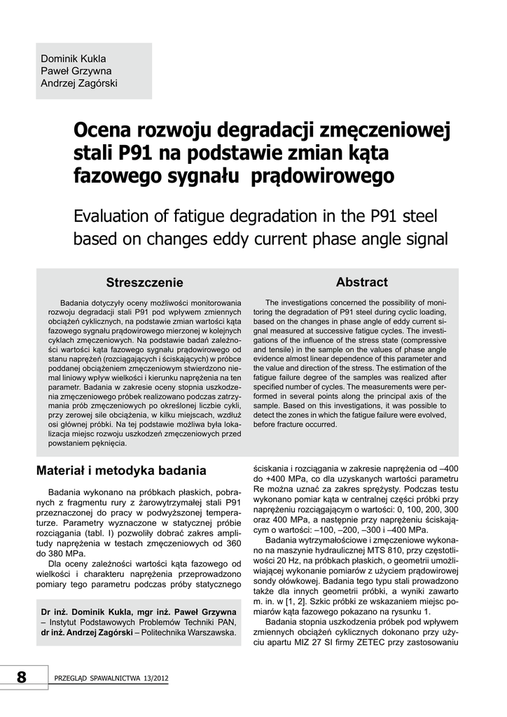 Dominik Kukla Paweł Grzywna Andrzej Zagórski Ocena rozwoju degradacji zmęczeniowej stali P91 na podstawie zmian kąta fazowego sygnału prądowirowego evaluation of fatigue degradation in the P91 steel based on changes eddy current phase angle signal Streszczenie Badania dotyczyły oceny możliwości monitorowania rozwoju degradacji stali P91 pod wpływem zmiennych obciążeń cyklicznych, na podstawie zmian wartości kąta fazowego sygnału prądowirowego mierzonej w kolejnych cyklach zmęczeniowych. na podstawie badań zależności wartości kąta fazowego sygnału prądowirowego od stanu naprężeń (rozciągających i ściskających) w próbce poddanej obciążeniem zmęczeniowym stwierdzono niemal liniowy wpływ wielkości i kierunku naprężenia na ten parametr. Badania w zakresie oceny stopnia uszkodzenia zmęczeniowego próbek realizowano podczas zatrzymania prób zmęczeniowych po określonej liczbie cykli, przy zerowej sile obciążenia, w kilku miejscach, wzdłuż osi głównej próbki. na tej podstawie możliwa była lokalizacja miejsc rozwoju uszkodzeń zmęczeniowych przed powstaniem pęknięcia. Materiał i metodyka badania Badania wykonano na próbkach płaskich, pobranych z fragmentu rury z żarowytrzymałej stali P91 przeznaczonej do pracy w podwyższonej temperaturze. Parametry wyznaczone w statycznej próbie rozciągania (tabl. I) pozwoliły dobrać zakres amplitudy naprężenia w testach zmęczeniowych od 360 do 380 mPa. Dla oceny zależności wartości kąta fazowego od wielkości i charakteru naprężenia przeprowadzono pomiary tego parametru podczas próby statycznego Dr inż. Dominik Kukla, mgr inż. Paweł Grzywna – Instytut Podstawowych Problemów Techniki PAn, dr inż. andrzej Zagórski – Politechnika Warszawska. 8 Przegląd sPawalnictwa 13/2012 abstract The investigations concerned the possibility of monitoring the degradation of P91 steel during cyclic loading, based on the changes in phase angle of eddy current signal measured at successive fatigue cycles. The investigations of the influence of the stress state (compressive and tensile) in the sample on the values of phase angle evidence almost linear dependence of this parameter and the value and direction of the stress. The estimation of the fatigue failure degree of the samples was realized after specified number of cycles. The measurements were performed in several points along the principal axis of the sample. Based on this investigations, it was possible to detect the zones in which the fatigue failure were evolved, before fracture occurred. ściskania i rozciągania w zakresie naprężenia od –400 do +400 mPa, co dla uzyskanych wartości parametru Re można uznać za zakres sprężysty. Podczas testu wykonano pomiar kąta w centralnej części próbki przy naprężeniu rozciągającym o wartości: 0, 100, 200, 300 oraz 400 mPa, a następnie przy naprężeniu ściskającym o wartości: –100, –200, –300 i –400 mPa. Badania wytrzymałościowe i zmęczeniowe wykonano na maszynie hydraulicznej mTS 810, przy częstotliwości 20 Hz, na próbkach płaskich, o geometrii umożliwiającej wykonanie pomiarów z użyciem prądowirowej sondy ołówkowej. Badania tego typu stali prowadzono także dla innych geometrii próbki, a wyniki zawarto m. in. w [1, 2]. Szkic próbki ze wskazaniem miejsc pomiarów kąta fazowego pokazano na rysunku 1. Badania stopnia uszkodzenia próbek pod wpływem zmiennych obciążeń cyklicznych dokonano przy użyciu apartu mIZ 27 SI firmy ZETEC przy zastosowaniu tablica I. Parametry wytrzymałościowe badanej stali P91 oraz według Pn-En 10216-2:2004 table I. mechanical properties of tested P91 steel and acc. to Pn-En 10216-2:2004 Parametry Rm, mPa Re, mPa A, % P91 materiał badany Wg Pn: 10216-2:2004 662 630÷830 497 > 450 25 17÷19 Rys. 1. Szkic próbki ze wskazaniem miejsc pomiaru kąta fazowego Fig. 1. Scheme of specimen with marked location of phase angle measurements Rys. 2. metodyka pomiaru kąta fazowego z zastosowaniem liniowej aproksymacji stycznej do krzywej oddalenia Fig. 2. method of phase angle measurement with the use of linear approximation of the tangent to the curve distance sondy o zakresie częstotliwości od 500 kHz do 1 mHz. Procedura pomiaru kąta fazowego realizowana była z wykorzystaniem oprogramowania dostępnego w aparacie mIZ 27 SI (rys. 2) i sprowadzała się do pomiaru kąta nachylenia linii stycznej do krzywej oddalenia (lift off) dla materiału próbki w miejscach wyznaczonych do pomiaru, zgodnie ze schematem na rysunku 1. Spośród innych metod pomiaru zmian parametrów prądowirowych testowanych przez autorów [3] ta wydaje się najbardziej powtarzalna i precyzyjna. Pomiary realizowano na próbkach zamontowanych w szczękach maszyny wytrzymałościowej, przy zerowej sile obciążenia, najpierw przed testem zmęczeniowym (w celu uzyskania sygnału referencyjnego), a następnie podczas kolejnych zatrzymań testu po określonej liczbie cykli, dobranej w zależności od amplitudy naprężenia. Wybór lokalizacji punktów pomiaru kąta i ich liczba wynikały z tendencji do pękania próbek zarówno w środku części pomiarowej, jak i w obszarze redukcji przekroju, zarówno w dolnej, jak i górnej części. Ponadto z uwagi na powierzchniowy charakter pomiaru metodą prądów wirowych wykonano je po obu stronach próbki. Taka procedura pomiarów pozwala na identyfikację i lokalizację uszkodzenia zmęczeniowego we wczesnym etapie jego rozwoju, poprzedzającym dynamiczny wzrost odkształcenia, a także umożliwia monitorowanie jego rozwoju na podstawie dynamiki zmian wartości kąta fazowego. Wyniki badań na podstawie pomiarów kąta fazowego próbki ze stali P91 pod obciążeniem rozciągającym i ściskającym o wartości od –400 do 400 mPa stwierdzono niemal liniową zależność tego parametru od wielkości i kierunku naprężenia, co obrazuje wykres na rysunku 3. na wykresie tym przedstawiono uśrednione wyniki pomiarów z obu stron p