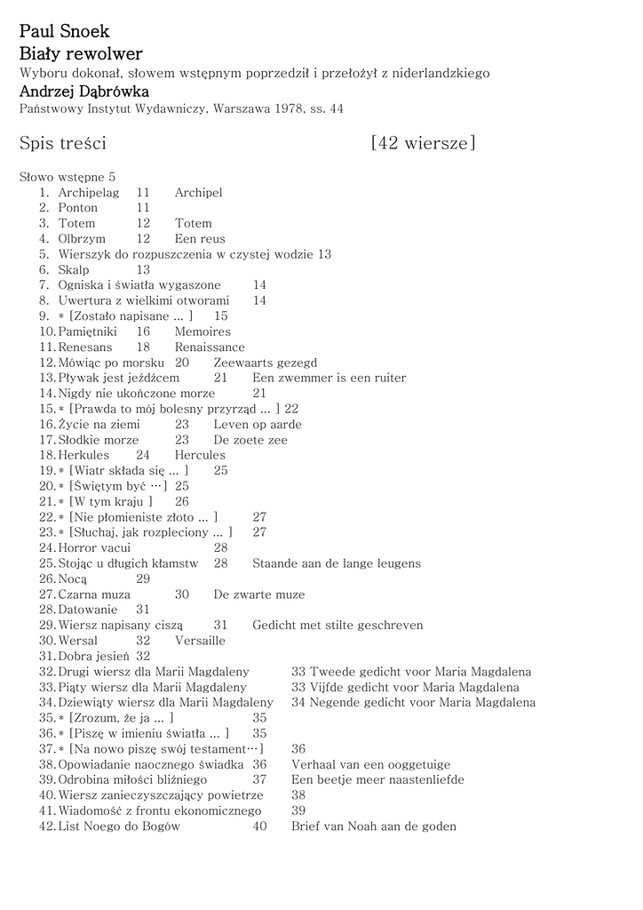 Paul Snoek Biały rewolwer Wyboru dokonał, słowem wstępnym poprzedził i przełożył z niderlandzkiego Andrzej Dąbrówka Państwowy Instytut Wydawniczy, Warszawa 1978, ss. 44 Spis treści [42 wiersze] Słowo wstępne 5 1. Archipelag 11 Archipel 2. Ponton 11 3. Totem 12 Totem 4. Olbrzym 12 Een reus 5. Wierszyk do rozpuszczenia w czystej wodzie 13 6. Skalp 13 7. Ogniska i światła wygaszone 14 8. Uwertura z wielkimi otworami 14 9. * [Zostało napisane ... ] 15 10. Pamiętniki 16 Memoires 11. Renesans 18 Renaissance 12. Mówiąc po morsku 20 Zeewaarts gezegd 13. Pływak jest jeźdźcem 21 Een zwemmer is een ruiter 14. Nigdy nie ukończone morze 21 15. * [Prawda to mój bolesny przyrząd ... ] 22 16. Życie na ziemi 23 Leven op aarde 17. Słodkie morze 23 De zoete zee 18. Herkules 24 Hercules 19. * [Wiatr składa się ... ] 25 20. * [Świętym być …] 25 21. * [W tym kraju ] 26 22. * [Nie płomieniste złoto ... ] 27 23. * [Słuchaj, jak rozpleciony ... ] 27 24. Horror vacui 28 25. Stojąc u długich kłamstw 28 Staande aan de lange leugens 26. Nocą 29 27. Czarna muza 30 De zwarte muze 28. Datowanie 31 29. Wiersz napisany ciszą 31 Gedicht met stilte geschreven 30. Wersal 32 Versaille 31. Dobra jesień 32 32. Drugi wiersz dla Marii Magdaleny 33 Tweede gedicht voor Maria Magdalena 33. Piąty wiersz dla Marii Magdaleny 33 Vijfde gedicht voor Maria Magdalena 34. Dziewiąty wiersz dla Marii Magdaleny 34 Negende gedicht voor Maria Magdalena 35. * [Zrozum, że ja ... ] 35 36. * [Piszę w imieniu światła ... ] 35 37. * [Na nowo piszę swój testament…] 36 38. Opowiadanie naocznego świadka 36 Verhaal van een ooggetuige 39. Odrobina miłości bliźniego 37 Een beetje meer naastenliefde 40. Wiersz zanieczyszczający powietrze 38 41. Wiadomość z frontu ekonomicznego 39 42. List Noego do Bogów 40 Brief van Noah aan de goden