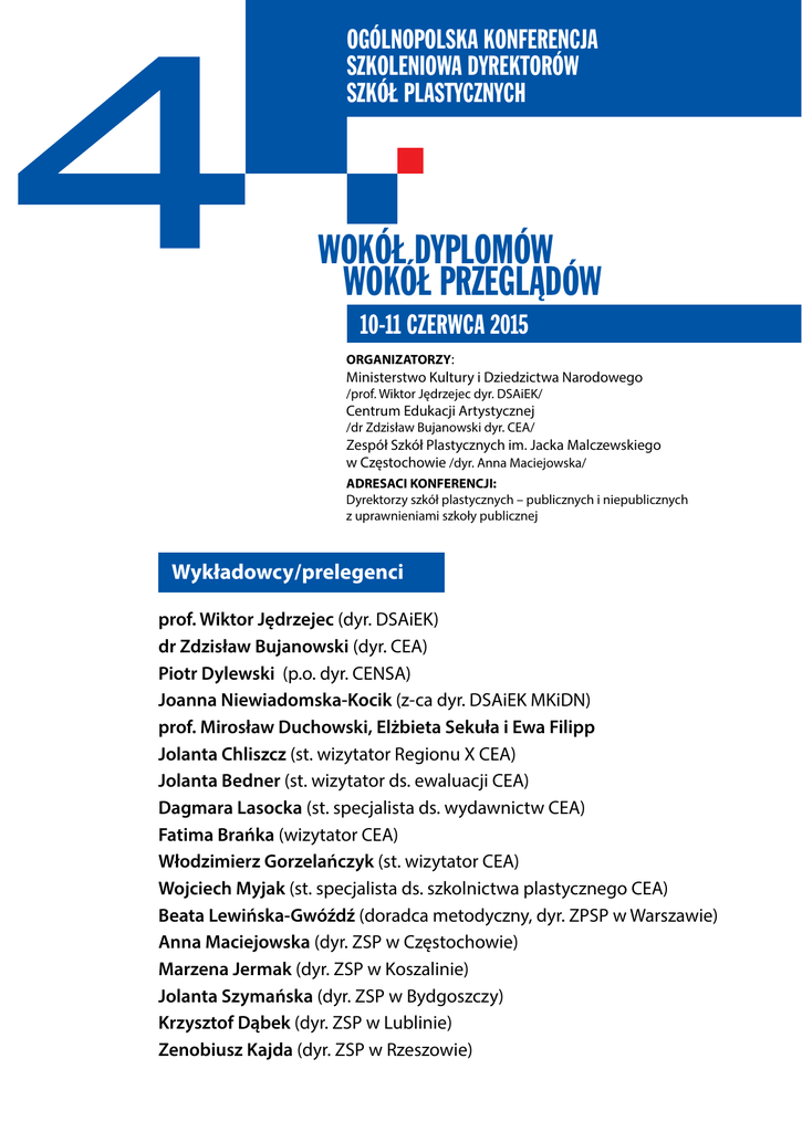 OGÓLNOPOLSKA KONFERENCJA SZKOLENIOWA DYREKTORÓW SZKÓŁ PLASTYCZNYCH WOKÓŁ DYPLOMÓW WOKÓŁ PRZEGLA˛DÓW 10-11 CZERWCA 2015 ORGANIZATORZY: Ministerstwo Kultury i Dziedzictwa Narodowego /prof. Wiktor Jędrzejec dyr. DSAiEK/ Centrum Edukacji Artystycznej /dr Zdzisław Bujanowski dyr. CEA/ Zespół Szkół Plastycznych im. Jacka Malczewskiego w Częstochowie /dyr. Anna Maciejowska/ ADRESACI KONFERENCJI: Dyrektorzy szkół plastycznych – publicznych i niepublicznych z uprawnieniami szkoły publicznej Wykładowcy/prelegenci prof. Wiktor Jędrzejec (dyr. DSAiEK) dr Zdzisław Bujanowski (dyr. CEA) Piotr Dylewski (p.o. dyr. CENSA) Joanna Niewiadomska-Kocik (z-ca dyr. DSAiEK MKiDN) prof. Mirosław Duchowski, Elżbieta Sekuła i Ewa Filipp Jolanta Chliszcz (st. wizytator Regionu X CEA) Jolanta Bedner (st. wizytator ds. ewaluacji CEA) Dagmara Lasocka (st. specjalista ds. wydawnictw CEA) Fatima Brańka (wizytator CEA) Włodzimierz Gorzelańczyk (st. wizytator CEA) Wojciech Myjak (st. specjalista ds. szkolnictwa plastycznego CEA) Beata Lewińska-Gwóźdź (doradca metodyczny, dyr. ZPSP w Warszawie) Anna Maciejowska (dyr. ZSP w Częstochowie) Marzena Jermak (dyr. ZSP w Koszalinie) Jolanta Szymańska (dyr. ZSP w Bydgoszczy) Krzysztof Dąbek (dyr. ZSP w Lublinie) Zenobiusz Kajda (dyr. ZSP w Rzeszowie) Przebieg konferencji Planowany przyjazd dyrektorów w dniu 9 czerwca 2015 r. /wtorek/ Wieczorem przybyłych dyrektorów zapraszamy na spotkanie w Muzeum Wyobraźni Tomasza Sętowskiego. Zapewniamy transport spod Hotelu Mercure o godz. 19.30 /ul. Ks. J. Popiełuszki 2/ WOKÓŁ DYPLOMÓW WOKÓŁ PRZEGLA˛DÓW 10 czerwca 2015 /środa/ 10:00-13:30 obrady przedpołudniowe w sali konferencyjnej szkoły 10:00 Przywitanie gości oraz uczestników konferencji. Cele i szczegółowy plan. Anna Maciejowska (ZSP), Włodzimierz Gorzelańczyk i Jerzy Sieczka (CEA) 10:05 Wprowadzenie do Konferencji: Rok po wprowadzanych zmianach - wystąpienie prof. Wiktora Jędrzejca (MKiDN) /15 minut/ 10:20 Kogo kształcimy, jakie dyplomy? W tym: Dyplomy w szkołach plastycznych w ostatnim ćwierćwieczu (1990-2015) Absolwent szkoły plastycznej od 2002 i po zmianach od 2014 roku. Prowadzący: Włodzimierz Gorzelańczyk (CEA) /25 minut/ 10:45 Koncepcje programowe przedmiotów modułowych. W tym: Nowe programy nauczania (CEA oraz szkolne). Moduły w kształceniu zawodu plastyka. Prowadzący: Beata Lewińska-Gwóźdź (doradca metodyczny) /30 minut/ 11:15 Sylwetka absolwenta szkoły plastycznej dzisiaj. XII Biennale Wyróżnionych Prac Dyplomowych – wernisaże: 2 czerwca 2015 r. – Zenobiusz Kajda – dyr. ZSP w Rzeszowie 8 czerwca 2015 r. – Jolanta Szymańska – dyr. ZSP w Bydgoszczy 10 czerwca 2015 r. – Anna Maciejowska – dyr. ZSP w Częstochowie 16 czerwca 2015 r. – Krzysztof Dąbek – dyr. ZSP w Lublinie Dyplomy wyższych szkół plastycznych: prof. Wiktor Jędrzejec (dyr. DSAiEK MKiDN) Moderator: Włodzimierz Gorzelańczyk (CEA) 2 12:00 Uroczyste otwarcie XII Ogólnopolskiego Przeglądu Wyróżnionych Prac Dyplomowych Szkół Plastycznych – Dyplom 2015 w Częstochowie (makroregion południowo-zachodni) – prof. Wiktor Jędrzejec SALA GIMNASTYCZNA – prezentacja szkół przez dyrektorów Prowadzący: Anna Maciejowska oraz Włodzimierz Gorzelańczyk 13:30 - 14.30 przerwa obiadowa /w szkole/ 15:00-18:30 obrady popołudniowe w sali konferencyjnej szkoły Moderator: Jolanta Chliszcz (CEA) 15:00 Nowa jakość doradztwa metodycznego w szkołach plastycznych. W tym: Rola (cele i zadania) punktów konsultacyjnych CEA. Najbliższe plany punktu konsultacyjnego w Częstochowie. Pytania i odpowiedzi dotyczące doradztwa metodycznego. Prowadzący: Joanna Niewiadomska-Kocik (z-ca dyr. DSAiEK MKiDN) dr Zdzisław Bujanowski (dyr. CEA), Fatima Brańka (CEA), Anna Maciejowska (ZSP) /30 minut/ 15:30 Jak kształcimy? Rezultaty Ogólnopolskich Przeglądów Rysunku, Malarstwa i Rzeźby W tym: Przeglądy – 10 lat doświadczeń. Przeglądy makroregionalne a finałowe w Dłużewie. Losy laureatów przeglądów (inf. dyrektorzy). Dyskusja. Prowadzący: Wojciech Myjak (CEA) /60 minut/ 16:30-16:45 przerwa kawowa /w szkole/ 16:45 Raport o stanie szkół plastycznych – przed zakończeniem prac. W tym: Cele i zakres zadania i dotychczasowe przemyślenia: Instytut Badań Przestrzeni Publicznej w Warszawie. Prowadzący: prof. Mirosław Duchowski (IBPP) /30 minut/ Stan szkół plastycznych - badania fokusowe z dyrektorami (Bielsko-Biała, Ciechanowiec, Gdańsk, Jarosław, Katowice, Krosno, Łomża, Malbork, Nowy Wiśnicz, Olsztyn, Poznań, Słupsk, Szczecin, Warszawa, Wrocław, Zamość oraz Zduńska Wola) Prowadzący: Elżbieta Sekuła i Ewa Filipp (IBPP) /60 minut/ 3 Wieczorem zapraszamy na uroczystą kolację do Zawad k/Częstochowy. W drugiej części wieczornego spotkania – dyskusja wokół dyplomów i przeglądów z udziałem prelegentów, wizytatorów i doradców metodycznych oraz zaproszonych gości. Zapewniamy transport spod Hotelu Mercure, wyjazd o godz. 19.00 WOKÓŁ DYPLOMÓW WOKÓŁ PRZEGLA˛DÓW 11 czerwca 2015 /czwartek/ Propozycja dla uczestników konferencji: msza św. w Kaplicy Matki Bożej na Jasnej Górze o godz. 7:30, po mszy zwiedzanie kompleksu klasztornego - zapraszamy. Po śniadaniu (w hotelu) zwiedzanie w grupach szkoły w Częstochowie pod opieką dyr. Anny Maciejowskiej. /10:30-11:30/ Obrady w sali konferencyjnej szkoły Moderator: Włodzimierz Gorzelańczyk (CEA) 12:00 Internet w oczach uczniów: korzyści i zagrożenia. W tym m.in: Jak praktycznie prowadzić portal szkoły plastycznej? Portal CEA oraz Biuletyn Plastyk codziennie. Wydawnictwo CEA. Prowadzący. Marzena Jermak (ZSP), Dagmara Lasocka (CEA), Włodzimierz Gorzelańczyk (CEA) /45 minut/ 12:45 Ewaluacja w szkołach plastycznych. W tym: Ewaluacja zewnętrzna jako narzędzia wspierającego doskonalenie pracy szkoły plastycznej. Raport z problemowych ewaluacji zewnętrznych w szkołach plastycznych. Prowadzący: Jolanta Bedner (CEA) /45 minut/ 13:30 P