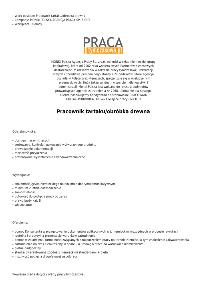 ● ● ● Work position: Pracownik tartaku/obróbka drewna Company: MONDI POLSKA AGENCJA PRACY SP. Z O.O. Workplace: Niemcy MONDI Polska Agencja Pracy Sp. z o.o. wchodzi w skład niemieckiej grupy kapitałowej, która od 2002 roku wspiera swych Partnerów biznesowych dostarczając im rozwiązania w zakresie pracy tymczasowej, rekrutacji stałych i doradztwa personalnego. Każdy z 22 oddziałów, które agencja posiada w Polsce oraz Niemczech, specjalizuje się w obsłudze firm przemysłowych. Służy także solidnym wsparciem dla logistyki i administracji. Mondi Polska jest wpisana do rejestru podmiotów prowadzących agencje zatrudnienia nr 7268. Aktualnie dla naszego Klienta poszukujemy Kandydata/i na stanowisko: PRACOWNIK TARTAKU/OBRÓBKA DREWNA Miejsce pracy - NIEMCY Pracownik tartaku/obróbka drewna Opis stanowiska: ● ● ● ● ● obsługa maszyn tnących sortowanie, kontrola i pakowanie wytworzonego produktu prowadzenie dokumentacji możliwość przyuczenia preferowane wykształcenie zawodowe/techniczne Wymagania: ● ● ● ● ● ● znajomość języka niemieckiego na poziomie dobrym/komunikatywnym minimum 2 letnie doświadczenie samodzielność gotowość do podjęcia pracy od zaraz prawo jazdy kat. B własne auto Oferujemy: ● ● ● ● ● ● ● pomoc Konsultanta w przygotowaniu dokumentów aplikacyjnych w j. niemieckim niezbędnych w procesie rekrutacji rzetelną i precyzyjną prezentację warunków zatrudnienia pomoc w załatwieniu formalności związanych z rozpoczęciem pracy na terenie Niemiec, w tym znalezienie zakwaterowania zatrudnienie na czas nieokreślony w oparciu o umowę o pracę na warunkach niemieckich!!! płatne nadgodziny stawka gwarantowana zgodna z niemieckimi standardami + dieta możliwość podjęcia długofalowej współpracy Powyższa oferta dotyczy oferty pracy tymczasowej. Aplikuj Dane kontaktowe: MONDI POLSKA AGENCJA PRACY SP. Z O.O. Send Save Print Tweet