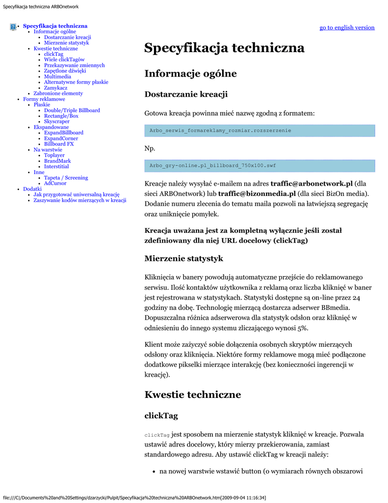Specyfikacja techniczna ARBOnetwork Specyfikacja techniczna Informacje ogólne Dostarczanie kreacji Mierzenie statystyk Kwestie techniczne clickTag Wiele clickTagów Przekazywanie zmiennych Zapętlone dźwięki Multimedia Alternatywne formy płaskie Zamykacz Zabronione elementy Formy reklamowe Płaskie Double/Triple Billboard Rectangle/Box Skyscraper Ekspandowane ExpandBillboard ExpandCorner Billboard FX Na warstwie Toplayer BrandMark Interstitial Inne Tapeta / Screening AdCursor Dodatki Jak przygotować uniwersalną kreację Zaszywanie kodów mierzących w kreacji go to english version Specyfikacja techniczna Informacje ogólne Dostarczanie kreacji Gotowa kreacja powinna mieć nazwę zgodną z formatem: Arbo_serwis_formareklamy_rozmiar.rozszerzenie Np. Arbo_gry-online.pl_billboard_750x100.swf Kreacje należy wysyłać e-mailem na adres [email protected] (dla sieci ARBOnetwork) lub [email protected] (dla sieci BizOn media). Dodanie numeru zlecenia do tematu maila pozwoli na łatwiejszą segregację oraz uniknięcie pomyłek. Kreacja uważana jest za kompletną wyłącznie jeśli został zdefiniowany dla niej URL docelowy (clickTag) Mierzenie statystyk Kliknięcia w banery powodują automatyczne przejście do reklamowanego serwisu. Ilość kontaktów użytkownika z reklamą oraz liczba kliknięć w baner jest rejestrowana w statystykach. Statystyki dostępne są on-line przez 24 godziny na dobę. Technologię mierzącą dostarcza adserwer BBmedia. Dopuszczalna różnica adserwerowa dla statystyk odsłon oraz kliknięć w odniesieniu do innego systemu zliczającego wynosi 5%. Klient może zażyczyć sobie dołączenia osobnych skryptów mierzących odsłony oraz kliknięcia. Niektóre formy reklamowe mogą mieć podłączone dodatkowe pikselki mierzące interakcję (bez konieczności ingerencji w kreację). Kwestie techniczne clickTag jest sposobem na mierzenie statystyk kliknięć w kreacje. Pozwala ustawić adres docelowy, który mierzy przekierowania, zamiast standardowego adresu. Aby ustawić clickTag w kreacji należy: clickTag na nowej warstwie wstawić button (o wymiarach równych obszarowi file:///C|/Documents%20and%20Settings/dzarzycki/Pulpit/Specyfikacja%20techniczna%20ARBOnetwork.htm[2009-09-04 11:16:34] Specyfikacja techniczna ARBOnetwork klikalnemu kreacji) przenieść warstwę nad wszystkie inne warstwy ustawić nieprzezroczystość buttona na 0% przypisać następującą akcję do buttona (nie do klatki!) on (release) { getURL(_root.clickTag, "_blank"); } Kreacje pisane w ActionScript 3 powinny używać takiego kodu: myButton.addEventListener(MouseEvent.CLICK, function() { if (root.loaderInfo.parameters.clickTag) { navigateToURL( new URLRequest(root.loaderInfo.parameters.clickTag), "_blank" ); } }); Wiele clickTagów W przypadku kiedy kreacja używa wiele adresów docelowych, zostaną one przekazane w sposób identyczny do pojedyńczego clickTaga z tą róźnicą, że do nazwy zmiennej dodany zostanie numer porządkowy, np. clickTag1, clickTag2, itd. Sposób użycia tych adresów w kreacji jest identyczny ze standardowym clickTagiem, czyli np:. on (release) { getURL(_root.clickTag2, "_blank"); } Jeśli nie ma potrzeby oddzielnego mierzenia osobnych clickTagów, można „zaszyć” adresy docelowe w kreacji, doklejając je z prawej strony zmiennej clickTag , np: // button 1 on (release) { getURL(_root.clickTag + "http://example.com/?pierwszy-adres", "_blank") } // button 2 on (release) { getURL(_root.clickTag + "http://example.com/?inny-adres", "_blank") } Przekazywanie zmiennych Kliknięcia w kreację przechodzą przez redirect (czyli przez adserwer), a dopiero potem trafiają na stronę docelową. Dlatego wszelkie doklejane parametry przekazywane są do adserwera, a nie do linka docelowego. Aby file:///C|/Documents%20and%20Settings/dzarzycki/Pulpit/Specyfikacja%20techniczna%20ARBOnetwork.htm[2009-09-04 11:16:34] Specyfikacja techniczna ARBOnetwork użyć zmiennego adresu docelowego, należy skonstruować go w całości samodzielnie i dokleić na końcu clickTag-a. Przykładowo, jeśli kreacja ma kierować na adres http://example.com i przekazywać parametr kwota o wartości przechowywanej w zmiennej _root.kwota , akcja po kliknięciu na button powinna wyglądać tak: on (release) { getURL(_root.clickTag + 'http://example.com/?kwota=' + _root.kwota, "_blank"); } Zapętlone dźwięki Zapętlone dźwięki są niedopuszczalne w kreacjach. Szczególnie w momencie, kiedy emisja reklamy powinna być zakończona (użytkownik kliknął w zamykacz). Kreacja powinna bezwzględnie zakończyć odgrywanie wszelkich dźwięków wraz z kliknięciem zamykacza lub po upływie czasu emisji (w przypadku toplayera). Multimedia Duże pliki multimedialne, takie jak muzyka w formacie mp3 lub materiały wideo w formacie flv nie mogą być zagnieżdzone w kreacji - jej rozmiar nie może przekroczyć wyznaczonej przez specyfikacje maksymalnej wagi (w większości jest to 50KB). Pliki takie należy dostarczyć osobno. Zostaną umieszczone na serwerze WWW, a adres do nich zostanie przekazany do kreacji poprzez zmienną FlashVars. Formy reklamowe z wideo zawierają w koszcie mediowym pojemność 1MB lub 2MB (za dopłatą) plików multimedialnych. Kracja powinna skladać się z 2 plikow - SWF - ramka z odtwarzaczem, który zaciaga wlasciwe video oraz samego pliku FLV. Odtwarzacz powinien mieć przycisk MUTE (obraz głośniczka) wyciszający dźwięk w kreacji. Obraz może być zapętlony, jednak po jednej sekwencji dźwięk powinien wyciszyć się automatycznie. Alternatywne formy płaskie Dla kreacji typu billboard (billboard, box, skyscraper) oraz expand (expandbill, pushbill), mogą zostać przygotowane zastępcze kreacje w formacie rastrowym (JPG, PNG, GIF). Zostaną one wyświetlone użytkownikom z wyłączoną obsługa JavaScriptu. Zamykacz Kreacje emitowane na warstwie powinny posiadać zamykacz, całkowicie usuwający kreację. Powinien być to button zgodny z następującymi wytycznymi: file://