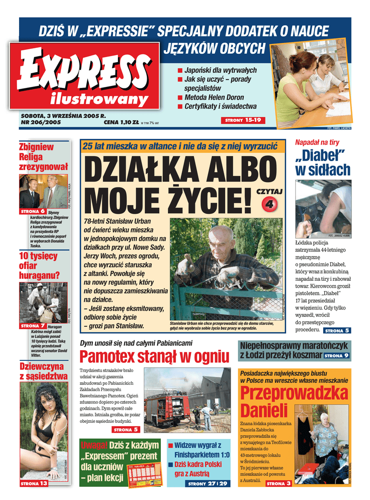 DZIŚ W „EXPRESSIE” SPECJALNY DODATEK O NAUCE JĘZYKÓW OBCYCH ■ Japoński dla wytrwałych ■ Jak się uczyć – porady specjalistów ■ Metoda Helen Doron ■ Certyfikaty i świadectwa SOBOTA, 3 WRZEŚNIA 2005 R. NR 206/2005 CENA 1,10 ZŁ STRONY W TYM 7% VAT 15-19 FOT. PAWEŁ ŁACHETA STRONA 7 Huragan Katrina mógł zabić w Luizjanie ponad 10 tysięcy ludzi. Taką opinię przedstawił wczoraj senator David Vitter. FOT. PAP/EPA 10 tysięcy ofiar huraganu? Dziewczyna z sąsiedztwa DZIAŁKA ALBO MOJE ŻYCIE! CZYTAJ 4 78-letni Stanisław Urban od ćwierć wieku mieszka w jednopokojowym domku na działkach przy ul. Nowe Sady. Jerzy Woch, prezes ogrodu, chce wyrzucić staruszka z altanki. Powołuje się na nowy regulamin, który nie dopuszcza zamieszkiwania na działce. – Jeśli zostanę eksmitowany, odbiorę sobie życie Stanisław Urban nie chce przeprowadzić się do domu starców, – grozi pan Stanisław. gdyż nie wyobraża sobie życia bez pracy w ogrodzie. Dym unosił się nad całymi Pabianicami Pamotex stanął w ogniu Trzydziestu strażaków brało udział w akcji gaszenia zabudowań po Pabianickich Zakładach Przemysłu Bawełnianego Pamotex. Ogień zduszono dopiero po czterech godzinach. Dym spowił całe miasto. Istniała groźba, że pożar obejmie sąsiednie budynki. FOT. JANUSZ KUBIK STRONA STRONA 13 „Diabeł” w sidłach Łódzka policja zatrzymała 44-letniego mężczyznę o pseudonimie Diabeł, który wraz z konkubiną napadał na tiry i rabował towar. Kierowcom groził pistoletem. „Diabeł” 17 lat przesiedział w więzieniu. Gdy tylko wyszedł, wrócił do przestępczego procederu. STRONA 5 Niepełnosprawny maratończyk z Łodzi przeżył koszmar STRONA 9 Posiadaczka największego biustu w Polsce ma wreszcie własne mieszkanie Przeprowadzka Danieli 5 Uwaga! Dziś z każdym „Expressem” prezent dla uczniów – plan lekcji FOT. JANUSZ KUBIK ■ Widzew wygrał z Finishparkietem 1:0 ■ Dziś kadra Polski gra z Austrią STRONY 27 i 29 Znana łódzka piosenkarka Daniela Zabłocka przeprowadziła się z wynajętego na Teofilowie mieszkania do 43-metrowego lokalu w Śródmieściu. To jej pierwsze własne mieszkanie od powrotu z Australii. STRONA 3 FOT. MAREK KOWAL STRONA 6 Słynny kardiochirurg Zbigniew Religa zrezygnował z kandydowania na prezydenta RP i równocześnie poparł w wyborach Donalda Tuska. Napadał na tiry 25 lat mieszka w altance i nie da się z niej wyrzucić FOT. ŁUKASZ KASPRZAK FOT. PAP/PAWEŁ KULA Zbigniew Religa zrezygnował
