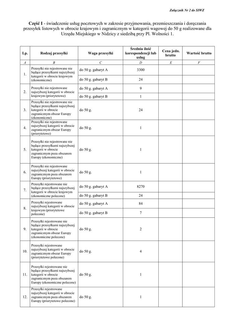 Załącznik Nr 2 do SIWZ Część I - świadczenie usług pocztowych w zakresie przyjmowania, przemieszczania i doręczania przesyłek listowych w obrocie krajowym i zagranicznym w kategorii wagowej do 50 g realizowane dla Urzędu Miejskiego w Nidzicy z siedzibą przy Pl. Wolności 1. Lp. Rodzaj przesyłki Waga przesyłki Średnia ilość korespondencji lub usług Cena jedn. brutto Wartość brutto A B C D E F 1. Przesyłki nie rejestrowane nie będące przesyłkami najszybszej kategorii w obrocie krajowym (ekonomiczne) do 50 g. gabaryt A 3300 do 50 g. gabaryt B 24 do 50 g. gabaryt A 9 do 50 g. gabaryt B 1 do 50 g. 24 do 50 g. 1 5. Przesyłki nie rejestrowane nie będące przesyłkami najszybszej kategorii w obrocie zagranicznym poza obszarem Europy (ekonomiczne) do 50 g. 1 6. Przesyłki nie rejestrowane najszybszej kategorii w obrocie zagranicznym poza obszarem Europy (priorytetowe) do 50 g. 1 7. Przesyłki rejestrowane nie będące przesyłkami najszybszej kategorii w obrocie krajowym (ekonomiczne polecone) 2. 3. 4. Przesyłki nie rejestrowane najszybszej kategorii w obrocie krajowym (priorytetowe) Przesyłki nie rejestrowane nie będące przesyłkami najszybszej kategorii w obrocie zagranicznym obszar Europy (ekonomiczne) Przesyłki nie rejestrowane najszybszej kategorii w obrocie zagranicznym obszar Europy (priorytetowe) do 50 g. gabaryt A 8270 do 50 g. gabaryt B 24 do 50 g. gabaryt A 84 do 50 g. gabaryt B 7 9. Przesyłki rejestrowane nie będące przesyłkami najszybszej kategorii w obrocie zagranicznym obszar Europy (ekonomiczne polecone) do 50 g. 2 10. Przesyłki rejestrowane najszybszej kategorii w obrocie zagranicznym obszar Europy (priorytetowe polecone) do 50 g. 4 11. Przesyłki rejestrowane nie będące przesyłkami najszybszej kategorii w obrocie zagranicznym poza obszarem Europy (ekonomiczne polecone) do 50 g. 1 do 50 g. 1 8. 12. Przesyłki rejestrowane najszybszej kategorii w obrocie krajowym (priorytetowe polecone) Przesyłki rejestrowane najszybszej kategorii w obrocie zagranicznym poza obszarem Europy (priorytetowe polecone) 13. Usługa "polecenie" w obrocie krajowym 1 14. Usługa "polecenie" w obrocie zagranicznym 33 15. Usługa "potwierdzenie odbioru" w obrocie krajowym 7974 16. Usługa "potwierdzenie odbioru" w obrocie zagranicznym 34 17 Usługa "zwrot do adresata" w obrocie krajowym 413 18. Usługa "zwrot do adresata" w obrocie zagranicznym 1 Suma