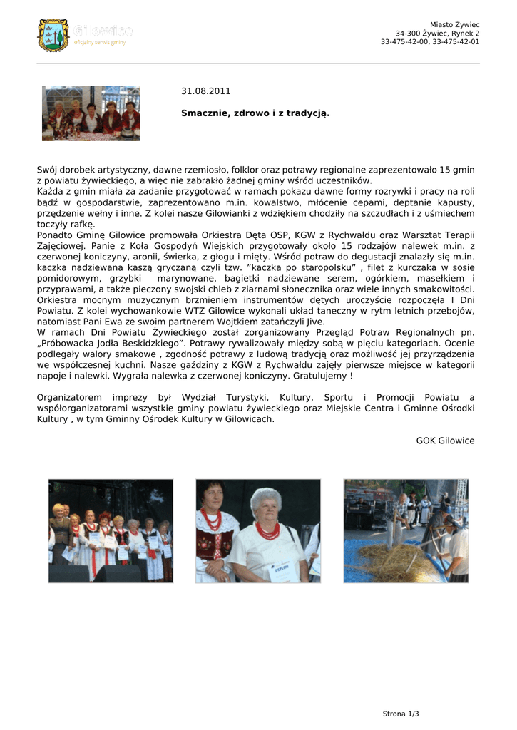 Miasto Żywiec 34-300 Żywiec, Rynek 2 33-475-42-00, 33-475-42-01 31.08.2011 Smacznie, zdrowo i z tradycją. Swój dorobek artystyczny, dawne rzemiosło, folklor oraz potrawy regionalne zaprezentowało 15 gmin z powiatu żywieckiego, a więc nie zabrakło żadnej gminy wśród uczestników. Każda z gmin miała za zadanie przygotować w ramach pokazu dawne formy rozrywki i pracy na roli bądź w gospodarstwie, zaprezentowano m.in. kowalstwo, młócenie cepami, deptanie kapusty, przędzenie wełny i inne. Z kolei nasze Gilowianki z wdziękiem chodziły na szczudłach i z uśmiechem toczyły rafkę. Ponadto Gminę Gilowice promowała Orkiestra Dęta OSP, KGW z Rychwałdu oraz Warsztat Terapii Zajęciowej. Panie z Koła Gospodyń Wiejskich przygotowały około 15 rodzajów nalewek m.in. z czerwonej koniczyny, aronii, świerka, z głogu i mięty. Wśród potraw do degustacji znalazły się m.in. kaczka nadziewana kaszą gryczaną czyli tzw. ”kaczka po staropolsku” , filet z kurczaka w sosie pomidorowym, grzybki marynowane, bagietki nadziewane serem, ogórkiem, masełkiem i przyprawami, a także pieczony swojski chleb z ziarnami słonecznika oraz wiele innych smakowitości. Orkiestra mocnym muzycznym brzmieniem instrumentów dętych uroczyście rozpoczęła I Dni Powiatu. Z kolei wychowankowie WTZ Gilowice wykonali układ taneczny w rytm letnich przebojów, natomiast Pani Ewa ze swoim partnerem Wojtkiem zatańczyli Jive. W ramach Dni Powiatu Żywieckiego został zorganizowany Przegląd Potraw Regionalnych pn. „Próbowacka Jodła Beskidzkiego”. Potrawy rywalizowały między sobą w pięciu kategoriach. Ocenie podlegały walory smakowe , zgodność potrawy z ludową tradycją oraz możliwość jej przyrządzenia we współczesnej kuchni. Nasze gaździny z KGW z Rychwałdu zajęły pierwsze miejsce w kategorii napoje i nalewki. Wygrała nalewka z czerwonej koniczyny. Gratulujemy ! Organizatorem imprezy był Wydział Turystyki, Kultury, Sportu i Promocji Powiatu a współorganizatorami wszystkie gminy powiatu żywieckiego oraz Miejskie Centra i Gminne Ośrodki Kultury , w tym Gminny Ośrodek Kultury w Gilowicach. GOK Gilowice Strona 1/3 Miasto Żywiec 34-300 Żywiec, Rynek 2 33-475-42-00, 33-475-42-01 Strona 2/3 Miasto Żywiec 34-300 Żywiec, Rynek 2 33-475-42-00, 33-475-42-01 Strona 3/3 Powered by TCPDF (www.tcpdf.org)