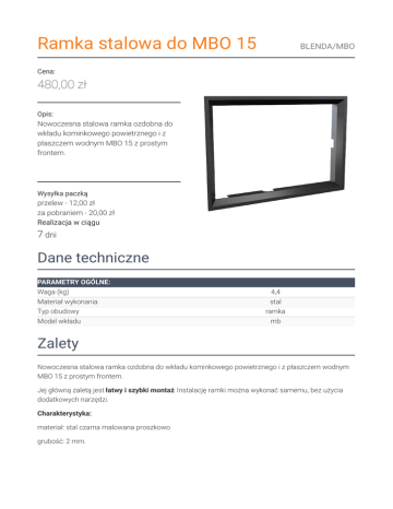 Ramka stalowa do MBO 15 BLENDA/MBO Cena: 480,00 zł Opis: Nowoczesna stalowa ramka ozdobna do wkładu kominkowego powietrznego i z płaszczem wodnym MBO 15 z prostym frontem. Wysyłka paczką przelew - 12,00 zł za pobraniem - 20,00 zł Realizacja w ciągu 7 dni Dane techniczne PARAMETRY OGÓLNE: Waga (kg) Materiał wykonania Typ obudowy Model wkładu 4,4 stal ramka mb Zalety Nowoczesna stalowa ramka ozdobna do wkładu kominkowego powietrznego i z płaszczem wodnym MBO 15 z prostym frontem. Jej główną zaletą jest łatwy i szybki montaż. Instalację ramki można wykonać samemu, bez użycia dodatkowych narzędzi. Charakterystyka: materiał: stal czarna malowana proszkowo grubość: 2 mm. Rysunek techniczny Zwrot Klient będący Konsumentem, który zawarł Umowę sprzedaży, może w terminie 14 dni odstąpić od niej bez podawania przyczyny. Bieg terminu na odstąpienie od Umowy sprzedaży rozpoczyna się od chwili objęcia Towaru w posiadanie przez Klienta lub wskazaną przez niego osobę trzecią inną niż przewoźnik. Oświadczenie można złożyć na formularzu, którego wzór został zamieszczony przez Sprzedawcę na Stronie Internetowej Sklepu pod adresem: formularz odstąpienia. Kratki.pl Marek Bal ul. W. Gombrowicza 4 26-660 Wsola/Jedlińsk www.kratki.com tel. 48 340 10 00 Data publikacji: 02.03.2017