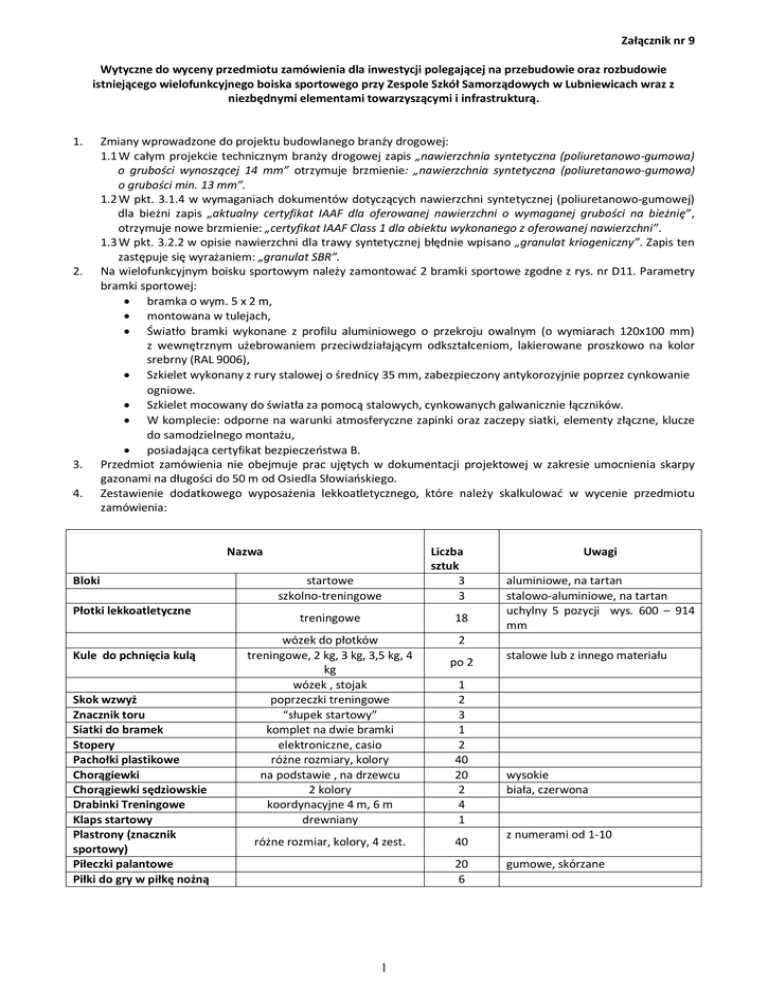 Załącznik nr 9 Wytyczne do wyceny przedmiotu zamówienia dla inwestycji polegającej na przebudowie oraz rozbudowie istniejącego wielofunkcyjnego boiska sportowego przy Zespole Szkół Samorządowych w Lubniewicach wraz z niezbędnymi elementami towarzyszącymi i infrastrukturą. 1. 2. 3. 4. Zmiany wprowadzone do projektu budowlanego branży drogowej: 1.1 W całym projekcie technicznym branży drogowej zapis „nawierzchnia syntetyczna (poliuretanowo-gumowa) o grubości wynoszącej 14 mm” otrzymuje brzmienie: „nawierzchnia syntetyczna (poliuretanowo-gumowa) o grubości min. 13 mm”. 1.2 W pkt. 3.1.4 w wymaganiach dokumentów dotyczących nawierzchni syntetycznej (poliuretanowo-gumowej) dla bieżni zapis „aktualny certyfikat IAAF dla oferowanej nawierzchni o wymaganej grubości na bieżnię”, otrzymuje nowe brzmienie: „certyfikat IAAF Class 1 dla obiektu wykonanego z oferowanej nawierzchni”. 1.3 W pkt. 3.2.2 w opisie nawierzchni dla trawy syntetycznej błędnie wpisano „granulat kriogeniczny”. Zapis ten zastępuje się wyrażaniem: „granulat SBR”. Na wielofunkcyjnym boisku sportowym należy zamontować 2 bramki sportowe zgodne z rys. nr D11. Parametry bramki sportowej: bramka o wym. 5 x 2 m, montowana w tulejach, Światło bramki wykonane z profilu aluminiowego o przekroju owalnym (o wymiarach 120x100 mm) z wewnętrznym użebrowaniem przeciwdziałającym odkształceniom, lakierowane proszkowo na kolor srebrny (RAL 9006), Szkielet wykonany z rury stalowej o średnicy 35 mm, zabezpieczony antykorozyjnie poprzez cynkowanie ogniowe. Szkielet mocowany do światła za pomocą stalowych, cynkowanych galwanicznie łączników. W komplecie: odporne na warunki atmosferyczne zapinki oraz zaczepy siatki, elementy złączne, klucze do samodzielnego montażu, posiadająca certyfikat bezpieczeństwa B. Przedmiot zamówienia nie obejmuje prac ujętych w dokumentacji projektowej w zakresie umocnienia skarpy gazonami na długości do 50 m od Osiedla Słowiańskiego. Zestawienie dodatkowego wyposażenia lekkoatletycznego, które należy skalkulować w wycenie przedmiotu zamówienia: Nazwa Bloki Płotki lekkoatletyczne Kule do pchnięcia kulą Skok wzwyż Znacznik toru Siatki do bramek Stopery Pachołki plastikowe Chorągiewki Chorągiewki sędziowskie Drabinki Treningowe Klaps startowy Plastrony (znacznik sportowy) Piłeczki palantowe Piłki do gry w piłkę nożną startowe szkolno-treningowe Liczba sztuk 3 3 treningowe 18 wózek do płotków treningowe, 2 kg, 3 kg, 3,5 kg, 4 kg wózek , stojak poprzeczki treningowe “słupek startowy” komplet na dwie bramki elektroniczne, casio różne rozmiary, kolory na podstawie , na drzewcu 2 kolory koordynacyjne 4 m, 6 m drewniany 2 różne rozmiar, kolory, 4 zest. po 2 1 2 3 1 2 40 20 2 4 1 40 20 6 1 Uwagi aluminiowe, na tartan stalowo-aluminiowe, na tartan uchylny 5 pozycji wys. 600 – 914 mm stalowe lub z innego materiału wysokie biała, czerwona z numerami od 1-10 gumowe, skórzane
