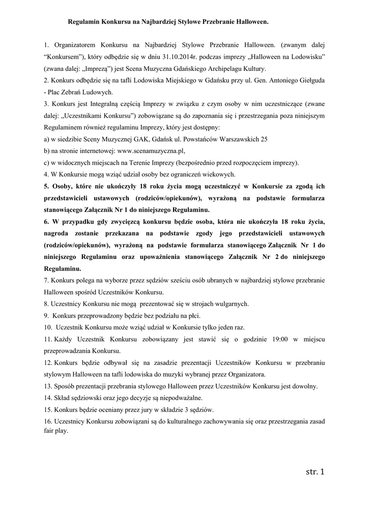 Regulamin Konkursu na Najbardziej Stylowe Przebranie Halloween. 1. Organizatorem Konkursu na Najbardziej Stylowe Przebranie Halloween. (zwanym dalej “Konkursem”), który odbędzie się w dniu 31.10.2014r. podczas imprezy „Halloween na Lodowisku” (zwana dalej: „Imprezą”) jest Scena Muzyczna Gdańskiego Archipelagu Kultury. 2. Konkurs odbędzie się na tafli Lodowiska Miejskiego w Gdańsku przy ul. Gen. Antoniego Giełguda - Plac Zebrań Ludowych. 3. Konkurs jest Integralną częścią Imprezy w związku z czym osoby w nim uczestniczące (zwane dalej: „Uczestnikami Konkursu”) zobowiązane są do zapoznania się i przestrzegania poza niniejszym Regulaminem również regulaminu Imprezy, który jest dostępny: a) w siedzibie Sceny Muzycznej GAK, Gdańsk ul. Powstańców Warszawskich 25 b) na stronie internetowej: www.scenamuzyczna.pl, c) w widocznych miejscach na Terenie Imprezy (bezpośrednio przed rozpoczęciem imprezy). 4. W Konkursie mogą wziąć udział osoby bez ograniczeń wiekowych. 5. Osoby, które nie ukończyły 18 roku życia mogą uczestniczyć w Konkursie za zgodą ich przedstawicieli ustawowych (rodziców/opiekunów), wyrażoną na podstawie formularza stanowiącego Załącznik Nr 1 do niniejszego Regulaminu. 6. W przypadku gdy zwycięzcą konkursu będzie osoba, która nie ukończyła 18 roku życia, nagroda zostanie przekazana na podstawie zgody jego przedstawicieli ustawowych (rodziców/opiekunów), wyrażoną na podstawie formularza stanowiącego Załącznik Nr 1 do niniejszego Regulaminu oraz upoważnienia stanowiącego Załącznik Nr 2 do niniejszego Regulaminu. 7. Konkurs polega na wyborze przez sędziów sześciu osób ubranych w najbardziej stylowe przebranie Halloween spośród Uczestników Konkursu. 8. Uczestnicy Konkursu nie mogą prezentować się w strojach wulgarnych. 9. Konkurs przeprowadzony będzie bez podziału na płci. 10. Uczestnik Konkursu może wziąć udział w Konkursie tylko jeden raz. 11. Każdy Uczestnik Konkursu zobowiązany jest stawić się o godzinie 19:00 w miejscu przeprowadzania Konkursu. 12. Konkurs będzie odbywał się na zasadzie prezentacji Uczestników Konkursu w przebraniu stylowym Halloween na tafli lodowiska do muzyki wybranej przez Organizatora. 13. Sposób prezentacji przebrania stylowego Halloween przez Uczestników Konkursu jest dowolny. 14. Skład sędziowski oraz jego decyzje są niepodważalne. 15. Konkurs będzie oceniany przez jury w składzie 3 sędziów. 16. Uczestnicy Konkursu zobowiązani są do kulturalnego zachowywania się oraz przestrzegania zasad fair play. str. 1 17. Organizator zastrzega sobie prawo dyskwalifikacji Uczestnika lub Uczestników Konkursu w przypadku ich niestosownego zachowania w stosunku do sędziów, przedstawicieli Organizatora lub pozostałych Uczestników Konkursu. 18. Organizator zapewnia nagrody rzeczowe dla zwycięzców Konkursu w postaci kart podarunkowych o łącznej wartości 3000 zł brutto (tj. dla każdego zwycięzcy po 1 szt. karcie podarunkowej o wartości 500 zł każda, słownie: pięćset złotych uprawniającej do dokonania zakupów w sieci sklepów oznaczonych marką CROPP). 19. Organizator zastrzega sobie prawo do wprowadzenia zmian w Regulaminie. Wiążąca i ostateczna interpretacja Regulaminu należy do Organizatora. O zmianach w Regulaminie Organizator będzie informował na stronie internetowej www.scenamuzyczna.pl 20. Regulamin jest dostępny: a) w siedzibie Scena Muzyczna Gdańsk GAK, ul. Powstańców Warszawskich 25 b) na stronie internetowej www.scenamuzyczna.pl. c) w widocznych miejscach na Terenie Imprezy (bezpośrednio przed rozpoczęciem imprezy). 21. W sprawach nieuregulowanych w niniejszym Regulaminie Imprezy stosuje się przepisy określone w odpowiednich ustawach i przepisach wykonawczych do tych ustaw. str. 2 ZAŁĄCZNIK NR 1 ZGODA PRZESTAWICIELI USTAWOWYCH NA UCZESTNICTWO W KONKURSIE NA NAJBARDZIEJ STYLOWE PRZEBRANIE HALLOWEEN, KTÓRY ODBĘDZIE SIĘ PODCZAS IMPREZY „HALLOWEEN NA LODOWISKU” Ja niżej podpisany/a, oświadczam, iż jako przedstawiciel ustawowy ……………………………………………………………………………………. [IMIĘ I NAZWSKO UCZESTNIKA] będącej/ego osobą poniżej 18 roku życia, niniejszym wyrażam zgodę na jej/jego udział w KONKURSIE NA NAJBARDZIEJ STYLOWE PRZEBRANIE HALLOWEEN, który odbędzie się podczas imprezy „HALLOWEEN NA LODOWISKU” w dniu od 31.10.2014r. ,a także na wszelkie postanowienia zawarte w regulaminie konkursu. PODPIS(Y) PRZEDSTAWICIELA/I USTAWOWEGO / USTAWOWYCH (RODZICE) IMIĘ I NAZWISKO: …………………………………… (przedstawiciel ustawowy) (pisane drukowanymi literami) …………………………………… (podpis) IMIĘ I NAZWISKO: ……………………………………. (przedstawiciel ustawowy) (pisane drukowanymi literami) ……………………………………. (podpis) DATA: _________________________ str. 3 ZAŁĄCZNIK NR 2 ………………………………………….. imię i nazwisko …………………………………………. adres zamieszkania UPOWAŻNIENIE Upoważniam Gdański Archipelag Kultury w Gdańsku do przekazania nagrody przyznanej w KONKURSIE NA NAJBARDZIEJ STYLOWE PRZEBRANIE HALLOWEEN dla ( Imię i nazwisko zwycięzcy) ……………………….………………………………………………………………………..…………………………………………………………………………………………………………………………………….….. ……………………….. Podpis str. 4