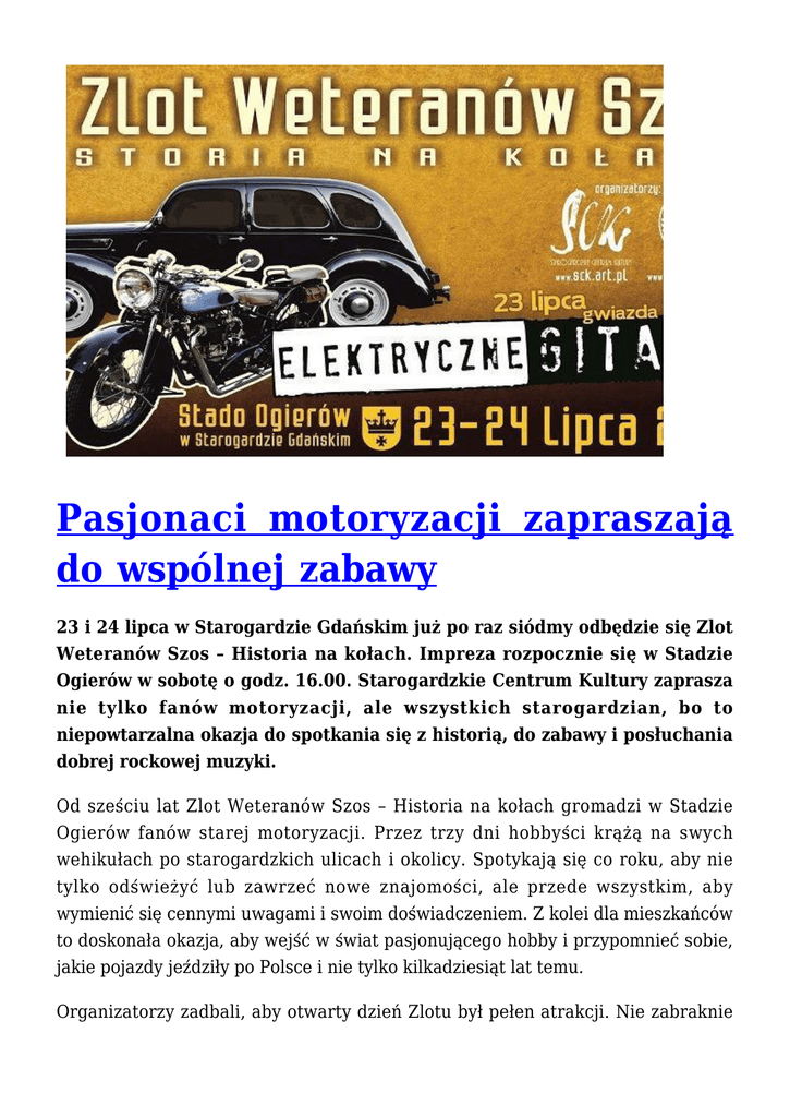Pasjonaci motoryzacji zapraszają do wspólnej zabawy 23 i 24 lipca w Starogardzie Gdańskim już po raz siódmy odbędzie się Zlot Weteranów Szos – Historia na kołach. Impreza rozpocznie się w Stadzie Ogierów w sobotę o godz. 16.00. Starogardzkie Centrum Kultury zaprasza nie tylko fanów motoryzacji, ale wszystkich starogardzian, bo to niepowtarzalna okazja do spotkania się z historią, do zabawy i posłuchania dobrej rockowej muzyki. Od sześciu lat Zlot Weteranów Szos – Historia na kołach gromadzi w Stadzie Ogierów fanów starej motoryzacji. Przez trzy dni hobbyści krążą na swych wehikułach po starogardzkich ulicach i okolicy. Spotykają się co roku, aby nie tylko odświeżyć lub zawrzeć nowe znajomości, ale przede wszystkim, aby wymienić się cennymi uwagami i swoim doświadczeniem. Z kolei dla mieszkańców to doskonała okazja, aby wejść w świat pasjonującego hobby i przypomnieć sobie, jakie pojazdy jeździły po Polsce i nie tylko kilkadziesiąt lat temu. Organizatorzy zadbali, aby otwarty dzień Zlotu był pełen atrakcji. Nie zabraknie motocpyo k.d ilksw aczh óęio w ca oo u lw tych B ę d z i e m o ż n a d o tknąć starych junaków, czy zrobić sobie zdjęcie z cadillaciem w tle. Na najmłodszych czekać będzie plac zabaw oraz mnóstwo konkursów również sprawnościowych. A popołudnie i wieczór umilą wszystkim koncerty muzyczne. Na scenie zabrzmi reggae, punk rock, a nawet klasyczny oldschoolowy heavy metal. Obok naszej miejscowej kapeli – Drachells wystąpi zespół Banderola ze Skarszew oraz Majestic z Gdańska. Gwiazdą wieczoru będą Elektryczne Gitary, które podobnie jak w poprzednich latach Dżem, IRA czy Lady Pank z pewnością dostarczą uczestnikom niezapomnianych muzycznych wrażeń. Tradycją jest też, że od lat w niedziele rano ulicami miasta przejeżdża barwna parada pojazdów. Kierowcy udają się potem na zwiedzanie lokalnych atrakcji turystycznych i zakładów przemysłowych w Starogardzie. Organizatorzy również w tym roku planują takie zakończenie VII Zloty Weteranów Szos, dlatego już teraz warto zaplanować sobie to sobotnie popołudnie i wieczór. https://www.youtube.com/watch?v=Pm9A5jq4JPI