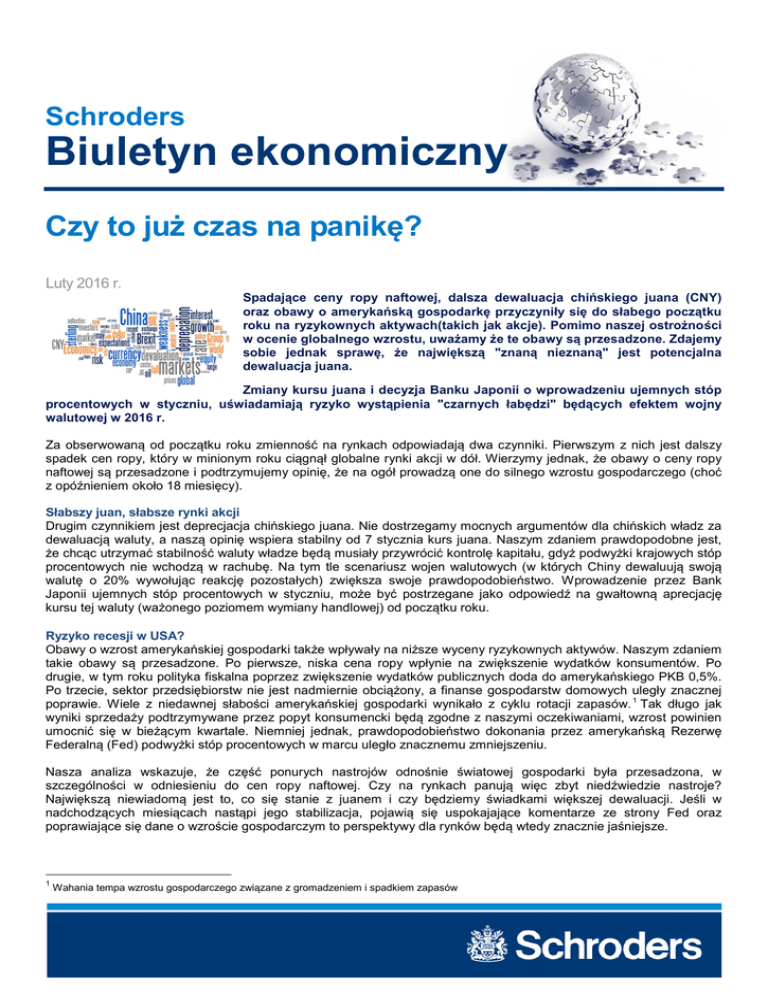 Schroders Biuletyn ekonomiczny Czy to już czas na panikę? Luty 2016 r. Spadające ceny ropy naftowej, dalsza dewaluacja chińskiego juana (CNY) oraz obawy o amerykańską gospodarkę przyczyniły się do słabego początku roku na ryzykownych aktywach(takich jak akcje). Pomimo naszej ostrożności w ocenie globalnego wzrostu, uważamy że te obawy są przesadzone. Zdajemy sobie jednak sprawę, że największą "znaną nieznaną" jest potencjalna dewaluacja juana. Zmiany kursu juana i decyzja Banku Japonii o wprowadzeniu ujemnych stóp procentowych w styczniu, uświadamiają ryzyko wystąpienia "czarnych łabędzi" będących efektem wojny walutowej w 2016 r. Za obserwowaną od początku roku zmienność na rynkach odpowiadają dwa czynniki. Pierwszym z nich jest dalszy spadek cen ropy, który w minionym roku ciągnął globalne rynki akcji w dół. Wierzymy jednak, że obawy o ceny ropy naftowej są przesadzone i podtrzymujemy opinię, że na ogół prowadzą one do silnego wzrostu gospodarczego (choć z opóźnieniem około 18 miesięcy). Słabszy juan, słabsze rynki akcji Drugim czynnikiem jest deprecjacja chińskiego juana. Nie dostrzegamy mocnych argumentów dla chińskich władz za dewaluacją waluty, a naszą opinię wspiera stabilny od 7 stycznia kurs juana. Naszym zdaniem prawdopodobne jest, że chcąc utrzymać stabilność waluty władze będą musiały przywrócić kontrolę kapitału, gdyż podwyżki krajowych stóp procentowych nie wchodzą w rachubę. Na tym tle scenariusz wojen walutowych (w których Chiny dewaluują swoją walutę o 20% wywołując reakcję pozostałych) zwiększa swoje prawdopodobieństwo. Wprowadzenie przez Bank Japonii ujemnych stóp procentowych w styczniu, może być postrzegane jako odpowiedź na gwałtowną aprecjację kursu tej waluty (ważonego poziomem wymiany handlowej) od początku roku. Ryzyko recesji w USA? Obawy o wzrost amerykańskiej gospodarki także wpływały na niższe wyceny ryzykownych aktywów. Naszym zdaniem takie obawy są przesadzone. Po pierwsze, niska cena ropy wpłynie na zwiększenie wydatków konsumentów. Po drugie, w tym roku polityka fiskalna poprzez zwiększenie wydatków publicznych doda do amerykańskiego PKB 0,5%. Po trzecie, sektor przedsiębiorstw nie jest nadmiernie obciążony, a finanse gospodarstw domowych uległy znacznej poprawie. Wiele z niedawnej słabości amerykańskiej gospodarki wynikało z cyklu rotacji zapasów. 1 Tak długo jak wyniki sprzedaży podtrzymywane przez popyt konsumencki będą zgodne z naszymi oczekiwaniami, wzrost powinien umocnić się w bieżącym kwartale. Niemniej jednak, prawdopodobieństwo dokonania przez amerykańską Rezerwę Federalną (Fed) podwyżki stóp procentowych w marcu uległo znacznemu zmniejszeniu. Nasza analiza wskazuje, że część ponurych nastrojów odnośnie światowej gospodarki była przesadzona, w szczególności w odniesieniu do cen ropy naftowej. Czy na rynkach panują więc zbyt niedźwiedzie nastroje? Największą niewiadomą jest to, co się stanie z juanem i czy będziemy świadkami większej dewaluacji. Jeśli w nadchodzących miesiącach nastąpi jego stabilizacja, pojawią się uspokajające komentarze ze strony Fed oraz poprawiające się dane o wzroście gospodarczym to perspektywy dla rynków będą wtedy znacznie jaśniejsze. 1 Wahania tempa wzrostu gospodarczego związane z gromadzeniem i spadkiem zapasów Luty 2016 r. Ryzyko polityczne ciąży funtowi Od początku listopada brytyjski funt jest najgorzej zachowującą się walutą z krajów G10. Spadek oczekiwań przyszłych stóp procentowych (prawdopodobnie wywołany niższymi cenami ropy naftowej) wydaje się tłumaczyć to osłabienie. Jednak ryzyko Brexitu nabiera na znaczeniu wraz ze spadkiem przewagi zwolenników pozostania w UE. Podczas gdy wyprzedaż funta może nosić ślady ryzyka związanego z Brexit'em, uważamy że istnieje pole do dalszej deprecjacji, jeśli to ryzyko będzie rosło. Funt brytyjski (GBP) odnotował właśnie swój największy dwumiesięczny spadek w stosunku do dolara od końca 2008 roku - szczytu globalnego kryzysu finansowego. Zidentyfikowanie czynników, które wpłynęły na ostatnie osłabienie kursu jest trudne. Nadmierne zadłużenie gospodarki przez utrzymywanie bliźniaczych deficytów oznaczało, że kurs waluty był zawsze podatny na korekty. Tymczasem rynkowe oczekiwania pierwszych podwyżek stóp zostały odsunięte w czasie. Inwestorzy większe prawdopodobieństwo przypisują cięciom stóp, niż ich podwyżkom w 2016 roku, a taka sytuacja nie sprzyja kursowi waluty. Istnieje również możliwość, że ryzyko "Brexit'u" (ryzyko opuszczenia Unii Europejskiej przez Wielką Brytanię) zaczęło wpływać na walutę. Sondaże dotyczące oczekiwanego referendum w sprawie członkostwa Wielkiej Brytanii w Unii Europejskiej wskazują, że maleje przewaga zwolenników pozostania w UE. Średnia z ostatnich pięciu sondaży wskazuje, że prawdopodobieństwo Brexit'u jest bliskie 50%. Można przytoczyć argument, że ogólny wzrost świadomości potencjalnego ryzyka politycznego związanego z Brexit'em może być wystarczającym czynnikiem skłaniającym inwestorów do sprzedaży funta, lub że ryzyko Brexit'u może częściowo ciągnąć w dół oczekiwania co do stóp procentowych. Mark Carney, szef Banku Anglii (BoE), stwierdził niedawno, że Brexit może mieć negatywny wpływ na gospodarkę. Inwestorzy mogą zakładać, że w obliczu takiego zagrożenia Bank Anglii może odsunąć podwyżki w czasie. Jednak jeśli porównamy oczekiwania co do kształtowania się stóp procentowych w horyzoncie dwóch lat, to okazuje się, że ostatnie osłabienie się funta względem dolara jest w pełni wytłumaczalne relatywnym spadkiem rynkowych oczekiwań w odniesieniu do przyszłych stóp procentowych w Wielkiej Brytanii, w porównaniu z USA. Sugeruje to, że przy obecnym kursie funta trudno jest doszukać się premii za ryzyko Brexit'u (innymi słowy, nie ma nie