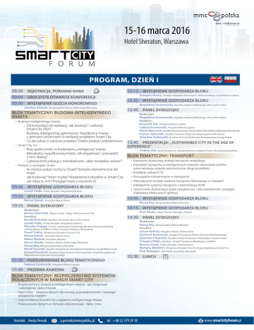 15-16 marca 2016 Hotel Sheraton, Warszawa PROGRAM, DZIEŃ I 08:30 REJESTRACJA, PORANNA KAWA 12:15 WYSTĄPIENIE GOSPODARZA BLOKU Grzegorz Hunicz, Dyrektor Wydziału Informatyki i Telekomunikacji, Urząd Miasta Lublina 09:00 UROCZYSTE OTWARCIE KONFERENCJI 12:30 WYSTĄPIENIE GOSPODARZA BLOKU 09:30 WYSTĄPIENIE GOŚCIA HONOROWEGO Magdalena Taczanowska, Dyrektor Sektora Publicznego, Microsoft w Polsce Jarosław Jóźwiak, Wiceprezydent Miasta Stołecznego Warszawy BLOK TEMATYCZNY: BUDOWA INTELIGENTNEGO MIASTA 12:45 PANEL DYSKUSYJNY Moderator: Magdalena Taczanowska, Dyrektor Sektora Publicznego, Microsoft w Polsce Paneliści: Krzysztof Żuk, Prezydent Miasta Lublina Tadeusz Krzakowski, Prezydent Miasta Legnica Marek Wąsowski, Dyrektor Biura Konsorcjum Smart Power Grids Polska, Politechnika Wrocławska Dariusz Jędryczek, Dyrektor Centrum Usług Informatycznych we Wrocławiu Sebastian Grabowski, Dyrektor Centrum Badawczo-Rozwojowego, Orange Polska • Budowa inteligentnego miasta -- Od konsultacji do realizacji. Jak stworzyć i wdrożyć Smart City Plan? -- Budowa inteligentnej aglomeracji. Współpraca miasta z gminami ościennymi w realizacji projektów Smart City -- Co decyduje o sukcesie projektu? Dobre praktyki wdrożeniowe • Smart City 3.0 -- Rola społeczności w budowaniu „inteligencji” miasta -- Mieszkańcy współtworzą miasta. Jak angażować i prowadzić z nimi dialog? -- Cyfrowa komunikacja z mieszkańcami. Jakie narzędzia wybrać? • Korzyści z rozwiązań smart -- Ile można zyskać na byciu Smart? Korzyści ekonomiczne dla miast -- Jak budować Smart markę? Wydarzenia kulturalne w Smart City -- Jak robią to inni? Przegląd miast z wysokim IQ 09:45 WYSTĄPIENIE GOSPODARZA BLOKU Leszek Hołda, Prezes Zarządu, Integrated Solutions 10:00 WYSTĄPIENIE GOSPODARZA BLOKU 13:40 PREZENTACJA: ,,SUSTAINABLE CITY IN THE AGE OF EXPERIENCE” Frédéric Dot, Senior Director ds. rozwoju biznesu w obszarze Smart City, Dassault Systèmes BLOK TEMATYCZNY: TRANSPORT • Kreowanie skutecznej strategii transportu miejskiego • Przyszłość transportu w inteligentnych miastach: sterowanie ruchem, automatyzacja, pojazdy autonomiczne, drogi przyszłości • Przykłady wdrożeń ITS • Rozwiązania niskoemisyjne w transporcie • Alternatywne metody zasilania transportu zbiorowego w miastach • Inteligentne systemy transportu a komunikacja M2M • Uprawnienie komunikacji przez mieszkańców i dla mieszkańców: przegląd najbardziej efektywnych aplikacji 14:00 WYSTĄPIENIE GOSPODARZA BLOKU Michał Zaleski, Prezydent Miasta Toruń Maciej Bluj, Wiceprezydent Miasta Wrocław 10:15 PANEL DYSKUSYJNY Moderator: Bartosz Dominiak, Ekspert rynku / bloger, Warsaw Smart City Paneliści: Ronald Binkofski, Dyrektor Generalny, Microsoft w Polsce Leszek Hołda, Prezes Zarządu, Integrated Solutions Mirosław Proppé, Partner, szef zespołu doradczego dla administracji publicznej i infrastruktury w KPMG w Polsce i Europie Środkowo-Wschodniej Paweł Prokop, Wiceprezes Zarządu, Comarch S.A. Michał Zaleski, Prezydent Miasta Toruń Robert Biedroń, Prezydent Słupska Marcin Wojdat, Sekretarz Miasta Stołecznego Warszawy Maciej Bluj, Wiceprezydent Miasta Wrocław Marek Trznadel, Dyrektor Wydziału ds. Zarządzania Projektami, Urząd Miasta Łodzi Ryszard Rumiński, Dyrektor Departamentu Informatyzacji, Urząd Marszałkowski Województwa Kujawsko-Pomorskiego 11:30 PODSUMOWANIE BLOKU TEMATYCZNEGO 14:15 WYSTĄPIENIE GOSPODARZA BLOKU Piotr Głaska, Senior Product Manager, Huawei 14:30 PANEL DYSKUSYJNY Moderator: Maciej Bluj, Wiceprezydent Miasta Wrocław Paneliści: Janusz Kubicki, Prezydent Miasta Zielona Góra Ziemowit Borowczak, Zastępca Prezydenta Miasta Ostrowa Wielkopolskiego Sylwester Chojnacki, Dyrektor Działu Produktów i Rozwiązań, Huawei Polska Grzegorz Malec, Dyrektor, Zarząd Transportu Miejskiego w Lublinie Mariusz Gasek, Prezes Zarządu, Solid Solutions Martyna Abendrot, Wiceprezes Zarządu Star ITS, Grupa Kapitałowa Qumak S.A. Piotr Bardadyn, Szef Działu Sprzedaży, Neurosoft 15:30 LUNCH Tadeusz Krzakowski, Prezydent Miasta Legnica 11:45 PRZERWA KAWOWA BLOK TEMATYCZNY: BEZPIECZEŃSTWO SYSTEMÓW POŁĄCZONYCH W RAMACH SMART CITY • Bezpieczeństwo danych w inteligentnym mieście - jak integrować i udostępniać dane miejskie • Open Data – otwarcie danych dla rozwoju przedsiębiorczości i lepszego zarządzania miastem • Internet Rzeczy kluczem do urządzenia Inteligentnego Miasta • Przetwarzanie danych w chmurze obliczeniowej – fakty i mity Kontakt: Aneta Pernak [email protected] tel. +48 22 379 29 18 www.smartcityforum.pl 15-16 marca 2016 Hotel Sheraton, Warszawa PROGRAM, DZIEŃ II 08:30 REJESTRACJA, PORANNA KAWA Paneliści: Sylwia Bilska, Członek Zarządu PayU, Commercial Director PayU Central Europe Adrian Kurowski, Dyrektor Visa Europe w Polsce Andrzej Sadowski, Prezydent, Centrum im. Adama Smitha Tadeusz Ferenc, Prezydent Miasta Rzeszów Joanna Smolska, Zastępca Dyrektora Biura Polityki Długu i Zarządzania Płynnością, Urząd BLOK TEMATYCZNY: MIASTA PRZYSZŁOŚCI: ZDROWA, KOMFORTOWA I PRODUKTYWNA PRZESTRZEŃ MIEJSKA • Od Smart Building do Smart City - inteligencja miasta zaczyna się od pojedynczego budynku -- Jak smart building może wpłynąć na oszczędności w budżetach miast? -- Jak smart city może oddziaływać na efektywność społeczną i zdrowie mieszkańców miast? • Smart Integrated Management - zintegrowane zarządzanie przestrzenią miejską -- Energy Smart Solutions - efektywność energetyczna inteligentnego miasta -- Monitorowanie zużycia mediów w czasie rzeczywistym – Smart Cost Management -- Jak świadomie zarządzać minimalizacją kosztów eksploatacyjnych? 09:00 PREZENTACJA: ,,CZY MIASTO POWINNO BYĆ SMART, CZY INTELLIGENT?” Andrzej Grabowski, Hewlett Packard Enterprise Solutions Architect 09:15 PREZENTACJA: „WYKORZYSTANIE BIG DATA W ROZWOJU MIASTA” Miasta Stołecznego Warszawa Marcin Urban, Skarbnik Miasta Wrocławia Sebasti