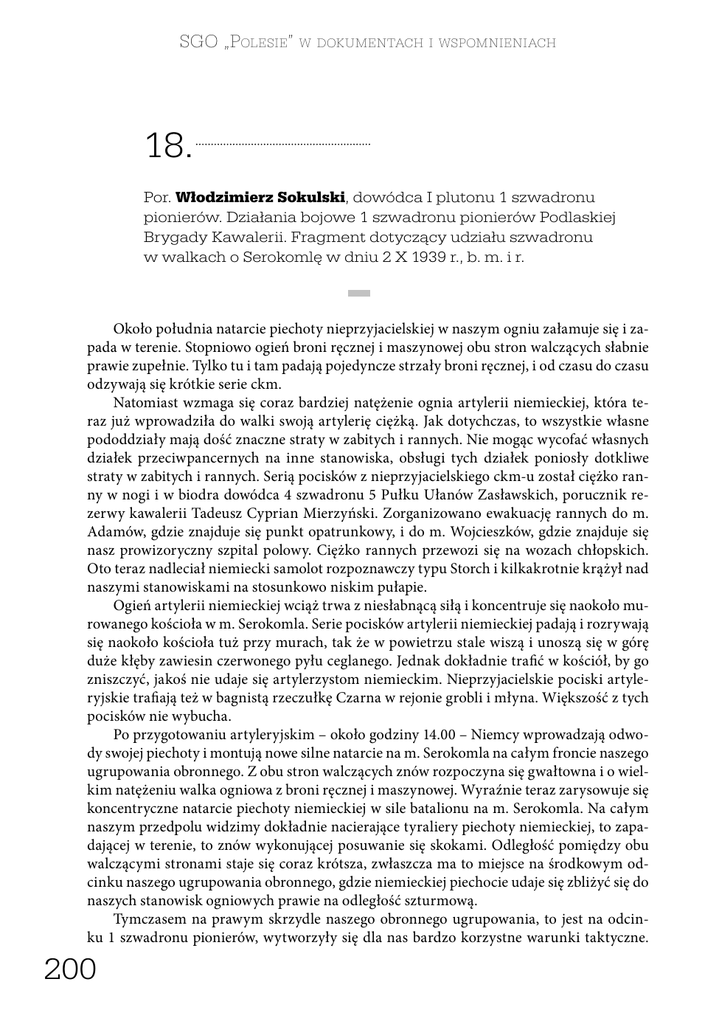 SGO „Polesie” w dokumentach i wspomnieniach 18. Por. Włodzimierz Sokulski, dowódca I plutonu 1 szwadronu pionierów. Działania bojowe 1 szwadronu pionierów Podlaskiej Brygady Kawalerii. Fragment dotyczący udziału szwadronu w walkach o Serokomlę w dniu 2 X 1939 r., b. m. i r. Około południa natarcie piechoty nieprzyjacielskiej w naszym ogniu załamuje się i zapada w terenie. Stopniowo ogień broni ręcznej i maszynowej obu stron walczących słabnie prawie zupełnie. Tylko tu i tam padają pojedyncze strzały broni ręcznej, i od czasu do czasu odzywają się krótkie serie ckm. Natomiast wzmaga się coraz bardziej natężenie ognia artylerii niemieckiej, która teraz już wprowadziła do walki swoją artylerię ciężką. Jak dotychczas, to wszystkie własne pododdziały mają dość znaczne straty w zabitych i rannych. Nie mogąc wycofać własnych działek przeciwpancernych na inne stanowiska, obsługi tych działek poniosły dotkliwe straty w zabitych i rannych. Serią pocisków z nieprzyjacielskiego ckm-u został ciężko ranny w nogi i w biodra dowódca 4 szwadronu 5 Pułku Ułanów Zasławskich, porucznik rezerwy kawalerii Tadeusz Cyprian Mierzyński. Zorganizowano ewakuację rannych do m. Adamów, gdzie znajduje się punkt opatrunkowy, i do m. Wojcieszków, gdzie znajduje się nasz prowizoryczny szpital polowy. Ciężko rannych przewozi się na wozach chłopskich. Oto teraz nadleciał niemiecki samolot rozpoznawczy typu Storch i kilkakrotnie krążył nad naszymi stanowiskami na stosunkowo niskim pułapie. Ogień artylerii niemieckiej wciąż trwa z niesłabnącą siłą i koncentruje się naokoło murowanego kościoła w m. Serokomla. Serie pocisków artylerii niemieckiej padają i rozrywają się naokoło kościoła tuż przy murach, tak że w powietrzu stale wiszą i unoszą się w górę duże kłęby zawiesin czerwonego pyłu ceglanego. Jednak dokładnie trafić w kościół, by go zniszczyć, jakoś nie udaje się artylerzystom niemieckim. Nieprzyjacielskie pociski artyleryjskie trafiają też w bagnistą rzeczułkę Czarna w rejonie grobli i młyna. Większość z tych pocisków nie wybucha. Po przygotowaniu artyleryjskim – około godziny 14.00 – Niemcy wprowadzają odwody swojej piechoty i montują nowe silne natarcie na m. Serokomla na całym froncie naszego ugrupowania obronnego. Z obu stron walczących znów rozpoczyna się gwałtowna i o wielkim natężeniu walka ogniowa z broni ręcznej i maszynowej. Wyraźnie teraz zarysowuje się koncentryczne natarcie piechoty niemieckiej w sile batalionu na m. Serokomla. Na całym naszym przedpolu widzimy dokładnie nacierające tyraliery piechoty niemieckiej, to zapadającej w terenie, to znów wykonującej posuwanie się skokami. Odległość pomiędzy obu walczącymi stronami staje się coraz krótsza, zwłaszcza ma to miejsce na środkowym odcinku naszego ugrupowania obronnego, gdzie niemieckiej piechocie udaje się zbliżyć się do naszych stanowisk ogniowych prawie na odległość szturmową. Tymczasem na prawym skrzydle naszego obronnego ugrupowania, to jest na odcinku 1 szwadronu pionierów, wytworzyły się dla nas bardzo korzystne warunki taktyczne. 200 R el ac j e: W ł o d z i m ier z S ok u l s k i Rozpoznaliśmy bowiem, że lewe skrzydło nacierającej piechoty niemieckiej w pewnym punkcie terenu kończy się, jest wiszące, otwarte. W związku z tym rozpoznanym położeniem, nasunęła się myśl przeprowadzenia manewru taktycznego w sensie obejścia tego wiszącego nieprzyjacielskiego lewego skrzydła i wykonania przeciwnatarcia na bok atakującego nas batalionu piechoty niemieckiej. Myśl ta stawała się dla nas tym bardziej realna, że tuż na prawo i cokolwiek do przodu od stanowisk obronnych 1 szwadronu pionierów, konfiguracja terenu jest taka, że całkowicie umożliwia skryte wyjście na bok wiszącego lewego skrzydła nieprzyjaciela i wykonania tak pomyślanego manewru zaczepnego. Tylko takim sposobem, w wytwarzającej się dla nas krytycznej sytuacji bitwy o m. Serokomla, mogliśmy wziąć inicjatywę taktyczną we własne ręce i postawić nacierającego nieprzyjaciela w trudnym, niebezpiecznym i bardzo przykrym położeniu dla niego. Znajdujący się teraz właśnie na odcinku 1 szwadronu pionierów mjr. Bronisław Korpalski8 pobrał decyzje wykonania zwrotu zaczepnego i wydał rozkaz, by 1 szwadron pionierów z drużyną ckm wykonał obejście wiszącego lewego skrzydła nacierającej piechoty niemieckiej i przeprowadził przeciwnatarcie na bok atakującego nas batalionu niemieckiego. Był to najwyższy czas, żeby w ten sposób wziąć inicjatywę bojową we własne ręce; tym bardziej że – jak już wspomniałem – ukształtowanie terenu na zamierzonym kierunku wykonania manewru oskrzydlającego sprzyjało 1 szwadronowi pionierów do wykonania tak pomyślanego zadania. Jeśli chodzi o profil terenu, poprzez który 1 szwadron pionierów miał wykonać manewr oskrzydlający taktyczny, to da się on scharakteryzować następująco: w prawo i cokolwiek w skos do przodu – począwszy od prawego skrzydła stanowisk ogniowych szwadronu pionierów, mniej więcej pod kątem 45° w stosunku do całości zarysu frontu naszej linii obronnej – przebiegała fałda terenu łagodnie opadająca w kierunku torfiastej, porośniętej krzakami doliny rzeczułki Czarna; ta fałda terenu była długości około 200 metrów i kończyła się w terenie dominującym wzniesieniem, które również opadało swoim stokiem w kierunku tejże torfiastej doliny. Zajęcie tego dominującego wzniesienia i usadowienie się na nim dawało nam bardzo dobrą podstawę wyjściową do natarcia na bok lewego skrzydła nacierającego koncentrycznie na m. Serokomla batalionu piechoty niemieckiej. Toteż w wykonaniu tego zwrotu zaczepnego manewrem taktycznym na odcinku obronnym 1 szwadronu pionierów, na dotychczasowych swoich stanowiskach ogniowych pozostał tylko pluton ckm pod dowództwem kapitana Straży Granicznej 