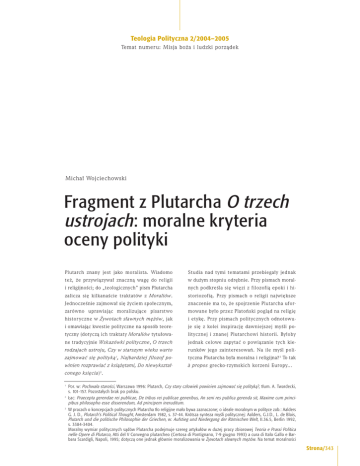 Teologia Polityczna 2/2004–2005 Temat numeru: Misja bo˝a i ludzki porzàdek Micha∏ Wojciechowski Fragment z Plutarcha O trzech ustrojach: moralne kryteria oceny polityki Plutarch znany jest jako moralista. Wiadomo Studia nad tymi tematami przebiega∏y jednak te˝, ˝e przywiàzywa∏ znacznà wag´ do religii w du˝ym stopniu odr´bnie. Przy pismach moral- i religijnoÊci; do „teologicznych” pism Plutarcha nych podkreÊla si´ wi´zi z filozofià epoki i hi- zalicza si´ kilkanaÊcie traktatów z Moraliów. storiozofià. Przy pismach o religii najwi´ksze JednoczeÊnie zajmowa∏ si´ ˝yciem spo∏ecznym, znaczenie ma to, ˝e spojrzenie Plutarcha ufor- zarówno uprawiajàc moralizujàce pisarstwo mowane by∏o przez Platoƒski poglàd na religi´ histor yczne w ˚ywotach s∏awnych m´˝ów, jak i etyk´. Przy pismach politycznych odnotowu- i omawiajàc kwestie polityczne na sposób teore- je si´ z kolei inspiracj´ dawniejszej myÊli po- tyczny (dotyczà ich traktaty Moraliów tytu∏owa- litycznej i znanej Plutarchowi historii. By∏oby ne tradycyjnie Wskazówki polityczne, O trzech jednak celowe zapytaç o powiàzanie tych kie- rodzajach ustroju, Czy w starszym wieku warto runków jego zainteresowaƒ. Na ile myÊl poli- zajmowaç si´ politykà 1, Najbardziej filozof po- tyczna Plutarcha by∏a moralna i religijna? 3 To tak winien rozprawiaç z ksià˝´tami, Do niewykszta∏- ∫ propos grecko-rzymskich korzeni Europy... 2 conego ksi´cia) . 1 2 3 Por. w: Pochwała starości , Warszawa 1996: Plutarch, Czy stary człowiek powinien zajmować się polityką? , tłum. A. Twardecki, s. 101-157. Pozostałych brak po polsku. Łac: Praecepta gerendae rei publicae, De tribus rei publicae generibus, An seni res publica gerenda sit, Maxime cum principibus philosopho esse disserendum, Ad principem ineruditum . W pracach o koncepcjach politycznych Plutarcha tło religijne mało bywa zaznaczone; o ideale moralnym w polityce zob.: Aalders G. J. D., Plutarch’s Political Thought , Amsterdam 1982, s. 37-44. Krótsza synteza myśli politycznej: Aalders, G.J.D., L. de Blois, Plutarch und die politische Philosophie der Griechen , w: Aufstieg und Niedergang der Römischen Welt , II.36.5, Berlin 1992, s. 3384-3404. Moralny wymiar politycznych sądów Plutarcha podejmuje szereg artykułów w dużej pracy zbiorowej Teoria e Prassi Politica nelle Opere di Plutarco, Atti del V Convegno plutarcheo (Certosa di Pontignano, 7-9 giugno 1993) a cura di Italo Gallo e Barbara Scardigli, Napoli, 1995; dotyczą one jednak głównie moralizowania w Żywotach sławnych mężów . Na temat moralności Strona/343 Teologia Polityczna 2/2004–2005 Temat numeru: Misja bo˝a i ludzki porzàdek Jest to oczywiÊcie temat na du˝à rozpraw´. z typowymi dla tego autora porównaniami mu- Poni˝ej zajm´ si´ tylko jego wycinkiem, zwra- zycznymi (jest ich a˝ czter y). Dok∏adniejsze cajàc uwag´ na moralne kr yteria oceny spraw datowanie nie jest mo˝liwe. Plutarch urodzi∏ polityki, ujawnione przez niewielkie pismo si´ przed rokiem 50 po Chr., zmar∏ po 120 ro- Plutarcha O trzech ustrojach. Poniewa˝ nie by∏ ku. Autor ytatywny ton, idealizacja monarchy on dotàd t∏umaczony na polski, poni˝ej po pro- i wp∏yw Platoƒski sugerujà nieco starszy wiek stu przedstawiam ten utwór w swoim przek∏a- autora, a wi´c epok´ Nerwy (96-98) i Trajana dzie 4, z notami i z wprowadzeniem, w któr ym (98-117). Pod wzgl´dem formy jest to mowa. uwzgl´dniono powy˝sze pytanie. Utwór ten, zawarty w Moraliach 826A-827C, znany jest pod ∏aciƒskim tytu∏em De tribus rei Adresaci nie sà wskazani, mog∏a to byç np. grupa wybitniejszych obywateli jakiegoÊ miasta greckiego. publicae generibus (O trzech rodzajach rzeczy- Wymienione przez Plutarcha trzy ustroje (mo- pospolitej) i De unius in res publica dominatione narchia, ar ystokratyczna oligarchia i demokra- (O przewadze jednego w rzeczypospolitej) oraz cja) i trzy ich deformacje (tyrania, rzàdy klik greckim Peri monarchias kai demokratias kai mo˝nych, ochlokracja) stanowià najpopular- oligarchias (O monarchii, demokracji i oligar- niejszà klasyfikacj´ staro˝ytnà 6. Za najlepszy chii). Znajduje si´ on na 53. miejscu klasycz- ustrój uznano tu monarchi´. Autor wzorowa∏ si´ nego wydania Moraliów Stephanusa (Par y˝ na Herodocie, którego wprost wymienia (826E), 1572), na 48. w bizantyjskim katalogu Planu- oraz na Platonie 7; natomiast Ar ystoteles pre- desa (ok. 1300 roku). KrótkoÊç, niekompletne ferowa∏ ustrój mieszany 8. Warunki Cesarstwa potraktowanie tematu, raptowny poczàtek i za- Rzymskiego sprzyja∏y wyborowi monarchii; koƒczenie jednoznacznie dowodzà, ˝e jest to chocia˝ w czasach Plutarcha istnia∏a ambitna fragment wi´kszej ca∏oÊci, prawdopodobnie ar ystokracja senatorska, pami´tano te˝ o ide- przechowany w jakiejÊ antologii, a potem do- ale republikaƒskim. Stawiano równie˝ pytanie ∏àczony do kolekcji pism Plutarcha. Niewielkie o system rzàdów na poziomie lokalnym, przy rozmiar y sprawi∏y, ˝e nie bywa on przedmio- czym sam Plutarch myÊla∏ przewa˝nie kategoria- tem osobnych studiów. Przyczyni∏a si´ te˝ do mi miasta-paƒstwa (polis) i idealizowa∏ ustrój tego wyraêna zale˝noÊç od koncepcji Platona dawnej Sparty (˝ywot Likurga). oraz to, ˝e autorstwo Plutarcha by∏o kwestionowane 5. Najistotniejszy wydaje si´ tu jednak nie wynik, lecz przes∏anki argumentacji. Zaczyna autor Cz´Êciej jednak jest ono uznawane; zresztà swojà mow´ od powo∏ania si´ na podpowiedê nawet jeÊli nie jest to jego pismo, treÊç pozo- ze strony „cnoty politycznej” (826B), która staje godna uwagi (staro˝ytne êród∏a anonimo- zresztà przemawia s∏owami Pindara. Jest to, we bywajà lekcewa˝one przez badaczy, ale te˝ oczywiÊcie, chwyt retor yczny, ale Êwiadczy on, mogà byç wa˝ne). Na Plutarcha wskazuje inspi- ˝e tr wa∏a postawa moralna ma byç wzgl´dem racja Platoƒska oraz uczony, doÊç bogaty styl, z