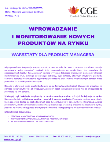 20 - 21 sierpnia 2015r, WARSZAWA Hotel Mercure Warszawa Centrum WARSZTATY WPROWADZANIE I MONITOROWANIE NOWYCH PRODUKTÓW NA RYNKU WARSZTATY DLA PRODUCT MANAGERA Międzynarodowe korporacje często pracują w ten sposób, że wraz z nowym produktem zostaje opracowany jeden „szablon” strategii jego wprowadzenia na rynek, który jest rozsyłany do poszczególnych krajów. Ten „szablon” zawiera wytyczne dotyczące kluczowych elementów strategii marketingowej, m.in. definicje docelowego odbiorcy, jego potrzeb, głównych atrybutów produktu i korzyści odbiorcy oraz kluczowe argumenty sprzedażowe. Brak lokalnej weryfikacji tych założeń może prowadzić do porażki produktu na rynku. Dlatego w pierwszej części szkolenia skupimy się na formułowaniu strategii dla nowego produktu, co pomoże lepiej weryfikować obowiązujący „szablon”. Jeżeli takiego szablonu nie ma, to umiejętności te przydadzą się tym bardziej. W drugiej części szkolenia skupimy się na monitorowaniu produktu, który już funkcjonuje na rynku. Kluczowa będzie tu ilościowa analiza rynku, jak i samego produktu. Proponuję metodę case study, która zapewnia dostęp do rozbudowanych case-ów obfitujących w dane rynkowe i finansowe. Analiza przypadków, dzięki konieczności analizy sytuacji nieznanego wcześniej produktu na nieznanym rynku, pozwala na rozwój umiejętności analitycznych i myślenia strategicznego a nie tylko zdobywanie wiedzy. NAJWAŻNIEJSZE ZAGADNIENIA: • • • STRATEGIA MARKETINGOWA NOWEGO PRODUKTU TAKTYCZNY PLAN WPROWADZANIA NOWEGO PRODUKTU NA RYNEK MONITOROWANIE NOWEGO PRODUKTU NA RYNKU Tel: 22 651 80 75, www.certge.pl kom: 604 152 181, fax: 22 203 40 52, e-mail: [email protected] WPROWADZANIE I MONITOROWANIE NOWYCH PRODUKTÓW NA RYNKU 20 – 21 SIERPNIA 2015r. WARSZAWA PROGRAM I. STRATEGIA MARKETINGOWA NOWEGO PRODUKTU 1. Analiza rynkowa Analiza otoczenia rynkowego metodą STEEPLE Określanie fazy życia produktu Określanie pojemności rynku Analiza konkurentów i przewaga konkurencyjna Identyfikacja przewag konkurencyjnych w oparciu o dostarczane korzyści Analiza consumer insight Kluczowe bariery akceptacji korzyści produktu Analiza segmentów odbiorców Podstawowe wskaźniki w analizie rynku: penetracja rynku, satysfakcja klientów, lojalność klientów, RFM, NPS 2. Strategia wejścia na rynek, w tym propozycja wartości Podstawowe strategie wzrostu Model skłonności do zakupu Wybór docelowego rynku Pozycjonowanie nowego produktu na rynku UPS i Brand Positioning Statement Idea propozycji wartości Model „huśtawki” Model „cecha – przewaga – korzyść” Drabina korzyści Zarządzanie kosztami odbiorcy II. TAKTYCZNY PLAN WPROWADZANIA NOWEGO PRODUKTU NA RYNEK 2. Polityka cenowa Kategorie nabywców ze względu na cenę Polityka cenowa portfela Akceptacja nowości a cena produktu Jak się chronić przed konkurencją cenową? Co się dzieje w dynamicznym środowisku cenowym? Strategie cenowe dla nowego produktu 3. Plan promocji Trzy taktyki komunikacyjne odpowiadające trzem typom nowości Akceptacja nowości a promocja Jakie aspekty produktu komunikować? Jak budować wiarygodność korzyści? Lista sprawdzająca jakość komunikatu Momenty prawdy a punkty kontaktu Główne punkty kontaktu klienta z produktem w cyklu doświadczenia Analiza łańcucha wartości III. MONITOROWANIE NOWEGO PRODUKTU NA RYNKU Monitorowanie akceptacji produktu na rynku Tablica wskaźników do monitorowania nowego produktu na rynku Ocena wskaźników Kwantyfikacja emocji, czyli zastosowanie pomiaru biometrycznego w ocenie nowego produktu, który pomaga m.in. w odkryciu, które aspekty produktu stanowią motywatory zakupowe a które są tzw. czynnikami higienicznymi 1. Portfel produktów i plan cyklu życia Model akceptacji nowości z punktu widzenia rozwoju nowego produktu Wykorzystanie cyklu życia produktu w planowaniu portfela produktów Metody wydłużania cyklu życia produktu Strategie produktu w ramach relacji wartości do kosztów Poszerzanie portfela produktów Tel: 22 651 80 75, www.certge.pl kom: 604 152 181, fax: 22 203 40 52, e-mail: [email protected] WPROWADZANIE I MONITOROWANIE NOWYCH PRODUKTÓW NA RYNKU 20 – 21 SIERPNIA 2015r. WARSZAWA PROWADZĄCY JACEK POGORZELSKI SZKOLENIE ZAMKNIĘTE posiada tytuł doktora nauk ekonomicznych w zakresie nauk o zarządzaniu, ukończony kurs The Advanced Certificate in Marketing w The Chartered Institute of Marketing w Londynie, dyplom studiów podyplomowych z zarządzania i marketingu. Jest właścicielem i dyrektorem zarządzającym firmy doradztwa marketingowego PrimeCode. Pomaga firmom prowadzić marketing XXI wieku, czyli marketing innowacyjny, który w centrum zainteresowania stawia wartość klienta. Jest konsultantem w zakresie strategii marketingowej , brandingu, zarządzania marką i doświadczeniem klienta. Zajmuje się również skutecznością osobistą i rozwojem potencjału ludzi. Ponadto zajmuje się marketingiem wartości, marketingiem międzykulturowym, marketingiem terytorialnym. Był wykładowcą programu Warsaw Executive MBA Szkoły Głównej Handlowej oraz Uniwersytetu Minnesoty. Prowadził również zajęcia z zakresu zarządzania marketingiem w ramach programu MBA The Carlson School of Management Uniwersytetu Minnesoty w Minneapolis. Od wielu lat prowadzi zajęcia z zakresu komunikacji marketingowej, zarządzania marką, analizy marketingowej, marketingu wartości oraz innowacyjności w ramach certyfikowanych programów The Chartered Institute of Marketing w Londynie. Jest także trenerem szkoleń z zakresu zarządzania i marketingu. Współpracuje z ministerstwami oraz samorządami w zakresie polityki promocji. Przez siedem lat był ekspertem Ministerstwa Rozwoju Regionalnego w zakresie promocji funduszy europejskich. Należy do amerykańskiego stowarzyszenia Customer Experience Professionals Association (CXPA) skupiającego specjalistów z zakresu zarządzania doświadczeniem klienta. Karierę zawodową zaczyn