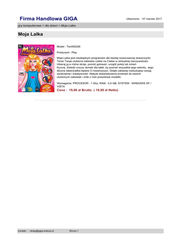 Firma Handlowa GIGA Utworzono : 07 marzec 2017 gry komputerowe > dla dzieci > Moja Lalka Moja Lalka Model : Tan000226 Producent : Play Moja Lalka jest niezbędnym programem dla każdej nowoczesnej dziewczynki. Teraz Twoja ulubiona zabawka czeka na Ciebie w wirtualnej rzeczywistości. Ubieraj ją w różne stroje, pomóż gotować, urządź pokój lub zmień fryzurę. Zwiedź uroczy domek dla lalek, by poznać wszystkie jego sekrety. Jego śliczna właścicielka będzie Ci towarzyszyć. Dzięki zabawię rozbudujesz swoją wyobraźnie i kreatywność. Nabyte doświadczenia przenieś do swoich ulubionych zabawek i zrób z nich prawdziwe modelki. Wymagania: PROCESOR : 1 Ghz, RAM : 0,5 GB, SYSTEM : WINDOWS XP / VISTA Cena : 19,90 zł Brutto ( 19,90 zł Netto) kontakt : - [email protected] Strona 1