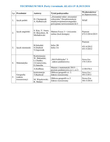 TECHNIKUM NR 8 .Porty i terminale. KLASA IV B.2015/2016 Autorzy Tytuł podręcznika Wydawnictwo/ nr dopuszczenia Język polski D. Chemperek A. Kalbarczyk „Zrozumieć tekst- zrozumieć człowieka” Dwudziestolecie międzywojenne(awangarda)powojenna nowoczesność.kl.3 WSiP Język angielski S. Kay, V. Jones, Matura Focus 3 + ćwiczenia D. Brayshaw, B. online (kod dostępu) Michałowski Lp. Przedmiot 1. 2. Pearson 672/3/2014/2015 Pearson 3. 4. Język niemiecki Matematyka B.Sekulski N.Drabich T.Gajownik Kontynuacja: W. Babiański, L.Chańko, J.Czarnowska, G.Janocha A.Kiełbasa 5. Geografia (zakres rozszerzony) kontynuacja: T.Rachwał M. Więckowski, R. Malarz Infos 2B Infos 3A „MATeMAtyka” 3 zakres podstawowy Matura z matematyki 2015-… poziom podstawowy.cz.1, cz.2. Oblicza geografii cz. 2. Zakres rozszerzony Oblicza geografii cz.3. Zakres rozszerzony 451/4/2012 451/5/2012 Nowa Era 378/3/2014 LUBATKA Nowa Era / 501/2/2012 Nowa Era 501/3/2014