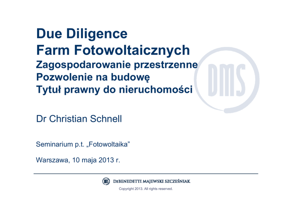 Due Diligence Farm Fotowoltaicznych Zagospodarowanie przestrzenne Pozwolenie na budowę Tytuł prawny do nieruchomości Dr Christian Schnell Seminarium p.t. „Fotowoltaika” Warszawa, 10 maja 2013 r. Copyright 2009. All rights reserved. Copyright 2013. All rights reserved. Spis treści 01 > Studium 02 > Miejscowy Plan Zagospodarowania Przestrzennego - MPZP 03 > Decyzja o warunkach zabudowy - WZ 04 > Ocena oddziaływania na środowisko 05 > Pozwolenie na budowę 06 > Tytuł prawny do nieruchomości 07 > Kontakt Copyright 2009. All rights reserved. Copyright 2013. All rights reserved. Studium Copyright 2009. All rights reserved. Copyright 2013. All rights reserved. 01 > Studium (I) 1. Podstawowe informacje - Studium sporządza się dla całego obszaru w granicach administracyjnych gminy. - Ustalenia studium są wiążące dla sporządzaniu planów miejscowych. - Studium nie jest aktem prawa miejscowego - jego postanowienia w założeniu nie mogą wpływać na sytuację prawną mieszkańców gminy i inwestorów, treść studium w znacznym zakresie determinuje jednak ustalenia MPZP, dlatego oddziaływują - co najmniej pośrednio - na sferę uprawnień i obowiązków podmiotów działających na terenie gminy. Copyright 2009. All rights reserved. Copyright 2013. All rights reserved. organów gminy przy 01 > Studium (II) 2. Studium a postanowienia dotyczące OZE Jeżeli na obszarze gminy przewiduje się: - wyznaczenie obszarów, na których rozmieszczone będą urządzenia wytwarzające energię z odnawialnych źródeł o mocy przekraczającej 100 kW, - wyznaczenie ich stref ochronnych związanych z ograniczeniami w zabudowie oraz zagospodarowaniu i użytkowaniu terenu; -> w studium ustala się ich rozmieszczenie – art. 10 ust. 2a ustawy z 27 marca 2003 r. o zagospodarowaniu i planowaniu przestrzennym. Copyright 2009. All rights reserved. Copyright 2013. All rights reserved. 01 > Studium (III) Brak odpowiednich postanowień studium dot. rozmieszczenia urządzeń wytwarzających energię z odnawialnych źródeł energii o mocy przekraczającej 100 kW, uniemożliwia uchwalenie MPZP przewidującego lokalizacje takich urządzeń. Konieczna jest (przed uchwaleniem MPZP) uprzednia odpowiednia zmiana studium. Prace nad zmianą studium mogą – co najmniej w pewnym zakresie – być prowadzone równolegle z pracami nad uchwaleniem lub zmianą MPZP. Postanowienia Studium nie mają natomiast formalnie wpływu na treść decyzji o warunkach zabudowy. Copyright 2009. All rights reserved. Copyright 2013. All rights reserved. 01 > Studium (IV) Niedopuszczalne jest uzgadnianie projektu decyzji w sprawie ustalenia warunków zabudowy z treścią studium uwarunkowań i kierunków zagospodarowania przestrzennego gminy. Akt ten nie jest przepisem prawa miejscowego, a więc nie ma charakteru powszechnie obowiązującego i nie może być podstawą nakładania obowiązków lub uprawnień. Każda gmina musi obligatoryjnie uchwalić studium uwarunkowań i kierunków zagospodarowania przestrzennego, lecz akt ten wiąże jedynie organy planistyczne gminy przy uchwalaniu miejscowego planu zagospodarowania przestrzennego. (wyrok WSA w Szczecinie z 11 kwietnia 2012, sygn. akt II SA/Sz 134/12) Copyright 2009. All rights reserved. Copyright 2013. All rights reserved. Miejscowy Plan Zagospodarowania Przestrzennego - MPZP Copyright 2009. All rights reserved. Copyright 2013. All rights reserved. 02 > Miejscowy Plan Zagospodarowania Przestrzennego - MPZP (I) 1. Podstawowe informacje: - Podstawowy instrument planistyczny. - Akt prawa miejscowego zawierający wiążące dla jednostek ustalenia dotyczące przeznaczenia terenów oraz określenie sposobów ich zagospodarowania i zabudowy (cel publiczny). - Uchwalany przez radę gminy. Projekt przygotowuje wójt (burmistrz, prezydent) – w praktyce uprawnieni urbaniści działający na zlecenie gminy. Copyright 2009. All rights reserved. Copyright 2013. All rights reserved. 02 > Miejscowy Plan Zagospodarowania Przestrzennego - MPZP (II) 2. W MPZP określa się granice terenów pod budowę urządzeń wytwarzających energię z odnawialnych źródeł energii o mocy przekraczającej 100 kW, oraz granice ich stref ochronnych związanych z ograniczeniami w zabudowie, zagospodarowaniu i użytkowaniu terenu oraz występowaniem znaczącego oddziaływania tych urządzeń na środowisko – art. 15 ust.2 pkt. 3a) ustawy z 27 marca 2003 r. o zagospodarowaniu i planowaniu przestrzennym. Copyright 2009. All rights reserved. Copyright 2013. All rights reserved. Decyzja o warunkach zabudowy Copyright 2009. All rights reserved. Copyright 2013. All rights reserved. 03 > Decyzja o warunkach zabudowy (I) 1. W przypadku braku MPZP zmiana zagospodarowania terenu, polegająca na budowie obiektu budowlanego lub wykonaniu innych robót budowlanych, a także zmiana sposobu użytkowania obiektu budowlanego lub jego części, wymaga uzyskania decyzji o warunkach zabudowy. 2. Uzyskanie decyzji WZ zezwalającej na budowę farmy fotowoltaicznej będzie możliwe jedynie wówczas, gdy na danym terenie nie obowiązuje MPZP. 3. W przypadku obowiązywania MPZP przeznaczającego dany teren na inne cele – np. cele przemysłowe lub budowę infrastruktury technicznej (bez wyraźnego wskazania możliwości lokalizowania urządzeń wytwarzających energię z odnawialnych źródeł energii o mocy przekraczającej 100 kW) - lokalizacja takich urządzeń wymaga przeprowadzenia procedury zmiany MPZP. Copyright 2009. All rights reserved. Copyright 2013. All rights reserved. 03 > Decyzja o warunkach zabudowy (II) 4. Warunki do uzyskania WZ: - decyzja jest zgodna z przepisami odrębnymi (np. z zakresu ochrony środowiska, ochrony zabytków itp.); - istniejące lub projektowane uzbrojenie terenu jest wystarczające dla zamierzenia budowlanego; - teren nie wymaga uzyskania zgody na zmianę przeznaczenia gruntów rolnych i leśnych na cele nierolnicze i nieleśne; Przeznaczenie na cele nierolnicze gruntów klas I-III o zwarty