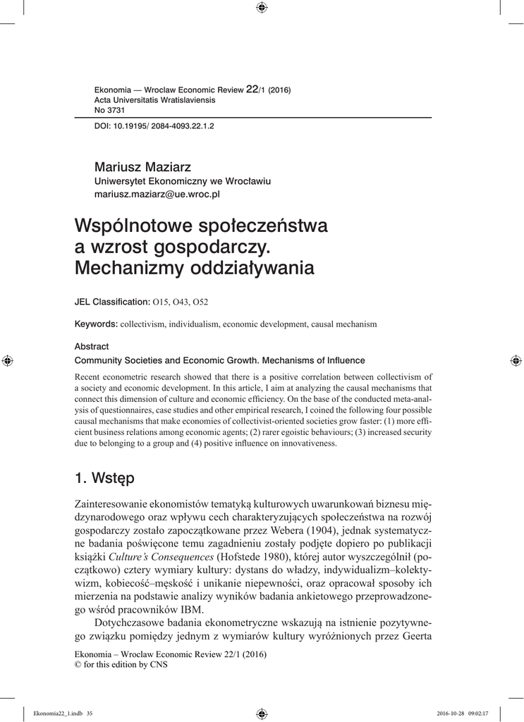 Ekonomia — Wroclaw Economic Review Acta Universitatis Wratislaviensis No 3731 22/1 (2016) DOI: 10.19195/ 2084-4093.22.1.2 Mariusz Maziarz Uniwersytet Ekonomiczny we Wrocławiu [email protected] Wspólnotowe społeczeństwa a wzrost gospodarczy. Mechanizmy oddziaływania JEL Classification: O15, O43, O52 Keywords: collectivism, individualism, economic development, causal mechanism Abstract Community Societies and Economic Growth. Mechanisms of Influence Recent econometric research showed that there is a positive correlation between collectivism of a society and economic development. In this article, I aim at analyzing the causal mechanisms that connect this dimension of culture and economic efficiency. On the base of the conducted meta-analysis of questionnaires, case studies and other empirical research, I coined the following four possible causal mechanisms that make economies of collectivist-oriented societies grow faster: (1) more efficient business relations among economic agents; (2) rarer egoistic behaviours; (3) increased security due to belonging to a group and (4) positive influence on innovativeness. 1. Wstęp Zainteresowanie ekonomistów tematyką kulturowych uwarunkowań biznesu międzynarodowego oraz wpływu cech charakteryzujących społeczeństwa na rozwój gospodarczy zostało zapoczątkowane przez Webera (1904), jednak systematyczne badania poświęcone temu zagadnieniu zostały podjęte dopiero po publikacji książki Culture’s Consequences (Hofstede 1980), której autor wyszczególnił (początkowo) cztery wymiary kultury: dystans do władzy, indywidualizm–kolektywizm, kobiecość–męskość i unikanie niepewności, oraz opracował sposoby ich mierzenia na podstawie analizy wyników badania ankietowego przeprowadzonego wśród pracowników IBM. Dotychczasowe badania ekonometryczne wskazują na istnienie pozytywnego związku pomiędzy jednym z wymiarów kultury wyróżnionych przez Geerta Ekonomia – Wroclaw Economic Review 22/1 (2016) © for this edition by CNS Ekonomia22_1.indb 35 2016-10-28 09:02:17 36 Mariusz Maziarz Hofstedego, indywidualizmem–kolektywizmem, a rozwojem ekonomicznym. Dla przykładu, Maziarz (2015) przedstawił model estymowany dla danych opisujących gospodarki i społeczeństwa krajów Unii Europejskiej, wskazując, iż to nie społeczeństwa indywidualistyczne, lecz wspólnotowe notowały szybszy wzrost gospodarczy. Zorientowanie społeczeństw na wartości wspólnotowe może przyczyniać się nie tylko do wzrostu średniego tempa rozwoju ekonomicznego, lecz również prowadzić do wzrostu bardziej zrównoważonego (por. Czerniak 2012). Celem artykułu jest dokonanie analizy mechanizmów, które powodują, że gospodarki krajów, których społeczeństwa są zorientowane wspólnotowo, rozwijają się szybciej, co pozwoli stwierdzić, czy obserwowana w badaniach ekonometrycznych zależność ma charakter relacji przyczynowej, w której wspólnotowość powoduje szybszy rozwój gospodarczy, czy wynika z przypadkowej korelacji lub istnienia wspólnych determinant orientacji społeczeństwa na wspólnoty oraz tempa rozwoju gospodarczego. 2. Teoretyczny aspekt badań Smith w przełomowym dziele O bogactwie narodów (2007, księga 4, rozdział 2) pisał, że przedsiębiorca, który usiłuje zmaksymalizować zysk, jest prowadzony przez niewidzialną rękę do efektywnego wyniku, który nie był zamierzony. Pomimo pojawiających się w literaturze przedmiotu głosów o wpływie czynników kulturowych na tempo wzrostu gospodarczego już na początku XX wieku (np.: Weber 1904) oraz możliwości wystąpienia problemu koordynacji, gdzie indywidualistyczne zachowania nie prowadzą do optymalnego rezultatu, podobnie jak w sformułowanym przez Flooda i Dreshera tzw. dylemacie więźnia (Marks 2004: 54), kwestia wpływu poziomu indywidualizmu na wzrost gospodarczy nie była rozpatrywana. Przełomem okazała się publikacja Hofstedego (1980: 8), który wstępnie wyróżnił cztery wymiary kultury: dystans do władzy; indywidualizm–kolektywizm; kobiecość–męskość; unikanie niepewności. Co oznacza pojęcie „indywidualizm”? Dołęgowski (2012) definiuje to pojęcie jako system wartości, „w którym jednostka występuje jako wyłączony podmiot własnych decyzji, niekrępowanych przez jakikolwiek autorytet, wspólnotę czy władzę publiczną”. Green et al. (2005) wskazują na powiązanie indywidualizmu z wartościami niezależności, samodzielności, unikatowości, osiągnięć, konkurencji oraz odpowiedzialności za swoje zachowania. Wspólnotowość lub kolektywizm (ang. collectivism; w polskiej literaturze występują oba określenia) jest to nazwa ukuta na określenie społeczeństw, w których przeważa: świadomość wspólnotowa, identyfikacja z grupą i solidarność z jej członkami, zależność emocjonalna, potrzeba stabilizacji, równe dzielenie się przywilejami i obowiązkami i grupowe podejmowanie decyzji (Knack, Keefer 1997). Chen i West (2008) podkreślają wagę przywiązywaną przez członków społeczeństwa wspólEkonomia – Wroclaw Economic Review 22/1 (2016) © for this edition by CNS Ekonomia22_1.indb 36 2016-10-28 09:02:17 Wspólnotowe społeczeństwa a wzrost gospodarczy 37 notowego do jedności z innymi, zorientowania na relacje, poczucia połączenia z innymi oraz relacje interpersonalne. Podobnie Tiessen (1997) wskazuje na bezkonfliktowość wewnątrz grup i harmonijną współpracę jako cechy społeczeństw wspólnotowych. Mimo iż w literaturze przedmiotu można znaleźć odmienne ujęcia (por. Allik, Realo 2004; Wagner 2002), indywidualizm w badaniach ekonomicznych jest najczęściej stawiany w opozycji do wspólnotowości/kolektywizmu. Za takim ujęciem przemawiają dwa argumenty. Po pierwsze, dotychczas skonstruowane miary ujmujące indywidualizm i wspólnotowość nie jako przeciwieństwa, lecz odrębne konstrukty nie zostały wykorzystane do mierzenia poziomu indywidualizmu i wspólnotowości na dużą