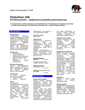 Karta informacyjna nr 446 Disbothan 446 PU-Klarschicht – bezbarwna powłoka poliuretanowa ■ Transparentna, bardzo elastyczna, jednoskładnikowa (1K) tężejąca pod wpływem powietrza powłoka poliuretanowa do zastosowań zewnętrznych. Zawiera rozpuszczalniki. przebarwienia. Nie wpływa to na funkcjonalność powłoki. Opis produktu Zastosowanie: Transparentna, elastyczna powłoka zamykająca (w wersji gładkiej lub antypoślizgowej) do pokrywania barwnych powłok zewnętrznych (obsypanych barwnymi płatkami) wykonanych materiałami: Disboxid 448 Elastikschicht, Disbon 400 BodenFinish, Disbon 404 Acryl-BodenSiegel, Disboxid 449 PU-Deckschicht. Właściwości: Mostkująca rysy. Wysoce przyczepna. Wodoszczelna (nawet przy stałym obciążeniu wodą). Odporna na UV i niekorzystne warunki atmosferyczne. Materiał podstawowy: Spoiwo: jednoskładnikowe, płynne tworzywo sztuczne na bazie poliuretanów, tężejące pod wpływem powietrza. Zawiera rozpuszczalniki. Opakowania: 10 l - wiadro metalowe (dostawa na zamówienie) 5 l - wiadro metalowe 1 l - puszka metalowa Barwa: Transparentna. Pod wpływem promieni UV oraz niekorzystnych warunków atmosferycznych możliwe są niewielkie zmiany w odcieniu oraz zjawisko kredowania powłoki. Barwniki organiczne (np. kawa, czerwone wino, liście) oraz różne związki chemiczne (np. środki dezynfekcyjne, kwasy i in.) mogą powodować Stopień połysku: Błyszczący. Składowanie: Przechowywać w chłodnym i suchym miejscu. W temperaturze 20ºC okres przechowywania materiału w oryginalnie zamkniętych opakowaniach wynosi ok. 6 miesięcy. Materiał przechowywany w niższych temperaturach należy przed rozpoczęciem prac przenieść do pomieszczenia o temp. ok. 20ºC. Dane techniczne: Gęstość: 3 1,0 g/cm Grubość warstwy suchej: 2 na każde 100 g/m ok. 65 µm Współczynnik oporu dyfuzyjnego µ H2O: ok. 4.000 Wydłużenie przy zerwaniu wg DIN 53504: ok. 250% Sposób użycia Odpowiednie podłoża: Barwne powłoki wykonane materiałami: Disboxid 448 Elastikschicht, Disbon 400 BodenFinish, Disbon 404 AcrylBodenSiegel, Disboxid 449 PUDeckschicht. Podłoże musi być nośne, zwarte, stabilne, pozbawione luźnych cząstek, pyłów, olejów, tłuszczów, fragmentów startej gumy oraz innych substancji zmniejszających przyczepność. Cementowe, wzbogacone tworzywem sztucznym masy wyrównawcze należy sprawdzić pod kątem przydatności do pokrycia. Należy wykluczyć możliwość pojawienia się wstępującej kapilarnie wilgoci. Przygotowanie podłoża: Podłoże przygotować tak aby spełniały podane wyżej wymagania. Powłoki dyspersyjne powlekać najwcześniej po upływie 2 dni. W przypadku niskich temperatur czas ten ulega wydłużeniu. Przygotowanie materiału: Materiał jest gotowy do użycia. Przed użyciem dokładnie wymieszać. W razie wykonywanie powłoki antypoślizgowej Disbothan 446 rozcieńczać dodając maks. 10% rozcieńczalnika Disbocolor 499 Verdünner. Użycie innych rozcieńczalników powoduje nieodwracalną kleistość powłoki. Nie ma możliwości rozcieńczenia materiału po stężeniu. Nie ma możliwości rozcieńczania materiału po stwardnieniu. Po rozpoczęciu prac należy zużyć całe opakowanie. Nakładanie: Wałkiem o krótkim włosiu odpornym na działanie rozpuszczalników. Budowa powłok: Powłoki gładkie: Disbothan 446 Powłoki antypoślizgowe: Disbothan 446 (rozcieńczony rozcieńczalnikiem Disbocolor 499) z piaskiem kwarcowym Disboxid 942 lub kulkami szklanymi Glaskugeln 1619*. Zużycie: Powłoka zamykająca na powierzchniach wykonanych materiałami: Disboxid 448 Elastikschicht, Disbon 400 BodenFinish, Disbon 404 Acryl-BodenSiegel, Disboxid 449 PU-Deckschicht. Wykończenie gładkie Wykończenie antypoślizgowe - z piaskiem kwarcowym Disbothan 449 PU-Deckschicht Disboxid 942 Mischquarz Disbocolor 499 Verdünner Wykończenie antypoślizgowe - z kulkami szklanymi Disbothan 449 PU-Deckschicht Ballotini Glaskugeln 1619 * Disbocolor 499 Verdünner ok. 150 ml/m² ok. 150 ml/m² ok. 5 – 8 g/m² ok. 8 - 15 ml/m² ok. 150 ml/m² ok. 15 g/m² ok. 8 - 15 ml/m² Dokładne zużycie można wyłącznie na podstawie bezpośrednio na obiekcie. ustalić próby Przerwy technologiczne: Podczas pracy w temp. + 20 0C przerwy technologiczne pomiędzy nakładaniem kolejnych warstw wynoszą min. 12 godz. Podany czas skraca się w przypadku wyższej temperatury lub wydłuża w przypadku temperatury niższej. Temperatura obróbki: Minimalna temp. obróbki dla materiału, otoczenia i podłoża wynosi 5ºC, maksymalna 30ºC. Względna wilgotność powietrza nie może przekraczać 80%. Nie nakładać podczas (lub w wypadku prawdopodobieństwa wystąpienia) deszczu, przymrozków lub na mocno nagrzanych powierzchniach. Temperatura podłoża musi być zawsze przynajmniej o 3 ºC wyższa od temp. punktu rosy. Czas schnięcia: W temp. +20°C i przy względnej wilgotności powietrza 60% warstwa nadaje się do chodzenia i dalszej obróbki po ok. 12 godzinach. Po 3 dniach powłoka jest odporna na obciążenia mechaniczne, a po 7 dniach całkowicie stwardniała. W niższych temperaturach czas schnięcia ulega wydłużeniu. W czasie wysychania (ok. 12 godz. przy +20°C ) chronić powierzchnię przed działaniem wilgoci, wystąpienie wilgoci w fazie schnięcia może powodować niepożądane zmiany na powierzchni oraz zmniejszyć przyczepność powłoki. Czyszczenie narzędzi: Natychmiast po użyciu i na czas przerw w pracy myć rozcieńczalnikiem Disbocolor 499 Verdünner. Uwaga: kontakt z miedzią lub wodą zawierającą miedź może powodować przebarwienia. Wskazówki bezpieczeństwa Produkt tylko do zastosowań przemysłowych. Produkt łatwopalny. Działa drażniąco na drogi oddechowe. Może powodować uczulenie w kontakcie ze skórą. Działa toksycznie na organizmy wodne, może powodować długo utrzymujące się niekorzystne zmiany w środowisku wodnym. Powtarzające się narażenie może powodować wysuszanie lub pękanie skóry. Pary mogą wywo