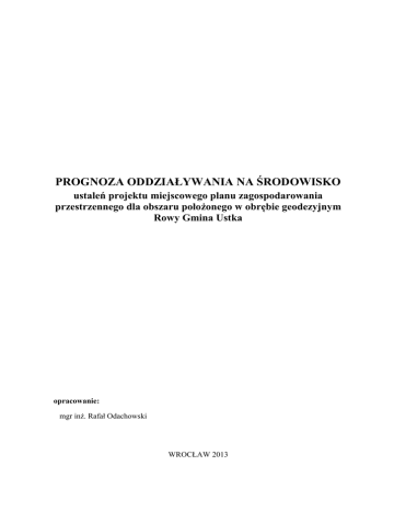 PROGNOZA ODDZIAŁYWANIA NA ŚRODOWISKO ustaleń projektu miejscowego planu zagospodarowania przestrzennego dla obszaru położonego w obrębie geodezyjnym Rowy Gmina Ustka opracowanie: mgr inż. Rafał Odachowski WROCŁAW 2013 Spis treści 1. Wprowadzenie .....................................................................................................................2 1.1. Podstawa prawna, cel i zakres opracowania ....................................................................2 1.2. Wykorzystane materiały i metody pracy .........................................................................2 1.3. Informacje o zawartości, głównych celach projektu MPZP ............................................3 2.Ocena stanu i funkcjonowania środowiska oraz tendencje zmian przy braku realizacji MPZP 4 2.1 Charakterystyka środowiska przyrodniczego ................................................................4 2.2 Prawne formy ochrony przyrody .................................................................................11 2.2. Stan oraz tendencje przeobrażeń środowiska przyrodniczego.....................................16 2.4. Uwarunkowania ekofizjograficzne ..............................................................................21 2.5. Tendencje przeobrażeń przy braku realizacji MPZP .....................................................22 3.Analiza rozwiązań funkcjonalno-przestrzennych i ocena zgodności z uwarunkowaniami ekofizjograficznymi ..................................................................................22 4.Przewidywany wpływ realizacji ustaleń projektu MPZP na środowisko .............................25 4.1. Wpływ realizacji ustaleń projektu planu na poszczególne elementy środowiska .......25 4.2. Oddziaływanie miejscowego planu zagospodarowania przestrzennego poza obszarem opracowania .................................................................................................28 4.3. Informacje o możliwym transgranicznym oddziaływaniu na środowisko ..................28 4.5. Oddziaływanie na formy ochrony przyrody ................................................................29 4.6. Kompleksowa ocena skutków wpływu ustaleń MPZP na środowisko przyrodnicze ..31 5.Przedstawienie rozwiązań mających na celu zapobieganie, ograniczenie lub kompensację przyrodniczą negatywnych oddziaływań na środowisko ...................................32 6. Metody analizy realizacji postanowień projektu planu .......................................................32 7.Informacje o celach ochrony środowiska ustanowionych na szczeblu międzynarodowym, krajowym i lokalnym oraz powiązania z innymi dokumentami .............33 8.Streszczenie...........................................................................................................................34 1 1. Wprowadzenie 1.1. Podstawa prawna, cel i zakres opracowania Obowiązek sporządzenia prognozy oddziaływania na środowisko ustaleń projektu miejscowego planu zagospodarowania przestrzennego wynika z art. 46 ustawy z dnia 3 października 2008 r. o udostępnianiu informacji o środowisku i jego ochronie, udziale społeczeństwa w ochronie środowiska oraz o ocenach oddziaływania na środowisko (Dz. U. z 2008 r. Nr 199 poz. 1227), która jednocześnie ustala zakres merytoryczny opracowania. Zgodnie z art. 17 pkt 4 ustawy z dnia 27 marca 2003 r. o planowaniu i zagospodarowaniu przestrzennym (Dz. U. z 2012 r. poz. 647) prognozę oddziaływania na środowisko sporządza organ opracowujący projekt miejscowego planu zagospodarowania przestrzennego (w skrócie MPZP). Integralną częścią prognozy jest załącznik graficzny. Prognoza obejmuje obszar objęty projektem MPZP (zgodnie z uchwałą Nr XV/150/2008 Rady Gminy Ustka z dnia 25 kwietnia 2008 roku w sprawie przystąpienia do sporządzenia miejscowego planu zagospodarowania przestrzennego dla obszaru położonego w obrębie geodezyjnym Rowy Gmina Ustka) wraz z obszarami pozostającymi w zasięgu oddziaływania wynikającego z realizacji ustaleń planu. Celem sporządzenia prognozy jest ocena skutków (zarówno negatywnych, jak i pozytywnych), jakie mogą wynikać z projektowanego przeznaczenia terenów oraz realizacji ustaleń projektu Studium na środowisko, a w szczególności na różnorodność biologiczną, ludzi, zwierzęta, rośliny, wodę, powietrze, powierzchnię ziemi, krajobraz, klimat, zasoby naturalne oraz zabytki, z uwzględnieniem wzajemnych powiązań między tymi elementami. Prognoza identyfikuje przewidywane zagrożenia dla środowiska, które mogą powstać na terenach znajdujących się w zasięgu oddziaływania wynikającego z realizacji ustaleń Studium. 1.2. Wykorzystane materiały i metody pracy W trakcie przygotowania niniejszego opracowania rozpoznano walory i zasoby przyrodnicze, stan zagospodarowania, walory krajobrazowe, stan środowiska i istniejące zagrożenia oraz uciążliwości dla środowiska i zdrowia człowieka. Przeanalizowano wzajemne powiązania między elementami środowiska, odporność poszczególnych elementów środowiska na degradację oraz dokonano kompleksowej oceny terenu. Wykorzystano opracowania poruszające problematykę ochrony środowiska gminy, materiały kartograficzne, a także przeprowadzono wizję terenu. Zastosowana w prognozie metoda polega na porównaniu aktualnego funkcjonowania obszaru z funkcjonowaniem przewidywanym jako skutek realizacji ustaleń projektu planu miejscowego. Realizacja ustaleń zawartych w projekcie planu miejscowego spowoduje zróżnicowane zmiany w środowisku. Ich charakter, intensywność oraz zasięg uzależniony będzie od faktycznego sposobu zagospodarowania terenu oraz stopnia realizacji zapisów zawartych w projekcie MPZP. Ocenę następstw realizacji ustaleń projektowanego dokumentu dokonano z podziałem ze względu na wpływ na poszczególne elementy środowiska przyrodniczego i antropogenicznego (w tym na zdrowie ludzi) znajdującego s