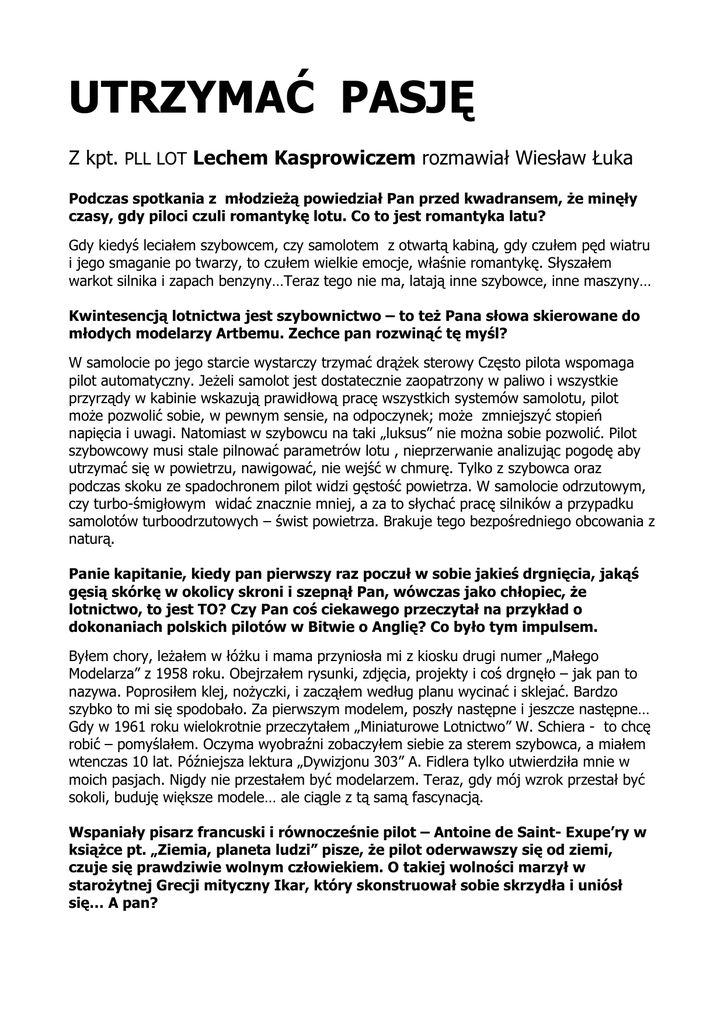 UTRZYMAĆ PASJĘ Z kpt. PLL LOT Lechem Kasprowiczem rozmawiał Wiesław Łuka Podczas spotkania z młodzieŜą powiedział Pan przed kwadransem, Ŝe minęły czasy, gdy piloci czuli romantykę lotu. Co to jest romantyka latu? Gdy kiedyś leciałem szybowcem, czy samolotem z otwartą kabiną, gdy czułem pęd wiatru i jego smaganie po twarzy, to czułem wielkie emocje, właśnie romantykę. Słyszałem warkot silnika i zapach benzyny…Teraz tego nie ma, latają inne szybowce, inne maszyny… Kwintesencją lotnictwa jest szybownictwo – to teŜ Pana słowa skierowane do młodych modelarzy Artbemu. Zechce pan rozwinąć tę myśl? W samolocie po jego starcie wystarczy trzymać drąŜek sterowy Często pilota wspomaga pilot automatyczny. JeŜeli samolot jest dostatecznie zaopatrzony w paliwo i wszystkie przyrządy w kabinie wskazują prawidłową pracę wszystkich systemów samolotu, pilot moŜe pozwolić sobie, w pewnym sensie, na odpoczynek; moŜe zmniejszyć stopień napięcia i uwagi. Natomiast w szybowcu na taki „luksus” nie moŜna sobie pozwolić. Pilot szybowcowy musi stale pilnować parametrów lotu , nieprzerwanie analizując pogodę aby utrzymać się w powietrzu, nawigować, nie wejść w chmurę. Tylko z szybowca oraz podczas skoku ze spadochronem pilot widzi gęstość powietrza. W samolocie odrzutowym, czy turbo-śmigłowym widać znacznie mniej, a za to słychać pracę silników a przypadku samolotów turboodrzutowych – świst powietrza. Brakuje tego bezpośredniego obcowania z naturą. Panie kapitanie, kiedy pan pierwszy raz poczuł w sobie jakieś drgnięcia, jakąś gęsią skórkę w okolicy skroni i szepnął Pan, wówczas jako chłopiec, Ŝe lotnictwo, to jest TO? Czy Pan coś ciekawego przeczytał na przykład o dokonaniach polskich pilotów w Bitwie o Anglię? Co było tym impulsem. Byłem chory, leŜałem w łóŜku i mama przyniosła mi z kiosku drugi numer „Małego Modelarza” z 1958 roku. Obejrzałem rysunki, zdjęcia, projekty i coś drgnęło – jak pan to nazywa. Poprosiłem klej, noŜyczki, i zacząłem według planu wycinać i sklejać. Bardzo szybko to mi się spodobało. Za pierwszym modelem, poszły następne i jeszcze następne… Gdy w 1961 roku wielokrotnie przeczytałem „Miniaturowe Lotnictwo” W. Schiera - to chcę robić – pomyślałem. Oczyma wyobraźni zobaczyłem siebie za sterem szybowca, a miałem wtenczas 10 lat. Późniejsza lektura „Dywizjonu 303” A. Fidlera tylko utwierdziła mnie w moich pasjach. Nigdy nie przestałem być modelarzem. Teraz, gdy mój wzrok przestał być sokoli, buduję większe modele… ale ciągle z tą samą fascynacją. Wspaniały pisarz francuski i równocześnie pilot – Antoine de Saint- Exupe’ry w ksiąŜce pt. „Ziemia, planeta ludzi” pisze, Ŝe pilot oderwawszy się od ziemi, czuje się prawdziwie wolnym człowiekiem. O takiej wolności marzył w staroŜytnej Grecji mityczny Ikar, który skonstruował sobie skrzydła i uniósł się… A pan? W roku 1966, na lotnisku Radawiec po 45 locie z instruktorem, usłyszałem od niego niespodziewanie wytęsknione zdanie: „Dziś lecisz sam”. Gdy po wzbiciu się w powietrze mój szybowiec odłączył się od liny wyciągarkowej na wysokości 300m, poczułem właśnie mrowienie między łopatkami i zacząłem śpiewać z radości… Po tylu latach latania na wszystkich chyba, dostępnych w naszym kraju typach szybowców i samolotów czuje się Pan spełniony? A moŜe czegoś się Panu nie udało dokonać… Muszę przyznać, Ŝe wygrywając wiele imprez szybowcowych jak i modelarskich niŜszej rangi, nie udało mi się zdobyć tytułu mistrza Polski. Zajmowałem drugie i trzecie lokaty, ale nigdy nie zasmakowałem zwycięstwa. W lotnictwie komunikacyjnym, w ciągu 35 lat, wylatałem ponad 19 tys. Godzin oraz przeleciałem ponad 12 mln km, lądowałem na wielu najnowocześniejszych lotniskach, ale równieŜ na lotniskach z bardzo skromnym wyposaŜeniem – takim, jak w bardzo dla nas tragicznym Smoleńsku. Lądowałem na wielu dość trudnych lotniskach basenu morza Śródziemnego jak i Oceanu Atlantyckiego. Były to loty emocjonujące, ale nie przypominam sobie Ŝadnych dramatycznych chwil. śadnych turbulencji, burz i piorunów na wysokości 10 tys. metrów teŜ Pan nie doświadczył? Leciałem kiedyś nocą samolotem TU154M na wys. 37000 stóp z Kairu i nad morzem Śródziemnym zauwaŜyłem, Ŝe silniki powoli tracą obroty. Podjąłem decyzję o zmianie poziomu lotu na niŜszy i dolecieliśmy szczęśliwie do Warszawy. Silnych turbulencji, burz i uderzeń piorunów, na róŜnych wysokościach oraz towarzyszących tym zjawiskom emocjach, doświadczyłem wiele…. Co by Pan poradził młodym pasjonatom modelarstwa w pracowni Artbemu? Oni mają teraz nieograniczone moŜliwości konstruowania modeli; mają do dyspozycji wspaniałe materiały, mają elektronikę do projektowania… śyczę im utrzymania pasji.