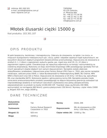 infolinia: 801 000 501 e-mail: [email protected] www: topserw.com.pl TOPSERW 05-220 Zielonka, ul. Marecka 66a tel. +48 22 771 04 56 tel. +48 22 761 11 80 fax +48 22 771 93 80 [email protected] Młotek ślusarski ciężki 15000 g Kod produktu: 103.301.107 OPIS PRODUKTU W pełni bezpieczny, beziskrowy i niemagnetyczny. Zalecany do stosowania, na lądzie i na morzu, w miejscach występowania niebezpiecznych par, cieczy, pyłów i odpadów zapalnych bądź wybuchowych, we wszystkich obszarach objętych programem bezpieczeństwa przemysłowego. Dopuszczony do stosowania w strefach 0, 1, 2 (Atex) z zagrożeniem wybuchu gazów, par, mgieł oraz stref 20, 21, 22 (Atex) z zagrożeniem zapłonu pyłów. Charakteryzuje się najwyższą odpornością na korozję i wytrzymałością na codzienną eksploatację. Wykonany ze stopu aluminiowo-brązowego (AlB) posiadającego aprobatę TUV lub innych specjalnych stopów objętych tym samym dopuszczeniem. Narzędzie zostało właściwie sklasyfikowane, przebadane i dopuszczone przez Factory Mutual (FM) Class nr. 7910, jako ręczne narzędzie nieiskrzące, zalecane przez OSHA, a także Bundesanstalt fur Materialprufung (BAM), BG Chemie, MPA NRW w Niemczech oraz GIG w Polsce. Dopuszczone do stosowania w US Army i US Navy wg. specyfikacji MIL oraz standardów NATO. Wykonanie zgodne z górną granicą normy DIN. Narzędzie posiada trwałe oznaczenie producenta/symbolu produktu pozwalającego na objęcie dożywotnią gwarancją uszkodzeń lub nieprawidłowego działania w normalnych warunkach użytkowania oraz polisą ubezpieczeniową odpowiedzialności za produkt na kwotę 10.000.000 CHF. Twardość stopu wg Brinella 200 HBW, wytrzymałość na rozciąganie 680 Nmm2, granica plastyczności 350 Nmm2. Wymiary: ciężar młota 15000 g, długość 920 mm, waga 16500 g. DANE TECHNICZNE Dożywotnia gwarancja Tak Normy OSHA, DIN Testowanie Factory Mutual Research Corporation nr 7910 Dopuszczenie MIL do stosowania w USA Army i USA Navy, NATO Długość (l) 920 mm Ciężar młota (H) 15000 g / lbs Waga 16500 g CERTYFIKATY POWIĄZANE Produkt Młotek ślusarski 100 g Młotek ślusarski 150 g Młotek ślusarski 200 g Młotek ślusarski 300 g Młotek ślusarski 400 g Młotek ślusarski 500 g Młotek ślusarski 600 g Młotek ślusarski 700 g Młotek ślusarski 800 g Młotek ślusarski 1000 g Młotek ślusarski 1250 g Młotek ślusarski 1500 g Młotek ślusarski 2000 g Młotek ślusarski ciężki 2500 g Młotek ślusarski ciężki 3000 g Młotek ślusarski ciężki 4000 g Młotek ślusarski ciężki 5000 g Młotek ślusarski ciężki 6000 g Młotek ślusarski ciężki 8000 g Młotek ślusarski ciężki 10000 g Młotek ślusarski ciężki 15000 g