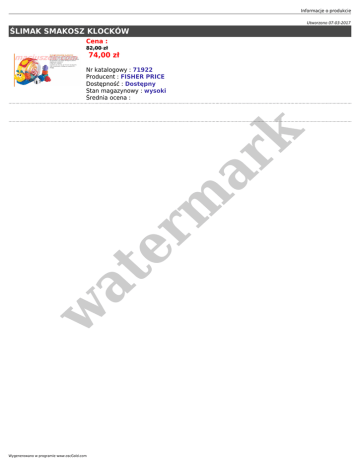 Informacje o produkcie Utworzono 07-03-2017 ŚLIMAK SMAKOSZ KLOCKÓW Cena : 82,00 zł 74,00 zł w at er m ar k Nr katalogowy : 71922 Producent : FISHER PRICE Dostępność : Dostępny Stan magazynowy : wysoki Średnia ocena : Wygenerowano w programie www.oscGold.com