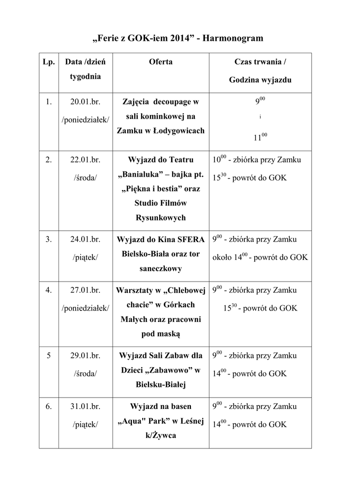 „Ferie z GOK-iem 2014” - Harmonogram Lp. Data /dzień Oferta tygodnia 1. Godzina wyjazdu 20.01.br. Zajęcia decoupage w 900 /poniedziałek/ sali kominkowej na i Zamku w Łodygowicach 2. Czas trwania / 22.01.br. Wyjazd do Teatru /środa/ „Banialuka” – bajka pt. 1100 1000 - zbiórka przy Zamku 1530 - powrót do GOK „Piękna i bestia” oraz Studio Filmów Rysunkowych 3. 24.01.br. /piątek/ Wyjazd do Kina SFERA 900 - zbiórka przy Zamku Bielsko-Biała oraz tor około 1400 - powrót do GOK saneczkowy 4. 27.01.br. /poniedziałek/ Warsztaty w „Chlebowej 900 - zbiórka przy Zamku chacie” w Górkach 1530 - powrót do GOK Małych oraz pracowni pod maską 5 29.01.br. Wyjazd Sali Zabaw dla 900 - zbiórka przy Zamku /środa/ Dzieci „Zabawowo” w 1400 - powrót do GOK Bielsku-Białej 6. 31.01.br. Wyjazd na basen /piątek/ „Aqua" Park” w Leśnej k/Żywca 900 - zbiórka przy Zamku 1400 - powrót do GOK