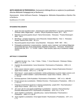 1 JĘZYK ANGIELSKI W PRZEDSZKOLU. Zestawienie bibliograficzne w wyborze (na podstawie zbiorów Biblioteki Pedagogicznej w Raciborzu) Opracowanie: Arleta Hoffmann-Piasecka . Pedagogiczna Biblioteka Wojewódzka w Rybniku Filia w Raciborzu. Opublikowano: 07.12.2015 WYDAWNICTWA ZWARTE 1. Języki obce dla wszystkich dzieci : doświadczenia szkół waldorfskich w nauczaniu najmłodszych / Christoph Jaffke, Magda Maier. – Kraków : Oficyna Wydawnicza Impuls, 2011. - 182 s. 2. Metodyka nauczania języków obcych / Hanna Komorowska. - Warszawa : "Fraszka Edukacyjna", 2004. - 204 s. 3. Mini Bingo! : poradnik metodyczny / Anna Wieczorek, Grażyna Malenta. - Wyd. 3. - Warszawa : Wydaw. Szkolne PWN, 2004. - 59, [1] s. 4. Nauczanie języków obcych dzieci / Jerzy Brzeziński. - Warszawa : WSIP, 1987. - 190 s. 5. Pedagogika przedszkolna i wczesnoszkolna : badania, opinie, inspiracje / pod redakcją Małgorzaty Karwowskiej-Struczyk, Doroty Sobierańskiej, Magdaleny Szpotowicz. - Warszawa : Wydawnictwo Akademickie Żak, 2011. - S. 116-250 : Część 2. Język ojczysty i język obcy w kształceniu małego dziecka ARTYKUŁY Z CZASOPISM 1. „ Angielski dla dzieci. Czy...? Jak...? Gdzie...? Kiedy...? / Anna Wieczorek // Edukacja i Dialog. 2008, nr 3, s.33-36 2. Angielski dla przedszkolaków / Iwona Harasimiuk // Wychowanie w Przedszkolu. - 2009, nr 6, s. 51-52 3. Dajmy naszym dzieciom radość z uczenia się języka obcego / Grażyna Pasternacka-Ochocka // Języki Obce w Szkole. - 2010, nr 2, s. 100-105 4. Dość tresury! : uczymy języka w przedszkolu i szkole podstawowej, by pomóc małym uczniom w ich zmaganiach z wielkim światem / Joanna Marchewka // Języki Obce w Szkole. - 2009, nr 3, s. 119-122 5. Edukacja językowa / Zofia Krzykalska // Wychowanie w Przedszkolu. - 1997, nr 8, s. 486-492 6. Europa zaczyna się w przedszkolu / Elżbieta Chromiec // Wychowanie w Przedszkolu. - 2000, nr 3, s. 172-173 7. Integracja przedmiotowo-językowa w edukacji przedszkolnej : projekt ZOO / Ewa Karkowska // Języki Obce w Szkole. - 2010, nr 6, s. 152-157 8. Jak uczyć i jak nie uczyć języka angielskiego w przedszkolu : rozmowa z Hanną Wysocką / Dominika Stefanowska 2015 // Wychowanie w Przedszkolu. - 2015, nr 8, s. 12-16 9. Język angielski w przedszkolu - specyfika pracy / Joanna Sokołowska // Wychowanie w Przedszkolu. - 2008, nr 3, s.26-32 10. Język angielski w przedszkolu / Anna Agata Grodzik // Wychowanie w Przedszkolu. - 2011, nr 4, s. 72 2 11. Język obcy dla maluchów : moda, czy inwestycja w przyszłość dziecka? / Aleksandra Mazanek // Wychowanie na co dzień. - 2011, nr 6, s. VI-VIII 12. Klik uczy angielskiego : multimedialne zabawy językowe dla dzieci w wieku 4-8 lat / Magdalena Szpotowicz // Języki Obce w Szkole. - 2005, nr 3, s. 182-185 13. Lekcja języka angielskiego w przedszkolu / Krystyna Kucaj 2010 // Języki Obce w Szkole. - 2010, nr 3, s. 124-130 14. Między słowami / Bas Kast // Charaktery. - 2013, nr 8, s. 86-89 15. Nauczanie języka obcego w okresie wczesnoszkolnym / Aneta Gładysz // Neofilologia. - 2002, T 3, s. 111-115 16. O nauce języka angielskiego / Katarzyna Miłek // Wychowanie w Przedszkolu. - 2011, nr 9, s. 66-67 17. Planowanie nauki języka angielskiego dla małych dzieci / Jolanta Czerwonka // Języki Obce w Szkole. - 2001, nr 5, s. 73-75 18. Podręczniki do nauki języka angielskiego dzieci w wieku przedszkolnym i klasach I-III szkoły podstawowej / Bożena Banach // Języki Obce w Szkole. - 2000, nr 6, s. 57-59 19. Rola pamięci u dziecka uczącego się języka obcego / Darius Langhoff // Języki Obce w Szkole. 2010, nr 3, s. 9-14 20. Sposoby na powtórzenia dla dzieci przedszkolnych i uczniów szkoły podstawowej / Ewa Dziewierz // Języki Obce w Szkole. - 2008, nr 5, s. 112-115 21. Uczymy języka w przedszkolu i w szkole podstawowej, by pomóc małym uczniom w ich zmaganiach z wielkim światem /Joanna Marchewka // Języki Obce w Szkole. - 2009, nr 3, s. 119-122 22. Wczesna edukacja językowa : (na przykładzie języka angielskiego) / Krystyna Kamińska // Wychowanie w Przedszkolu. - 2008, nr 3, s. 5-9 23. Z angielskim na co dzień w przedszkolu / Barbara Buczkowska-Staniec // Częstochowski Biuletyn Oświatowy. - 2014, nr 2, s. 50-53 24. Zabawa językiem angielskim / Katarzyna Janiszewska-Gold // Wychowanie w Przedszkolu. - 2014, nr 7, s. 56-57 25. Zabawy z językiem angielskim / Barbara Czekańska // Wychowanie w Przedszkolu. - 2009, nr 6, s. 44-47 26. Zabawy z językiem angielskim. Kolory / Michał Drab // Wychowanie w Przedszkolu. - 2013, nr 1, s. 54-55 27. Zabawy z językiem angielskim. Rodzina / Michał Drab // Wychowanie w Przedszkolu. - 2013, nr 5, s. 62-63 28. Zabawy z językiem angielskim. Środki transportu / Michał Drab // Wychowanie w Przedszkolu. 2013, nr 6, s. 54-55