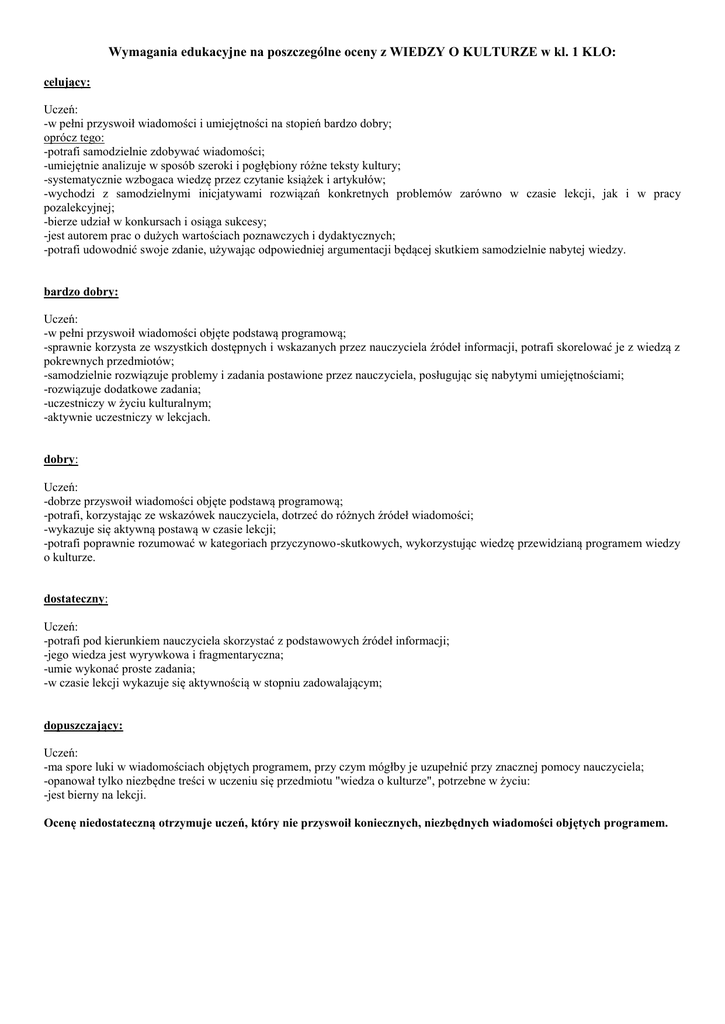 Wymagania edukacyjne na poszczególne oceny z WIEDZY O KULTURZE w kl. 1 KLO: celujący: Uczeń: -w pełni przyswoił wiadomości i umiejętności na stopień bardzo dobry; oprócz tego: -potrafi samodzielnie zdobywać wiadomości; -umiejętnie analizuje w sposób szeroki i pogłębiony różne teksty kultury; -systematycznie wzbogaca wiedzę przez czytanie książek i artykułów; -wychodzi z samodzielnymi inicjatywami rozwiązań konkretnych problemów zarówno w czasie lekcji, jak i w pracy pozalekcyjnej; -bierze udział w konkursach i osiąga sukcesy; -jest autorem prac o dużych wartościach poznawczych i dydaktycznych; -potrafi udowodnić swoje zdanie, używając odpowiedniej argumentacji będącej skutkiem samodzielnie nabytej wiedzy. bardzo dobry: Uczeń: -w pełni przyswoił wiadomości objęte podstawą programową; -sprawnie korzysta ze wszystkich dostępnych i wskazanych przez nauczyciela źródeł informacji, potrafi skorelować je z wiedzą z pokrewnych przedmiotów; -samodzielnie rozwiązuje problemy i zadania postawione przez nauczyciela, posługując się nabytymi umiejętnościami; -rozwiązuje dodatkowe zadania; -uczestniczy w życiu kulturalnym; -aktywnie uczestniczy w lekcjach. dobry: Uczeń: -dobrze przyswoił wiadomości objęte podstawą programową; -potrafi, korzystając ze wskazówek nauczyciela, dotrzeć do różnych źródeł wiadomości; -wykazuje się aktywną postawą w czasie lekcji; -potrafi poprawnie rozumować w kategoriach przyczynowo-skutkowych, wykorzystując wiedzę przewidzianą programem wiedzy o kulturze. dostateczny: Uczeń: -potrafi pod kierunkiem nauczyciela skorzystać z podstawowych źródeł informacji; -jego wiedza jest wyrywkowa i fragmentaryczna; -umie wykonać proste zadania; -w czasie lekcji wykazuje się aktywnością w stopniu zadowalającym; dopuszczający: Uczeń: -ma spore luki w wiadomościach objętych programem, przy czym mógłby je uzupełnić przy znacznej pomocy nauczyciela; -opanował tylko niezbędne treści w uczeniu się przedmiotu "wiedza o kulturze", potrzebne w życiu: -jest bierny na lekcji. Ocenę niedostateczną otrzymuje uczeń, który nie przyswoił koniecznych, niezbędnych wiadomości objętych programem. Cele kształcenia – wymagania ogólne I. Odbiór wypowiedzi i wykorzystanie zawartych w nich informacji. Uczeń odbiera teksty kultury i wykorzystuje informacje w nich zawarte, z uwzględnieniem specyfiki medium, w którym są przekazywane. II. Tworzenie wypowiedzi. Uczeń tworzy wypowiedzi, celowo posługując się różnymi mediami (słowo mówione i pisane, obraz malarski, fotograficzny, filmowy, dźwięk, widowisko, środki multimedialne); aktywnie współtworzy kulturę lokalną (szkoły, dzielnicy, miejscowości). III. Analiza i interpretacja tekstów kultury. Uczeń posługuje się pojęciem kultury rozumianej jako całokształt ludzkiej działalności; analizuje i interpretuje teksty kultury – potoczne praktyki kultury, a także dzieła sztuki. Treści nauczania – wymagania szczegółowe 1. Odbiór wypowiedzi i wykorzystanie zawartych w nich informacji. Uczeń: 1) zna dwudziestowieczne dzieła reprezentujące różne dziedziny sztuki (literaturę, architekturę, plastykę, muzykę, teatr, fotografię, film, sztukę nowych mediów) i dostrzega związki pomiędzy nimi; 2) wskazuje różne funkcje dzieła sztuki (np. estetyczną, komunikacyjną, społeczną, użytkową, kultową, poznawczą, ludyczną); 3) analizuje temat dzieła oraz treści i formę w kontekście jego różnych funkcji, wykorzystując podstawowe wiadomości o stylach i epokach z różnych dziedzin sztuki; 4) analizuje film lub analizuje spektakl teatralny, posługując się podstawowymi pojęciami z zakresu właściwej dziedziny sztuki; 5) charakteryzuje podstawowe media kultury (słowo, obraz, dźwięk, widowisko); 6) wymienia różne formy mediów kultury (słowo mówione, pismo, książka, obraz malarski, fotografia, film, program telewizyjny, spektakl teatralny) oraz użycia (nowe media, media masowe, media interaktywne, multimedia); 7) wyjaśnia, na czym polegają różne formy kontaktu z kulturą (odbiór bierny, aktywny, konsumpcja, produkcja, twórczość, użytkowanie, uczestnictwo, animacja); 8) lokuje wytwory kultury (zachowania, zwyczaje, normy moralne, wytwory materialne, dzieła sztuki) w kontekście grup społecznych, w których są tworzone i odbierane (rodzina, rówieśnicy, społeczność lokalna, naród); 9) samodzielnie wyszukuje informacje na temat kultury w różnych mediach, bibliotekach. 2. Tworzenie wypowiedzi. Uczeń: 1) wypowiada się – w mowie i w piśmie – na temat wytworów kultury i ludzkich praktyk w kulturze (zachowań, obyczajów, przedmiotów materialnych, dzieł sztuki); 2) wypowiada się na temat dzieła sztuki, używając pojęć zarówno swoistych dla poszczególnych sztuk, jak i wspólnych (forma, kompozycja, funkcja, nadawca, odbiorca, użytkownik, znaczenie, kontekst, medium); 3) przygotowuje prezentację lub inną formę wypowiedzi multimedialnej – blog, forum, strona WWW – na tematy związane z kulturą lokalną i regionu lub z szeroko pojętymi problemami kultury współczesnej; 4) bierze aktywny udział w szkolnych przedsięwzięciach artystycznych, animacyjnych, społecznych i innych (wystawa, happening, przedstawienie szkolne, gazetka szkolna, kulturalna akcja charytatywna); 5) organizuje proste działania o charakterze kulturalnym (spotkanie z twórcą kultury, przedsięwzięcie artystyczne, prezentacja własnych zainteresowań, tradycji lokalnej lub regionalnej); 6) określa swoje zainteresowania, potrzeby i preferencje kulturalne oraz uzasadnia je w dyskusji; 7) dba o ład i estetykę otoczenia, otacza opieką elementy dziedzictwa kulturowego. 3. Analiza i interpretacja tekstów kultury. Uczeń: 1) odróżnia pojęcie kultury rozumianej jako dorobek artystyczny od kultury rozumianej jako całokształt dorobku ludzkości, ze zrozumieniem używa określeń: kulturowy i kult