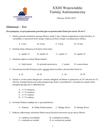 XXIII Wojewódzki Turniej Astronomiczny Olsztyn 30.03.2015 Eliminacje – Test (Przyjmujemy, że przyspieszenie grawitacyjne na powierzchni Ziemi jest równe 10 m/s2) 1. Gdyby gwiazda rozmiarów naszego Słońca, miała 2 razy większą temperaturę swojej fotosfery, to wysyłałaby w przestrzeń ilość energii większą od ilości energii wysyłanej przez Słońce: A. 2 razy B. 4 razy C. 8 razy D. 16 razy C. Apollo 17 D. Apollo 18 2. Ostatnią misją załogową na Księżyc była misja: A. Apollo 15 B. Apollo 16 3. Ostatnim etapem ewolucji Słońca będzie: A. biały karzeł B. gwiazda neutronowa C. pulsar D. czarna dziura 4. Procent powierzchni Księżyca jaka nie jest obserwowalna z powierzchni Ziemi to: A. 41 B. 45 C. 50 D. 59 5. Ziemia w swoim ruchu obiegowym zmienia odległość od Słońca w granicach: od 147 mln km do 152 mln km. Energia kinetyczna ruchu postępowego Ziemi w peryhelium w stosunku do energii ruchu postępowego gdy jest w aphelium jest: A. B. C. D. o 3 % mniejsza o 7 % mniejsza o 3 % większa o 7 % większa 6. Gwiazda Polarna znajduje się w gwiazdozbiorze: A. Polarisa B. Małej Niedźwiedzicy C. Małego Wozu D. Dużego Wozu 7. Podczas całkowitego zaćmienia Słońca tarcza Księżyca przesuwa się po tarczy Słońca: A. z północy na południe C. z zachodu na wschód B. z południa na północ D. ze wschodu na zachód 1 8. Zmiana czasu z letniego na zimowy w tym roku w Polsce będzie miała miejsce: A. B. C. D. W I weekend po równonocy jesiennej W ostatni weekend września W I weekend października W ostatni weekend października 9. Księżyc będący w I kwadrze góruje: A. o północy C. o zachodzie Słońca B. w południe D. o wschodzie Słońca 10. Gdy Wenus znajduje się w najmniejszej odległości od Ziemi to znajduje się w: A. B. C. D. W opozycji W koniunkcji górnej W koniunkcji dolnej W kwadraturze 11. Najgorętszą warstwą atmosfery Słońca jest A. korona słoneczna B. fotosfera C. chromosfera D. heliosfera 12. Na wysokości równej promieniowi Ziemi nad powierzchnią Ziemi nadano ciału prędkość równą I prędkości kosmicznej (7,9 km/s) skierowaną pionowo w dół. Prędkość z jaką ciało to spadnie na powierzchnię Ziemi jest równa (zaniedbujemy opór atmosfery ziemskiej): A. 10,3 km/s B. 11,2 km/s C. 12,7 km/s D. 13,4 km/s 13. Jeżeli w pewnej miejscowości Gwiazda Polarna znajduje się na 26º od Zenitu to szerokość geograficzna tej miejscowości jest równa: A. 26º N B. 36º N C. 54º N D. 64º N 14. Jeżeli stoimy twarzą do Gwiazdy Polarnej, to sfera niebieska z gwiazdami w wyniku ruchu obrotowego Ziemi obraca się wokół tej gwiazdy: A. B. C. D. Zgodnie kierunkiem ruchu wskazówek zegara Przeciwnie do kierunku ruchu wskazówek zegara Zgodnie z kierunkiem ruchu wskazówek zegara za dnia, przeciwnie nocą Przeciwnie do kierunku ruchu wskazówek zegara nocą, zgodnie w dzień 2 15. Jeżeli podczas przesilenia letniego Słońce w pewnej miejscowości góruje w południe na wysokości 82º nad horyzontem , to w najkrótszy dzień roku w południe w tej samej miejscowości będzie świecić nad horyzontem, na wysokości: A. 41º B. 58º C. 35º D. 28º 16. Jeżeli pewnego dnia Słońce wschodzi w Warszawie ( 52º 15’ N, 21º 0’ E) o godz. 5h 51m to w Berlinie (52º 30’ N, 13º 26’ E), tego samego dnia wschodzi o godzinie: A. 6h 01m B. 6h 11m C. 6h 21m D. 6h 31m 17. Masa Ziemi jest równa 6 · 1024 kg, zaś prędkość światła 300 000 km/s. Stała grawitacji ma wartość 6,67·10-11 Nm2/kg2 . Aby Ziemia stała się czarną dziura należałoby jej masę skupić w kuli o promieniu nie większym niż: A. 9 mm B. 9 cm C. 90 cm D. 9 m 18. Najbliższa Słońcu planeta karłowata Ceres krąży wokół Słońca z okresem 4 lata i 221 dni. Średnia odległość w jakiej obiega ona Słońce jest równa: (1 jednostka astronomiczna = 149,6 mln km) A. 356 mln km B. 414 mln km C. 452 mln km D. 484 mln km 19. Najdalej od Słońca położoną częścią Układu Słonecznego jest: A. B. C. D. Pas Kuipera Pas wiecznych lodów Obłok Oorta Obłok centaurów 20. Z podanych poniżej obiektów najwięcej gwiazd zawierają: A. mgławice planetarne B. gromady otwarte 3 C. gromady kuliste D. galaktyki XXI Wojewódzki Turniej Astronomiczny Olsztyn 8.04.2013 KLUCZ PRAWIDŁOWYCH ODPOWIEDZI: 1. D 2. C 3. A 4. A 5. D 6. B 7. C 8. D 9. C 10. C 11. A 12. B 13. D 14. B 15. C 16. C 17. A 18. B 19. C 20. D 4