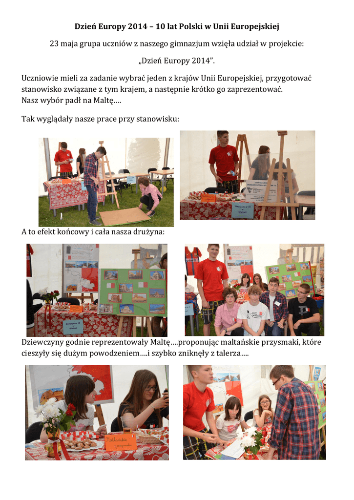 Dzień Europy 2014 – 10 lat Polski w Unii Europejskiej 23 maja grupa uczniów z naszego gimnazjum wzięła udział w projekcie: „Dzień Europy 2014”. Uczniowie mieli za zadanie wybrać jeden z krajów Unii Europejskiej, przygotować stanowisko związane z tym krajem, a następnie krótko go zaprezentować. Nasz wybór padł na Maltę…. Tak wyglądały nasze prace przy stanowisku: A to efekt końcowy i cała nasza drużyna: Dziewczyny godnie reprezentowały Maltę….proponując maltańskie przysmaki, które cieszyły się dużym powodzeniem….i szybko zniknęły z talerza…. Prezentacją Malty zajął się Piotrek Drzewiecki, który z wielką pasją opowiadał o tym pełnym niespodzianek kraju. Jego sposób prezentacji wzbudził wielkie zainteresowanie wśród publiczności… Następnym punktem programu był quiz wiedzy o Unii Europejskiej – oto nasza drużyna i jej zmagania: Walka była bardzo zacięta, pot lał się z czoła (…pogoda dopisała, żar lał się z nieba…) i mimo iż nie udało nam się stanąć na podium znaleźliśmy się w ścisłej czołówce! Z dumą mogę stwierdzić, iż uczniowie naszego gimnazjum mają dobrze ugruntowaną wiedzę z zakresu Unii Europejskiej!! Dzień Europy, organizowany przez Dom Współpracy Polsko-Niemieckiej, to naprawdę ciekawa inicjatywa. Święto to miało nie tylko podkreślić zjednoczenie Europy, ale również zaprezentować różne zwyczaje, tradycje i stroje z poszczególnych państw członkowskich. Na stoiskach mogliśmy zaznajomić się z kulturą m.in. Niemiec, Włoch, Hiszpanii, Francji, Norwegii, Belgii, Grecji jak i Czech. Wszyscy dobrze się bawili i z wielkim zainteresowaniem słuchali prezentacji. Czekamy na kolejne edycje tej imprezy! Przedstawiciele naszego gimnazjum, którzy brali udział w projekcie: Zosia Twardowska, Małgosia Kustra, Piotrek Drzewiecki, Maciek Kubiak, Krzysiek Karowiec, Patryk Krajewski i Borys Bednarek. Opiekunem grupy była p.Aleksandra Procek (nauczyciel j.angielskiego)