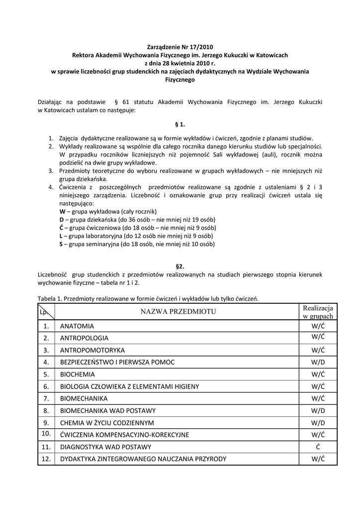 Zarządzenie Nr 17/2010 Rektora Akademii Wychowania Fizycznego im. Jerzego Kukuczki w Katowicach z dnia 28 kwietnia 2010 r. w sprawie liczebności grup studenckich na zajęciach dydaktycznych na Wydziale Wychowania Fizycznego Działając na podstawie § 61 statutu Akademii Wychowania Fizycznego im. Jerzego Kukuczki w Katowicach ustalam co następuje: § 1. 1. Zajęcia dydaktyczne realizowane są w formie wykładów i ćwiczeń, zgodnie z planami studiów. 2. Wykłady realizowane są wspólnie dla całego rocznika danego kierunku studiów lub specjalności. W przypadku roczników liczniejszych niż pojemność Sali wykładowej (auli), rocznik można podzielić na dwie grupy wykładowe. 3. Przedmioty teoretyczne do wyboru realizowane w grupach wykładowych – nie mniejszych niż grupa dziekańska. 4. Ćwiczenia z poszczególnych przedmiotów realizowane są zgodnie z ustaleniami § 2 i 3 niniejszego zarządzenia. Liczebność i oznakowanie grup przy realizacji ćwiczeń ustala się następująco: W – grupa wykładowa (cały rocznik) D – grupa dziekańska (do 36 osób – nie mniej niż 19 osób) Ć – grupa ćwiczeniowa (do 18 osób – nie mniej niż 9 osób) L – grupa laboratoryjna (do 12 osób nie mniej niż 9 osób) S – grupa seminaryjna (do 18 osób, nie mniej niż 10 osób) §2. Liczebność grup studenckich z przedmiotów realizowanych na studiach pierwszego stopnia kierunek wychowanie fizyczne – tabela nr 1 i 2. Tabela 1. Przedmioty realizowane w formie ćwiczeń i wykładów lub tylko ćwiczeń. NAZWA PRZEDMIOTU Lp. Realizacja w grupach W/Ć W/Ć 1. ANATOMIA 2. ANTROPOLOGIA 3. ANTROPOMOTORYKA W/Ć 4. BEZPIECZEŃSTWO I PIERWSZA POMOC W/D 5. BIOCHEMIA W/Ć 6. BIOLOGIA CZŁOWIEKA Z ELEMENTAMI HIGIENY W/Ć 7. BIOMECHANIKA W/Ć 8. BIOMECHANIKA WAD POSTAWY W/D 9. 10. CHEMIA W ŻYCIU CODZIENNYM W/D ĆWICZENIA KOMPENSACYJNO-KOREKCYJNE W/Ć 11. DIAGNOSTYKA WAD POSTAWY 12. DYDAKTYKA ZINTEGROWANEGO NAUCZANIA PRZYRODY Ć W/Ć 13. EDUKACJA ZDROWOTNA W/D 14. EMISJA GŁOSU W/Ć 15. FIZJOLOGIA W/Ć 16. FIZYKA ŚRODOWISKA PRZYRODNICZEGO W/Ć 17. GIMNASTYKA 18. HISTORIA KULTURY FIZYCZNEJ W/D 19. JEDNOSTKA I GRUPA SPOŁECZNA W SYTUACJI ZAGROŻENIA W/D 20. JĘZYK OBCY Ć 21. KOSZYKÓWKA Ć 22. LEKKA ATLETYKA Ć 23. METODYKA NAUCZANIA PRZEDMIOTU EDUKACJA DLA BEZPIECZEŃSTWA 24. METODYKA PO (w ostatnim semestrze przedmiot realizowany jest w grupach dziekańskich) 25. METODYKA POSTĘPOWANIA KOREKCYJNO-KOMPENSACYJNEGO 26. METODYKA SPORTÓW I SPECJALNOŚCI OBRONNYCH 27. METODYKA WYCHOWANIA FIZYCZNEGO (w ostatnim semestrze przedmiot realizowany jest w grupach dziekańskich) 28. OCHRONA LUDNOŚCI I OBRONA CYWILNA W/D 29. OCHRONA PRZED SKUTKAMI ZAGROŻEŃ W/D 30. ORGANIZACJA I PRAWO W OŚWIACIE W/D 31. OSTRZEGANIE O ZAGROŻENIACH 32. PEDAGOGIKA 33. PIERWSZA POMOC PRZEDMEDYCZNA Ć 34. PIŁKA NOŻNA Ć 35. PIŁKA RĘCZNA Ć 36. PŁYWANIE Ć 37. PŁYWANIE KOREKCYJNE W/Ć 38. PODSTAWY BOTANIKI W/D 39. PODSTAWY GEOGRAFII W/D 40. PODSTAWY ZARZĄDZANIA KRYZYSOWEGO W/D 41. PODSTAWY ZOOLOGII W/D 42. POLITYKA BEZPIECZEŃSTWA I OBRONNOŚCI PAŃSTWA W/D 43. PRAWNE ASPEKTY BEZPIECZEŃSTWA W/D 44. PSYCHOLOGIA W/D 45. RATOWNICTWO PRZEDMEDYCZNE Ć W/Ć W/Ć/D Ć W/Ć W/Ć/D D W/D Ć 46. RYTMIKA I TANIEC Ć 47. SIATKÓWKA Ć 48. STRZELECTWO SPORTOWE Ć 49 TECHNOLOGIA INFORMACYJNA D 50. TEORIA SPORTU W/Ć 51. TEORIA WYCHOWANIA FIZYCZNEGO W/D 52. TERENOZNAWSTWO D 53. TREŚCI KIERUNKOWE DO WYBORU – Z ZAKRESU ANTROPOMOTORYKI D 54. TREŚCI KIERUNKOWE DO WYBORU – ZAKRESU TEORII SPORTU D 55. TREŚCI KIERUNKOWE DO WYBORU- Z ZAKRESU BIOMECHANIKI D 56. TREŚCI KIERUNKOWE DO WYBORU- Z ZAKRESU HISTORII KULTURY FIZYCZNEJ D 57. TREŚCI PODSTAWOWE DO WYBORU – Z ZAKRESU ANATOMII D 58. TREŚCI PODSTAWOWE DO WYBORU – Z ZAKRESU ANTROPOLOGII D 59. TREŚCI PODSTAWOWE DO WYBORU – Z ZAKRESU BIOCHEMII D 60. TREŚCI PODSTAWOWE DO WYBORU – Z ZAKRESU FIZJOLOGII D 61. WADY POSTAWY W/D 62. WIEDZA O SIŁACH ZBROJNYCH W/ D 63. WYBRANE PROBLEMY Z EKOLOGII I OCHRONY ŚRODOWISKA W/D 64. ZABAWY I GRY RUCHOWE Ć 65. ZAGROŻENIA TOKSYCZNE W/D 66. ZAJĘCIA TERENOWE Ć Tabela nr 2. Przedmioty realizowane tylko w formie wykładów. Lp. NAZWA PRZEDMIOTU Realizacja w grupach W 1. AKTYWNOŚĆ RUCHOWA ADAPTACYJNA 2. ANATOMIA FUNKCJONALNA W 3. BEZPIECZEŃSTWO IMPREZ MASOWYCH W 4. BIOMEDYCZNE PODSTAWY GIMNASTYKI KOMPENSACYJNO-KOREKCYJNEJ W 5. EDUKACJA DLA BEZPIECZEŃSTWA W 6. FILOZOFIA – ELEMENTY ETYKI W 7. FIZJOLOGICZNE PODSTAWY WAD POSTAWY W 8. HISTORYCZNE ASPEKTY BEZPIECZEŃSTWA W 9. KOREKTYWA DZIECI Z ZABURZENIAMI ROZWOJOWYMI W 10. METODYKA SPORTÓW I SPECJALNOŚCI OBRONNYCH W 11. OBRONA CYWILNA W 12. ORGANIZACJA OŚRODKÓW KOREKCYJNYCH W 13. ZAGROŻENIA JĄDROWE W 14. TECHNIKI RELAKSACYJNE W 15. TEORIA EDUKACJI DLA BEZPIECZEŃSTWA W 16. TYPOLOGIA ZAGROŻEŃ W 17. WYBRANE PROBLEMY MPH W § 3. Liczebność grup studenckich z przedmiotów realizowanych na studiach drugiego stopnia kierunek wychowanie fizyczne – tabela 3 i 4. Tabela nr 3. Przedmioty realizowane w formie ćwiczeń i wykładów lub tylko ćwiczeń. NAZWA PRZEDMIOTU Lp. Realizacja w grupach D 1. AKTYWNOŚĆ RUCHOWA ADAPTACYJNA 2. BEZPIECZEŃSTWO SPOŁECZNE W/D 3. DYDAKTYKA PRZEDMIOTU EDUKACJA DLA BEZPIECZEŃSTWA W/Ć 4. GIMNASTYKA W/Ć 5. HIGIENA I ŻYWIENIE W/D 6. JĘZYK OBCY 7. KOSZYKÓWKA W/Ć 8. LEKKA ATLETYKA W/Ć 9. MEDYCYNA SPORTU W/Ć 10. METODOLOGIA BADAN NAUKOWYCH W/D 11. METODYKA PRZYSPOSOBIENIA OBRONNEGO W/D 12. METODYKA REKREACJI RUCHOWEJ 13. METODYKA WYCHOWANIA FIZYCZNEGO W/Ć 14. MIĘDZYNARODOWE PRAWO HUMANITARNE W/D 15. MUZYKA, RYTM, TANIEC 16. PIERWSZA POMOC W NAGŁYCH WYPADKACH W/Ć 17. PIŁKA NOŻNA W/Ć 18. PIŁKA RĘCZNA W/Ć 19. PŁYWANIE W/Ć 20. PROBLEMY POLITYCZNE WSPÓŁCZESNEGO ŚWIATA W/D 21. PRZEDMIOTY TEORETYCZNE DO WYBORU W/D Ć D Ć 22. SIATKÓWKA W/Ć 23. SIŁY ZBROJNE RP W/D 24. SOCJOLOGIA W/D 25. STATYSTYKA W/D 26. SYSTEM BEZPIECZEŃSTWA NARODOWEGO 27. TEORIA TRENINGU W/D 28. TURYSTYKA SZKOLNA W/D 29. WYCHOWANIE FIZYCZNE SPECJALNE 30. ZAGROŻE