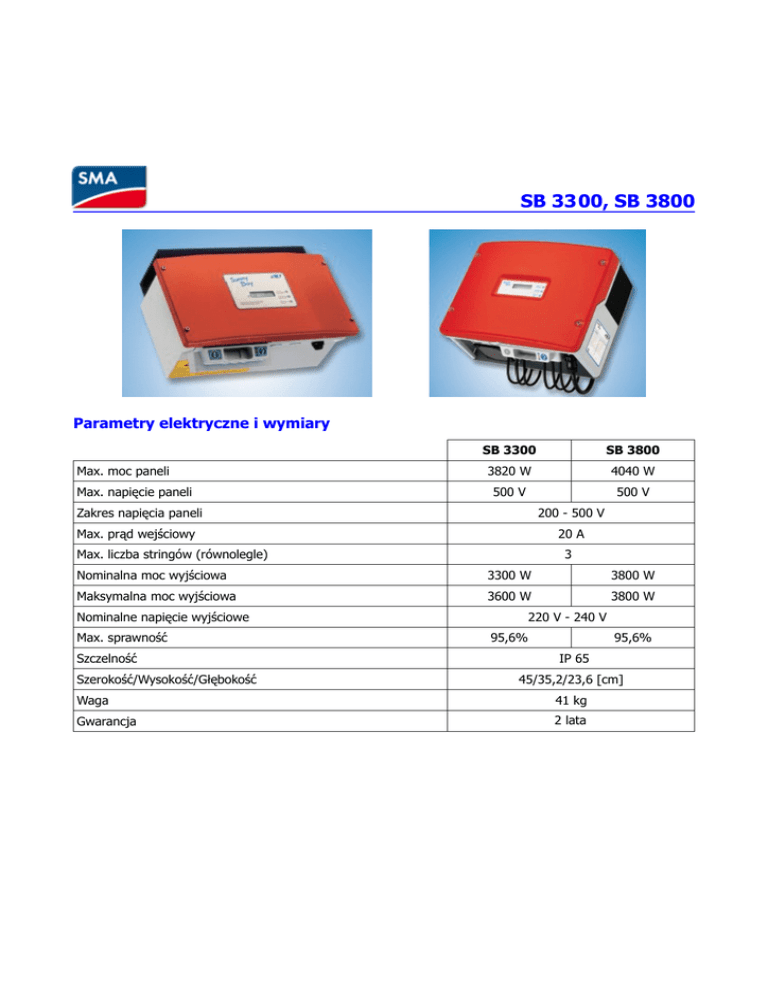 SB 3300, SB 3800 Parametry elektryczne i wymiary Max. moc paneli Max. napięcie paneli SB 3300 SB 3800 3820 W 4040 W 500 V 500 V Zakres napięcia paneli 200 - 500 V Max. prąd wejściowy 20 A 3 Max. liczba stringów (równolegle) Nominalna moc wyjściowa 3300 W 3800 W Maksymalna moc wyjściowa 3600 W 3800 W Nominalne napięcie wyjściowe Max. sprawność Szczelność Szerokość/Wysokość/Głębokość 220 V - 240 V 95,6% 95,6% IP 65 45/35,2/23,6 [cm] Waga 41 kg Gwarancja 2 lata