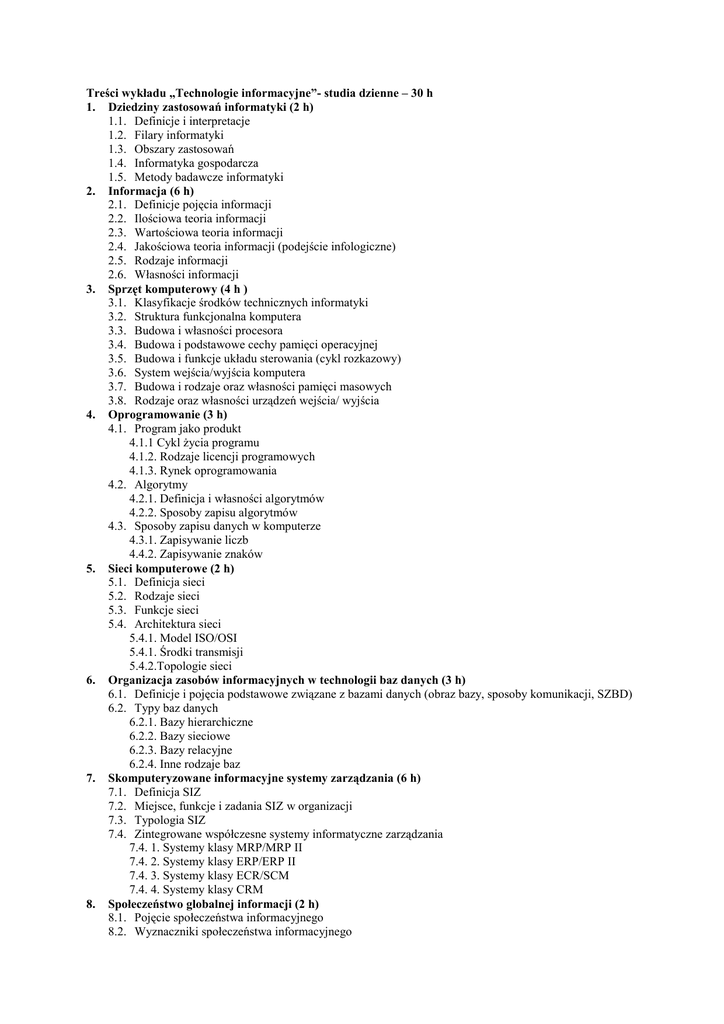 Treści wykładu „Technologie informacyjne”- studia dzienne – 30 h 1. Dziedziny zastosowań informatyki (2 h) 1.1. Definicje i interpretacje 1.2. Filary informatyki 1.3. Obszary zastosowań 1.4. Informatyka gospodarcza 1.5. Metody badawcze informatyki 2. Informacja (6 h) 2.1. Definicje pojęcia informacji 2.2. Ilościowa teoria informacji 2.3. Wartościowa teoria informacji 2.4. Jakościowa teoria informacji (podejście infologiczne) 2.5. Rodzaje informacji 2.6. Własności informacji 3. Sprzęt komputerowy (4 h ) 3.1. Klasyfikacje środków technicznych informatyki 3.2. Struktura funkcjonalna komputera 3.3. Budowa i własności procesora 3.4. Budowa i podstawowe cechy pamięci operacyjnej 3.5. Budowa i funkcje układu sterowania (cykl rozkazowy) 3.6. System wejścia/wyjścia komputera 3.7. Budowa i rodzaje oraz własności pamięci masowych 3.8. Rodzaje oraz własności urządzeń wejścia/ wyjścia 4. Oprogramowanie (3 h) 4.1. Program jako produkt 4.1.1 Cykl Ŝycia programu 4.1.2. Rodzaje licencji programowych 4.1.3. Rynek oprogramowania 4.2. Algorytmy 4.2.1. Definicja i własności algorytmów 4.2.2. Sposoby zapisu algorytmów 4.3. Sposoby zapisu danych w komputerze 4.3.1. Zapisywanie liczb 4.4.2. Zapisywanie znaków 5. Sieci komputerowe (2 h) 5.1. Definicja sieci 5.2. Rodzaje sieci 5.3. Funkcje sieci 5.4. Architektura sieci 5.4.1. Model ISO/OSI 5.4.1. Środki transmisji 5.4.2.Topologie sieci 6. Organizacja zasobów informacyjnych w technologii baz danych (3 h) 6.1. Definicje i pojęcia podstawowe związane z bazami danych (obraz bazy, sposoby komunikacji, SZBD) 6.2. Typy baz danych 6.2.1. Bazy hierarchiczne 6.2.2. Bazy sieciowe 6.2.3. Bazy relacyjne 6.2.4. Inne rodzaje baz 7. Skomputeryzowane informacyjne systemy zarządzania (6 h) 7.1. Definicja SIZ 7.2. Miejsce, funkcje i zadania SIZ w organizacji 7.3. Typologia SIZ 7.4. Zintegrowane współczesne systemy informatyczne zarządzania 7.4. 1. Systemy klasy MRP/MRP II 7.4. 2. Systemy klasy ERP/ERP II 7.4. 3. Systemy klasy ECR/SCM 7.4. 4. Systemy klasy CRM 8. Społeczeństwo globalnej informacji (2 h) 8.1. Pojęcie społeczeństwa informacyjnego 8.2. Wyznaczniki społeczeństwa informacyjnego 9. 8.3. Podstawowe trendy społeczeństwa informacyjnego 8.4. Szanse, wyzwania i problemy społeczeństwa informacyjnego Przestępczość komputerowa (2 h) 9.1. Pojęcie i klasyfikacje przestępczości komputerowej 9.2. Metody przestępnego działania 9.3. Skala przestępczości komputerowej w Polsce 9.4. Istota, skala i skutki piractwa komputerowego 9.5. Sposoby walki z piractwem Razem: 30 h Opracował dr hab. inŜ. Adam Czerwiński, prof. UO