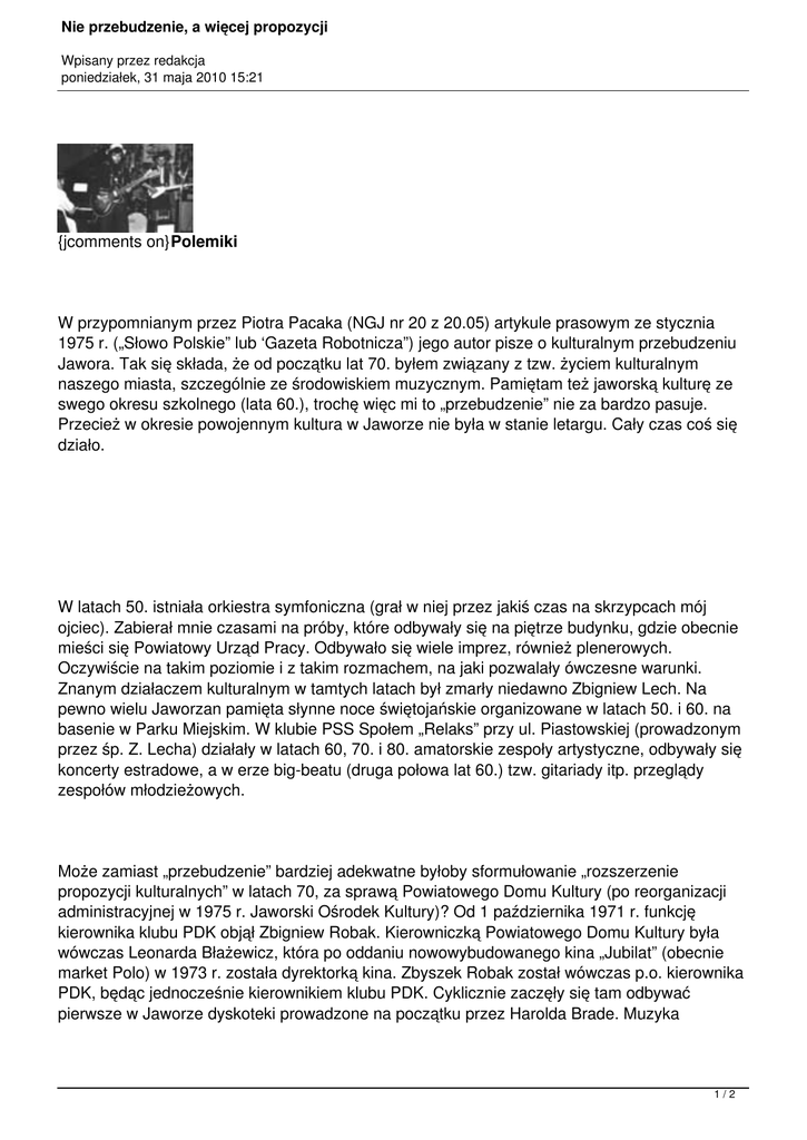 1975 r. („Słowo Polskie” lub ‘Gazeta Robotnicza”) jego autor pisze o kulturalnym przebudzeniu