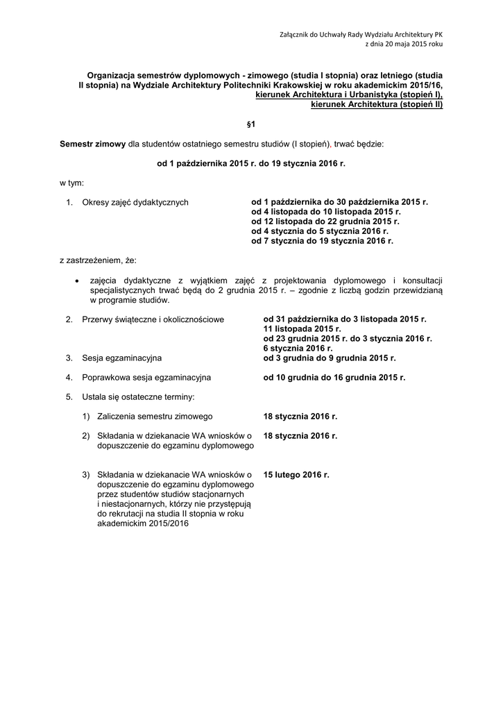 Załącznik do Uchwały Rady Wydziału Architektury PK z dnia 20 maja 2015 roku Organizacja semestrów dyplomowych - zimowego (studia I stopnia) oraz letniego (studia II stopnia) na Wydziale Architektury Politechniki Krakowskiej w roku akademickim 2015/16, kierunek Architektura i Urbanistyka (stopień I), kierunek Architektura (stopień II) §1 Semestr zimowy dla studentów ostatniego semestru studiów (I stopień), trwać będzie: od 1 października 2015 r. do 19 stycznia 2016 r. w tym: Okresy zajęć dydaktycznych 1. od 1 października do 30 października 2015 r. od 4 listopada do 10 listopada 2015 r. od 12 listopada do 22 grudnia 2015 r. od 4 stycznia do 5 stycznia 2016 r. od 7 stycznia do 19 stycznia 2016 r. z zastrzeżeniem, że: zajęcia dydaktyczne z wyjątkiem zajęć z projektowania dyplomowego i konsultacji specjalistycznych trwać będą do 2 grudnia 2015 r. – zgodnie z liczbą godzin przewidzianą w programie studiów. 2. Przerwy świąteczne i okolicznościowe 3. Sesja egzaminacyjna od 31 października do 3 listopada 2015 r. 11 listopada 2015 r. od 23 grudnia 2015 r. do 3 stycznia 2016 r. 6 stycznia 2016 r. od 3 grudnia do 9 grudnia 2015 r. 4. Poprawkowa sesja egzaminacyjna od 10 grudnia do 16 grudnia 2015 r. 5. Ustala się ostateczne terminy: 1) Zaliczenia semestru zimowego 18 stycznia 2016 r. 2) Składania w dziekanacie WA wniosków o dopuszczenie do egzaminu dyplomowego 18 stycznia 2016 r. 3) Składania w dziekanacie WA wniosków o dopuszczenie do egzaminu dyplomowego przez studentów studiów stacjonarnych i niestacjonarnych, którzy nie przystępują do rekrutacji na studia II stopnia w roku akademickim 2015/2016 15 lutego 2016 r. Załącznik do Uchwały Rady Wydziału Architektury PK z dnia 20 maja 2015 roku §2 Semestr letni dla studentów ostatniego semestru studiów (II stopień), trwać będzie: od 29 lutego 2016 r. do 9 września 2016 r. w tym: 1. Okresy zajęć dydaktycznych 2. Przerwy świąteczne i okolicznościowe od 24 marca do 29 marca 2016 r. od 1 maja do 3 maja 2016 r. 15 maja 2016 r. od 26 maja do 27 maja 2016 r. 3. Rajd Politechniki Krakowskiej od 30 kwietnia do 4 maja 2016 r. 5. Sesja egzaminacyjna od 27 czerwca do 1 lipca 2016 r. 6. Poprawkowa sesja egzaminacyjna od 1 września do 9 września 2016 r. 7. Ustala się ostateczne terminy: od 29 lutego do 23 marca 2016 r. od 30 marca do 29 kwietnia 2016 r. od 5 maja do 14 maja 2016 r. od 16 maja do 25 maja 2016 r. od 28 maja do 26 czerwca 2016 r. 1) Zaliczenia semestru letniego 9 września 2016 r. 2) Składania w dziekanacie WA wniosków o dopuszczenie do egzaminu dyplomowego 9 września 2016 r. Załącznik do Uchwały Rady Wydziału Architektury PK z dnia 20 maja 2015 roku Organizacja semestrów dyplomowych - zimowego (studia I stopnia) oraz letniego (studia II stopnia) na Wydziale Architektury Politechniki Krakowskiej w roku akademickim 2015/16, kierunek Architektura Krajobrazu (stopień I), kierunek Architektura Krajobrazu (stopień II) §1 Semestr zimowy dla studentów ostatniego semestru studiów (I stopień), trwać będzie: od 1 października 2015 r. do 19 stycznia 2016 r. w tym: Okresy zajęć dydaktycznych 1. od 1 października do 30 października 2015 r. od 4 listopada do 10 listopada 2015 r. od 12 listopada do 22 grudnia 2015 r. od 4 stycznia do 5 stycznia 2016 r. od 7 stycznia do 19 stycznia 2016 r. z zastrzeżeniem, że: zajęcia dydaktyczne z wyjątkiem zajęć z projektowania dyplomowego i konsultacji specjalistycznych trwać będą do 9 grudnia 2015 r. – zgodnie z liczbą godzin przewidzianą w programie studiów. 2. Przerwy świąteczne i okolicznościowe 3. Sesja egzaminacyjna od 31 października do 3 listopada 2015 r. 11 listopada 2015 r. od 23 grudnia 2015 r. do 3 stycznia 2016 r. 6 stycznia 2016 r. od 9 grudnia do 16 grudnia 2015 r. 4. Poprawkowa sesja egzaminacyjna od 16 grudnia 2015 r. do 5 stycznia 2016 r. 5. Ustala się ostateczne terminy: 4) Zaliczenia semestru zimowego 19 stycznia 2016 r. 5) Składania w dziekanacie WA wniosków o dopuszczenie do egzaminu dyplomowego 19 stycznia 2016 r. 6) Składania w dziekanacie WA wniosków o dopuszczenie do egzaminu dyplomowego przez studentów studiów stacjonarnych i niestacjonarnych, którzy nie przystępują do rekrutacji na studia II stopnia w roku akademickim 2015/2016 16 lutego 2016 r. Załącznik do Uchwały Rady Wydziału Architektury PK z dnia 20 maja 2015 roku §2 Semestr letni dla studentów ostatniego semestru studiów (II stopień), trwać będzie: od 29 lutego 2016 r. do 12 września 2016 r. w tym: 1. Okresy zajęć dydaktycznych 2. Przerwy świąteczne i okolicznościowe od 24 marca do 29 marca 2016 r. od 1 maja do 3 maja 2016 r. 15 maja 2016 r. od 26 maja do 27 maja 2016 r. 3. Rajd Politechniki Krakowskiej od 30 kwietnia do 4 maja 2016 r. 5. Sesja egzaminacyjna od 27 czerwca do 1 lipca 2016 r. 6. Poprawkowa sesja egzaminacyjna od 1 września do 12 września 2016 r. 7. Ustala się ostateczne terminy: od 29 lutego do 23 marca 2016 r. od 30 marca do 29 kwietnia 2016 r. od 5 maja do 14 maja 2016 r. od 16 maja do 25 maja 2016 r. od 28 maja do 26 czerwca 2016 r. 3) Zaliczenia semestru letniego 12 września 2016 r. 4) Składania w dziekanacie WA wniosków o dopuszczenie do egzaminu dyplomowego 12 września 2016 r.