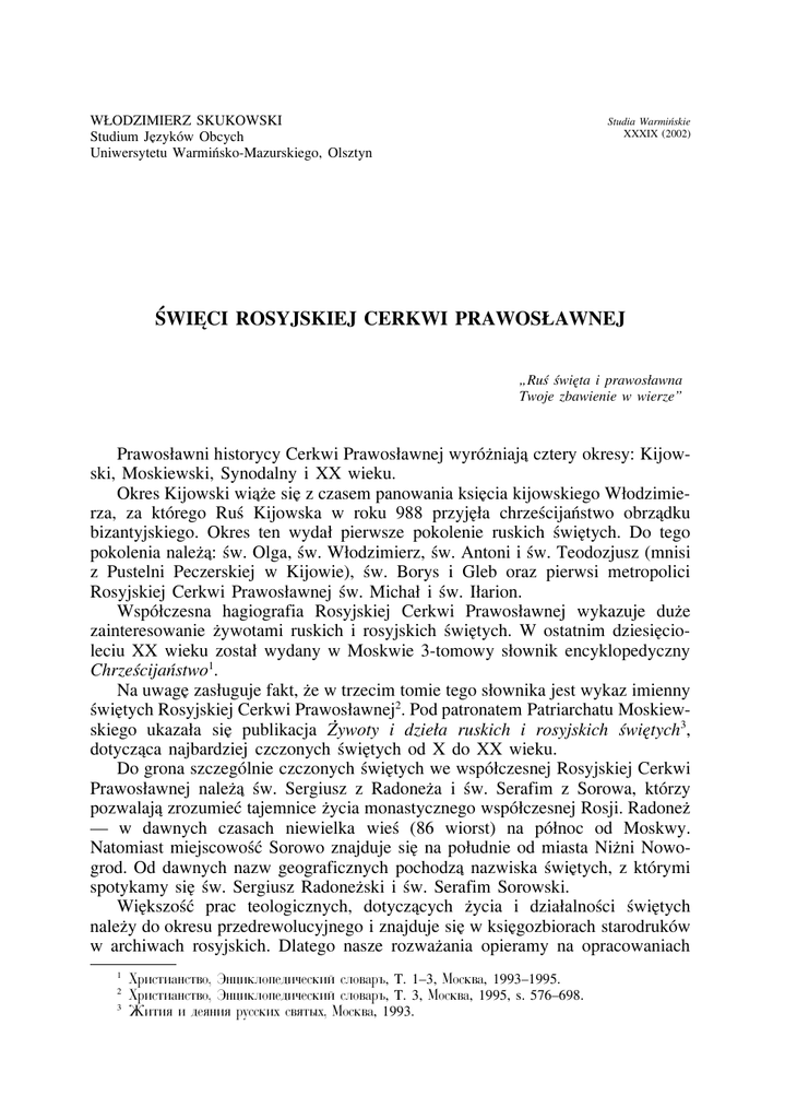 WŁODZIMIERZ SKUKOWSKI Studium Jezyków Obcych Uniwersytetu Warmińsko-Mazurskiego, Olsztyn Studia Warmińskie XXXIX (2002) ŚWIECI ROSYJSKIEJ CERKWI PRAWOSŁAWNEJ „Ruś świeta i prawosławna Twoje zbawienie w wierze” Prawosławni historycy Cerkwi Prawosławnej wyróz niaja cztery okresy: Kijowski, Moskiewski, Synodalny i XX wieku. Okres Kijowski wiaz e sie z czasem panowania ksiecia kijowskiego Włodzimierza, za którego Ruś Kijowska w roku 988 przyjeła chrześcijaństwo obrzadku bizantyjskiego. Okres ten wydał pierwsze pokolenie ruskich świetych. Do tego pokolenia nalez a: św. Olga, św. Włodzimierz, św. Antoni i św. Teodozjusz (mnisi z Pustelni Peczerskiej w Kijowie), św. Borys i Gleb oraz pierwsi metropolici Rosyjskiej Cerkwi Prawosławnej św. Michał i św. Iłarion. Współczesna hagiografia Rosyjskiej Cerkwi Prawosławnej wykazuje duz e zainteresowanie z ywotami ruskich i rosyjskich świetych. W ostatnim dziesiecioleciu XX wieku został wydany w Moskwie 3-tomowy słownik encyklopedyczny Chrześcijaństwo1. Na uwage zasługuje fakt, z e w trzecim tomie tego słownika jest wykaz imienny świetych Rosyjskiej Cerkwi Prawosławnej2. Pod patronatem Patriarchatu Moskiewskiego ukazała sie publikacja Zywoty i dzieła ruskich i rosyjskich świetych3, dotyczaca najbardziej czczonych świetych od X do XX wieku. Do grona szczególnie czczonych świetych we współczesnej Rosyjskiej Cerkwi Prawosławnej nalez a św. Sergiusz z Radonez a i św. Serafim z Sorowa, którzy pozwalaja zrozumieć tajemnice z ycia monastycznego współczesnej Rosji. Radonez — w dawnych czasach niewielka wieś (86 wiorst) na północ od Moskwy. Natomiast miejscowość Sorowo znajduje sie na południe od miasta Niz ni Nowogrod. Od dawnych nazw geograficznych pochodza nazwiska świetych, z którymi spotykamy sie św. Sergiusz Radonez ski i św. Serafim Sorowski. Wiekszość prac teologicznych, dotyczacych z ycia i działalności świetych nalez y do okresu przedrewolucyjnego i znajduje sie w ksiegozbiorach starodruków w archiwach rosyjskich. Dlatego nasze rozwaz ania opieramy na opracowaniach 1 2 3 ⌫������������ ����������������� �������, T. 1–3, ������, 1993–1995. ⌫������������ ����������������� �������, T. 3, ������, 1995, s. 576–698. ����� � ������ ������� ������� ������, 1993. 496 WŁODZIMIERZ SKUKOWSKI polskich, wydanych w roku 1999. Pierwsza publikacja pod tytułem Anioł na ziemi — zycie świetego Sergiusza z Radoneza autorstwa Jarosława Charkiewicza4. Natomiast drugie opracowanie Świety Serafim Sorowski5 jest dziełem zespołu autorów. Autorzy tych opracowań nalez a do Polskiego Autokefalicznego Kościoła Prawosławnego. Te opracowania zawieraja ogromny materiał faktograficzny, dotyczacy z ycia ruskich świetych mnichów. Dlatego nasza uwage kierujemy na zasadnicze momenty ich ziemskiego pielgrzymowania, pozostawiajac głebsze refleksje teologom. A I. ŚW. SERGIUSZ Z RADONEZ Św. Sergiusz z Radonez a z ył w latach 1314–1392. Jest to okres Rusi Moskiewskiej. W tym czasie stolica metropolitalna zostaje najpierw miasto Włodzimierz (200 km na wschód od Moskwy), a później Moskwa. Po zwyciestwie nad Tatarami, na Kulikowym Polu w roku 1380, Rosyjska Cerkiew Prawosławna uzyskała prawo powołania samodzielnego Patriarchatu Moskiewskiego (decyzja Konstatynopola). W takich warunkach historycznych tworzył działo św. Sergiusz z Radonez a. Św. Sergiusz z Radonez a urodził sie w zamoz nej rodzinie bojarskiej na terenie Ksiestwa Rostowskiego. Na chrzcie otrzymał imie ewangeliczne Bartłomiej. Rodzice Maryja i Cyryl byli ludźmi wyjatkowej poboz ności. Pragnieniem ich z ycia było, az eby ich syn Bartłomiej został powołany do słuz by Boz ej6. Świetość ich spowodowała, iz w roku 1995 Rosyjska Cerkiew Prawosławna zaliczyła ich do grona świetych. Nastepuje okres kształtowania osobowości przyszłego świetego w procesie kształcenia. Uczył sie w szkole cerkiewnej pod patronatem biskupa miasta Rostowa. W tym czasie doszło do spotkania młodego Bartłomieja ze starcem — mnichem. Od tego momentu obserwujemy jego zainteresowanie literatura o treści religijnej, a takz e tajemnicami z ycia mniszego (modlitwa i posty). W stosunku do innych był serdeczny i uprzejmy, dzielił sie ze wszystkimi co posiadał. W sercu młodzieńca zrodziło sie w końcu pragnienie z ycia mniszego7. Po upadku Ksiestwa Rostowskiego rodzina przeprowadziła sie i zamieszkała we wsi Radonez , która znajdowała sie wśród lasów. Rodzina Bartłomieja zamieszkała w pobliz u cerkwi Boz ego Narodzenia8. U schyłku z ycia rodzice Bartłomieja złoz yli śluby zakonne. Po ich śmierci ich syn odprawił 40-dniowe naboz eństwo za zmarłych rodziców. W roku 1337 w gestwinie borów podmoskiewskiej wsi zbudował kapliczke, która została ycie świetego Sergiusza z Radoneza, Hajnówka 1999. J. C h a r k i e w i c z, Anioł na ziemi — Z H. G a b r i e l (Hagioryta), M. J a k i m i u k, J. M i s i e j u k, Świety Serafim Sorowski — z ywot i pouczenia, Hajnówka 1999. 6 J. C h a r k i e w i c z, jw., s. 8–9. 7 Tamz e, s. 10–16. 8 Tamz e, s. 7–20. 4 5 ŚWIECI ROSYJSKIEJ CERKWI PRAWOSŁAWNEJ 497 poświecona Świetej Trójcy. Ten rok uwaz any jest za czas załoz enia ławry Troicko-Siergiejewskiej. To była pustelnia — miejsce modlitwy i postu. Tam w wieku 23 lat złoz ył śluby zakonne. Nadano mu nowe imie Sergiusz. W działalności mniszej kierował sie nauka Ojców Kościoła, a szczególnie świetego Bazylego Wielkiego9. Okres budowy pustelni św. Trójcy był w z yciu św. Sergiusza czasem nieustannej modlitwy i wytez onej pracy fizycznej. Po przyjeciu świeceń kapłańskich został przeorem tej pustelni10. Wraz z innymi mnichami podjał z ycie w pełni ascetyc