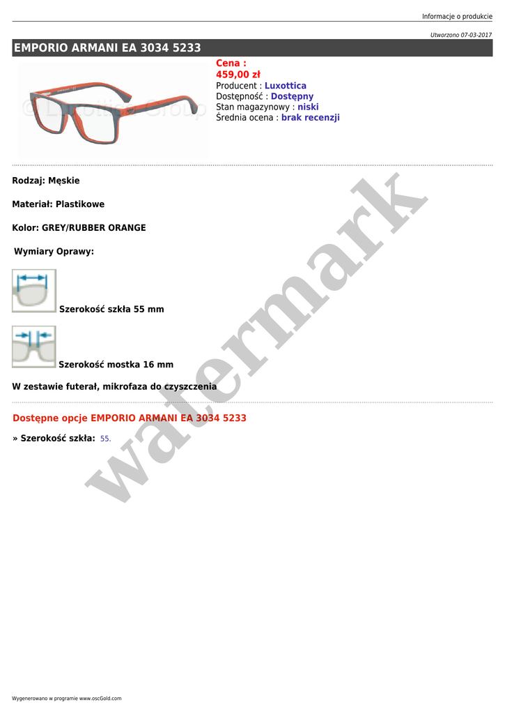 Informacje o produkcie Utworzono 07-03-2017 EMPORIO ARMANI EA 3034 5233 Cena : 459,00 zł Producent : Luxottica Dostępność : Dostępny Stan magazynowy : niski Średnia ocena : brak recenzji Materiał: Plastikowe er m ar k Rodzaj: Męskie Kolor: GREY/RUBBER ORANGE Wymiary Oprawy: Szerokość szkła 55 mm Szerokość mostka 16 mm at W zestawie futerał, mikrofaza do czyszczenia Dostępne opcje EMPORIO ARMANI EA 3034 5233 w » Szerokość szkła: 55. Wygenerowano w programie www.oscGold.com