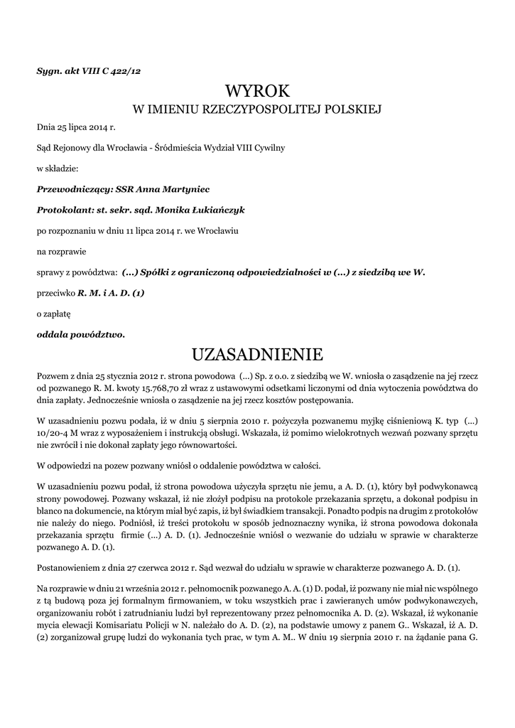 Sygn. akt VIII C 422/12 WYROK W IMIENIU RZECZYPOSPOLITEJ POLSKIEJ Dnia 25 lipca 2014 r. Sąd Rejonowy dla Wrocławia - Śródmieścia Wydział VIII Cywilny w składzie: Przewodniczący: SSR Anna Martyniec Protokolant: st. sekr. sąd. Monika Łukiańczyk po rozpoznaniu w dniu 11 lipca 2014 r. we Wrocławiu na rozprawie sprawy z powództwa: (...) Spółki z ograniczoną odpowiedzialności w (...) z siedzibą we W. przeciwko R. M. i A. D. (1) o zapłatę oddala powództwo. UZASADNIENIE Pozwem z dnia 25 stycznia 2012 r. strona powodowa (...) Sp. z o.o. z siedzibą we W. wniosła o zasądzenie na jej rzecz od pozwanego R. M. kwoty 15.768,70 zł wraz z ustawowymi odsetkami liczonymi od dnia wytoczenia powództwa do dnia zapłaty. Jednocześnie wniosła o zasądzenie na jej rzecz kosztów postępowania. W uzasadnieniu pozwu podała, iż w dniu 5 sierpnia 2010 r. pożyczyła pozwanemu myjkę ciśnieniową K. typ (...) 10/20-4 M wraz z wyposażeniem i instrukcją obsługi. Wskazała, iż pomimo wielokrotnych wezwań pozwany sprzętu nie zwrócił i nie dokonał zapłaty jego równowartości. W odpowiedzi na pozew pozwany wniósł o oddalenie powództwa w całości. W uzasadnieniu pozwu podał, iż strona powodowa użyczyła sprzętu nie jemu, a A. D. (1), który był podwykonawcą strony powodowej. Pozwany wskazał, iż nie złożył podpisu na protokole przekazania sprzętu, a dokonał podpisu in blanco na dokumencie, na którym miał być zapis, iż był świadkiem transakcji. Ponadto podpis na drugim z protokołów nie należy do niego. Podniósł, iż treści protokołu w sposób jednoznaczny wynika, iż strona powodowa dokonała przekazania sprzętu firmie (...) A. D. (1). Jednocześnie wniósł o wezwanie do udziału w sprawie w charakterze pozwanego A. D. (1). Postanowieniem z dnia 27 czerwca 2012 r. Sąd wezwał do udziału w sprawie w charakterze pozwanego A. D. (1). Na rozprawie w dniu 21 września 2012 r. pełnomocnik pozwanego A. A. (1) D. podał, iż pozwany nie miał nic wspólnego z tą budową poza jej formalnym firmowaniem, w toku wszystkich prac i zawieranych umów podwykonawczych, organizowaniu robót i zatrudnianiu ludzi był reprezentowany przez pełnomocnika A. D. (2). Wskazał, iż wykonanie mycia elewacji Komisariatu Policji w N. należało do A. D. (2), na podstawie umowy z panem G.. Wskazał, iż A. D. (2) zorganizował grupę ludzi do wykonania tych prac, w tym A. M.. W dniu 19 sierpnia 2010 r. na żądanie pana G. zrezygnował z zawartej umowy, a zatrudnieni przez niego ludzie przeszli pod zlecenie pana G.. Oni dysponowali myjką K. i wykonywali wiele miesięcy pracę na zlecenie pana G.. Sąd ustalił następujący stan faktyczny W dniu 20 lipca 2010 r. strona powodowa nabyła myjkę ciśnieniową K. typ (...) 10/20-4 M wraz z wyposażeniem za kwotę 15.768,70 zł. Dowód: • Faktura VAT (...) k. 7. W dniu 23 lipca 2010 r. strona powodowa zawarła z A. D. (1) umowę, na podstawie której A. D. (1) zobowiązał się do wykonania remontu elewacji z obróbkami blacharskimi na budynku komisariatu policji w N., a strona powodowa zobowiązała się do zapłaty kwoty 70.000 zł. Prace te miał wykonać podwykonawca A. A. (2) M. wraz z grupą pracowników. Do wykonania robót objętych umową konieczne było posiadanie myjki ciśnieniowej. Strona powodowa zobowiązała się ją dostarczyć. Dowód: • Umowa nr (...) wraz z załącznikiem k. 77-78; • Zeznania świadka A. D. (2) k. 105-106; • Zeznania świadka A. M. protokół elektroniczny k. 157-159. W dniu 23 lipca 2010 r. strona powodowa zawarła z A. D. (1) umowę, na podstawie której A. D. (1) zobowiązał się do zmiany pokrycia dachu o powierzchni 650 m2, a strona powodowa zobowiązała się do zapłaty kwoty 74.000 zł. Dowód: • Umowa nr (...) wraz z załącznikiem k. 82-83. W dniu 27 lipca 2010 r. strona powodowa zawarła z A. D. (1) umowę, na podstawie której A. D. (1) zobowiązał się do wykonania bruków kamiennych, regulacji studzienek, wymiany rury spustowej, ułożenia krawężników w obiekcie Komisariat Policji w N.. W dniu 19 sierpnia 2010 r. strona powodowa dokonała zapłaty z tytułu zawartej umowy kwoty 20.000 zł. Dowód: • Umowa nr (...) k. 80; • Kw nr (...) k. 81. W dniu 5 sierpnia 2010 r. na teren budowy myjka została przywieziona przez syna R. P. M.. Myjka została odebrana przez T. M., a następnie przez A. M. i podłączona do prądu i wody. Przy odbiorze myjki T. M. podpisał protokół przekazania sprzętu o następującej treści: „W dniu 5 sierpnia 2010 r. został przekazany do użytkowania przez Firmę (...) A. D. (1) na czas wykonywania prac przy remoncie elewacji Komisariatu Policji w N. n/w sprzęt, będący własnością – (...) Sp. z o.o. we W., ul. (...): 1. myjka ciśnieniowa K. typ (...)-4 M wraz z wyposażeniem i instrukcją obsługi, 2. wąż zapasowy zbrojnego 30 m, 3. lanca dodatkowa – 1 szt., 4. wąż do piaskowania – 1 szt. Użyczony sprzęt jest nowy i sprawny technicznie – wartość przekazanego sprzętu wynosi 15.768,70 zł. Przyjmujący do użytkowania zobowiązuje się do zwrotu sprzętu w stanie nie pogorszonym i sprawnym technicznie wraz z kompletnym wyposażeniem, bezpośrednio po zakończeniu wykonywanych prac przy remoncie elewacji Komisariatu w N..”. T. M. przed złożeniem podpisu dopisał adnotację: „Sprzęt jest nowy. Będzie używany do czyszczenia elewacji, więc ulegnie zużyciu.” Dowód: • Protokół przekazania sprzętu k. 8. • Zeznania Świadka P. M. protokół elektroniczny k. 155-157; • Zeznania świadka A. M. protokół elektroniczny k. 157-159; • Zeznania świadka T. M. protokół elektroniczny k.276. W dniu 18 sierpnia 2010 r. strona powodowa zawarła bezpośrednio z A. M. umowę, na podstawie której A. M. zobowiązał się do wykonania prac związanych z remontem elewacji budynku Komisariatu Policji w N. oraz ogrodzenia murowanego Dowód: • Umowa nr (...) k. 95. W dniu 19 sierpnia 2010 r. A. D. (2) oraz stron